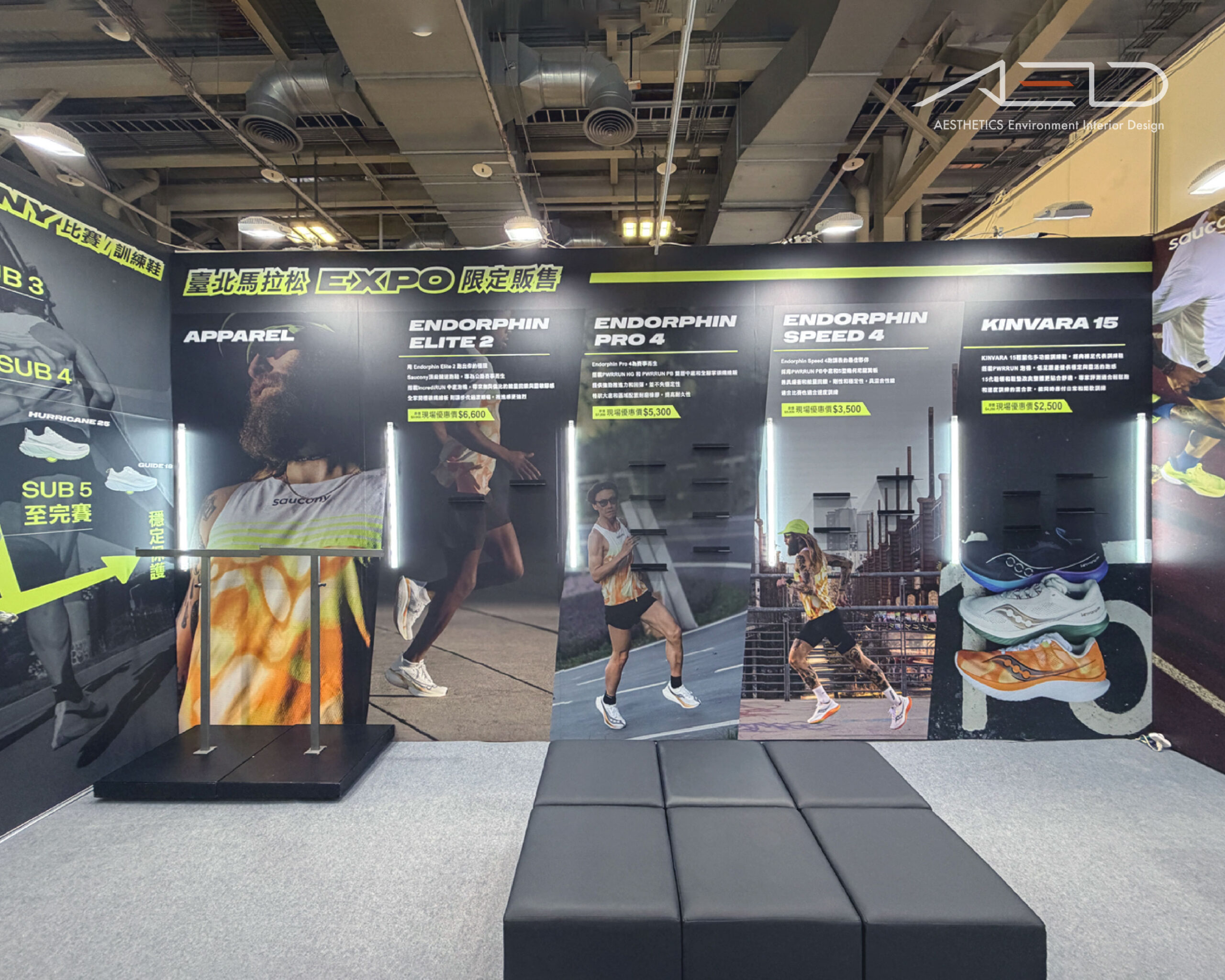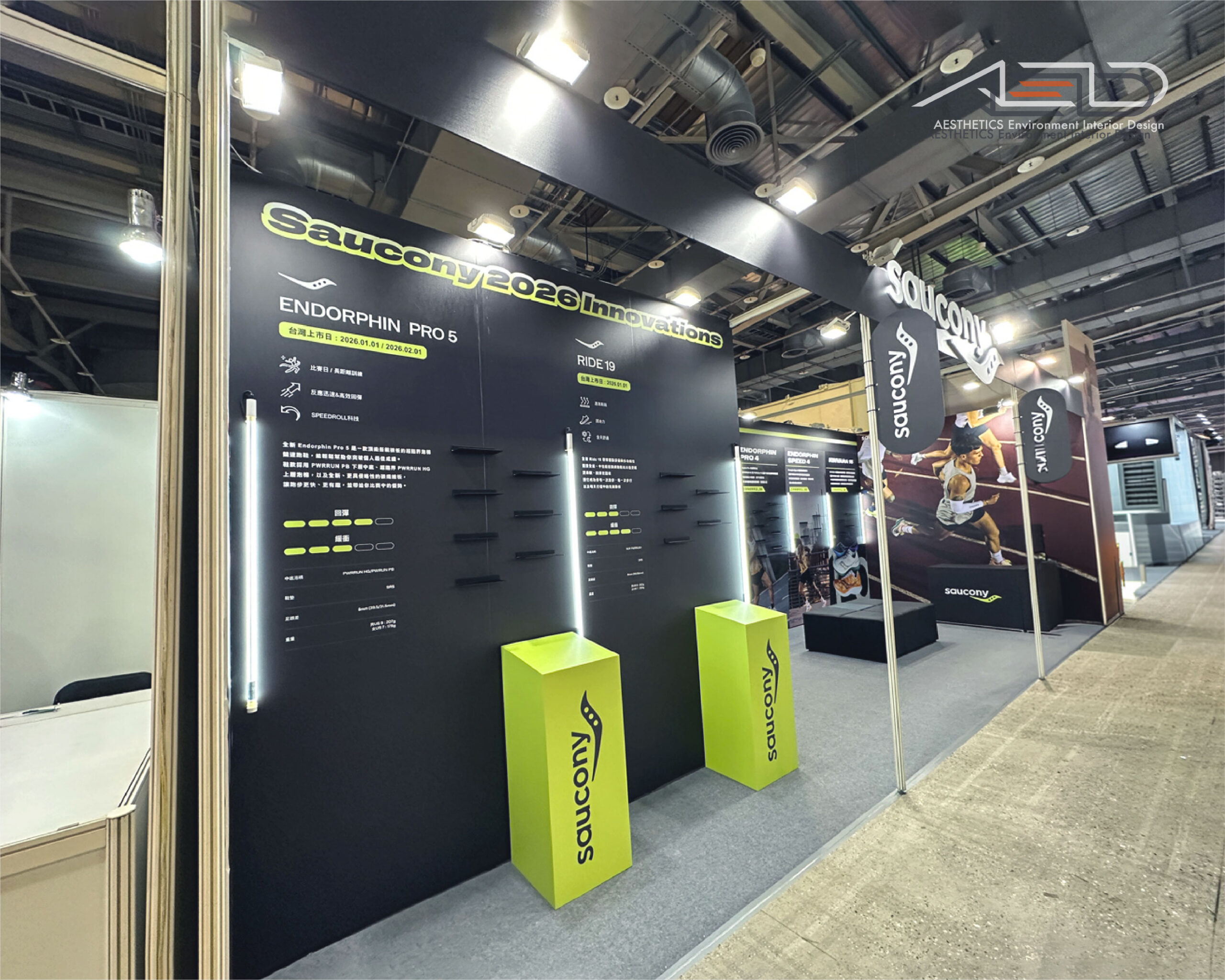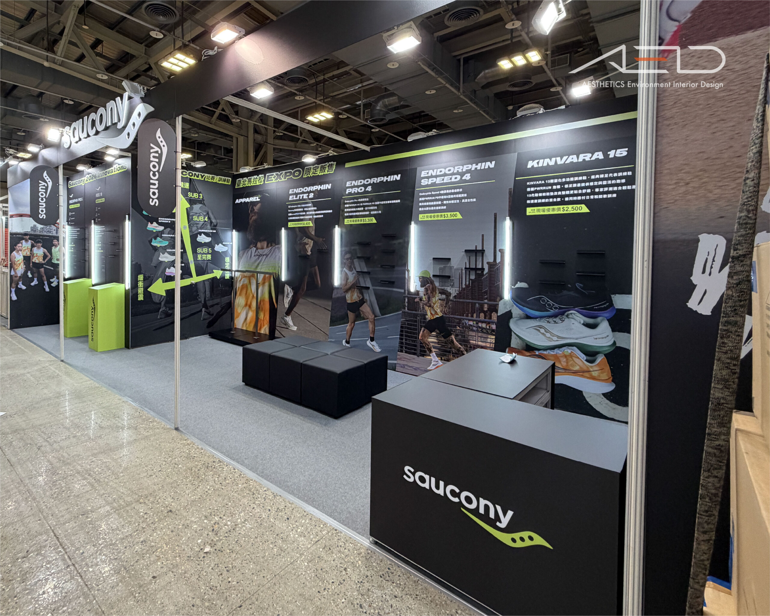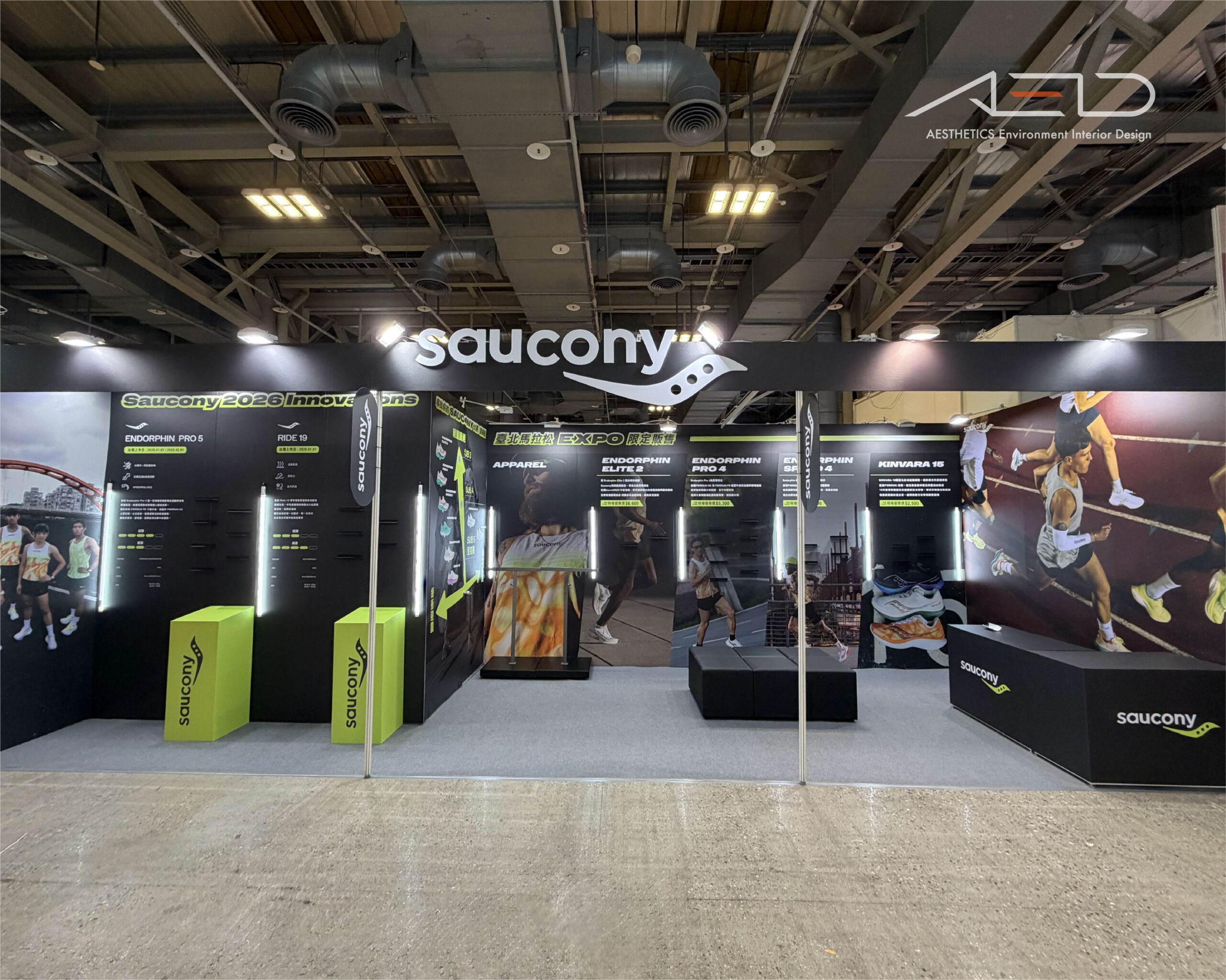 A brand exhibition booth was created for SAUCONY at the 2025 Taipei Marathon Expo, centered on performance running and product innovation, establishing a clear and dynamic brand circulation.