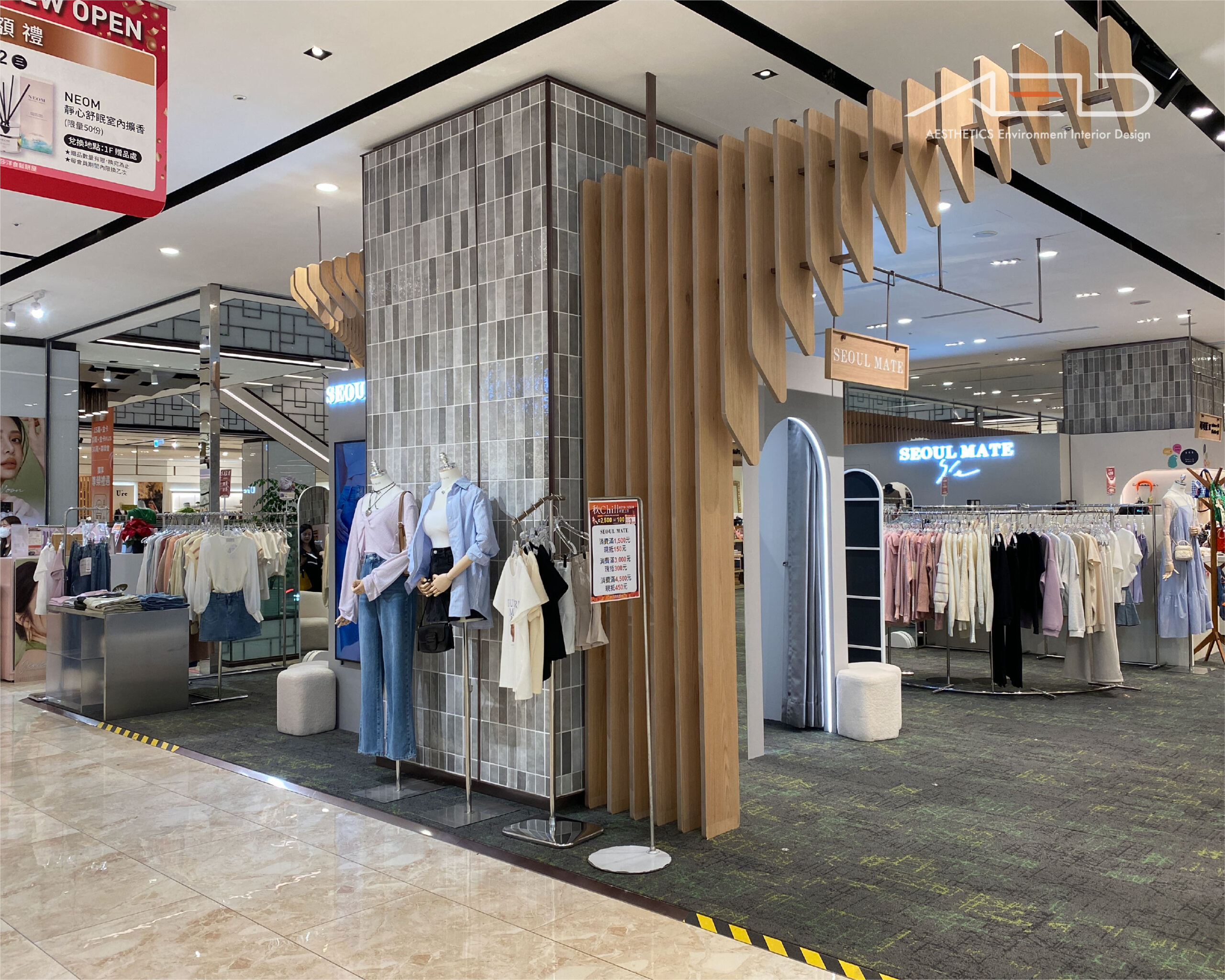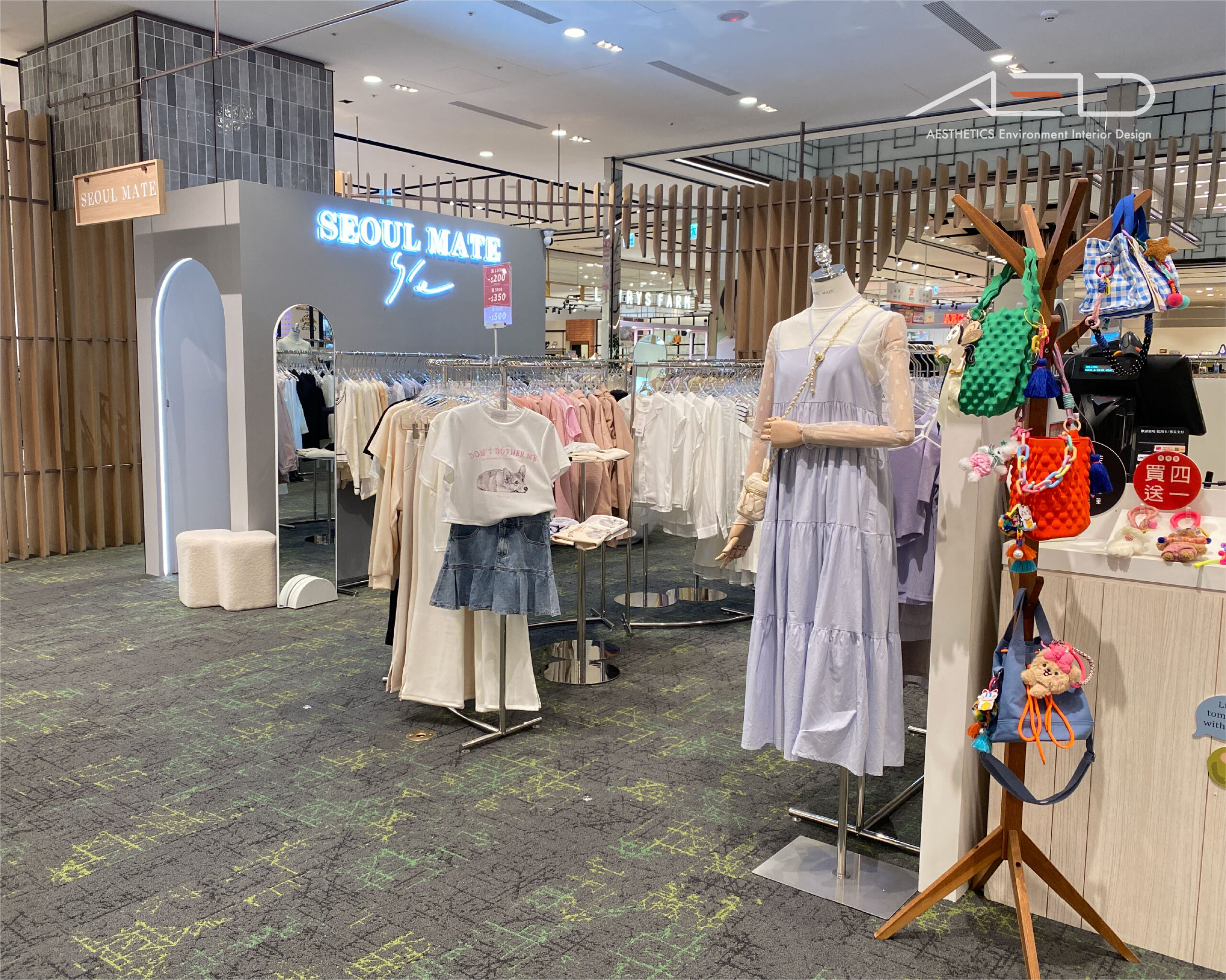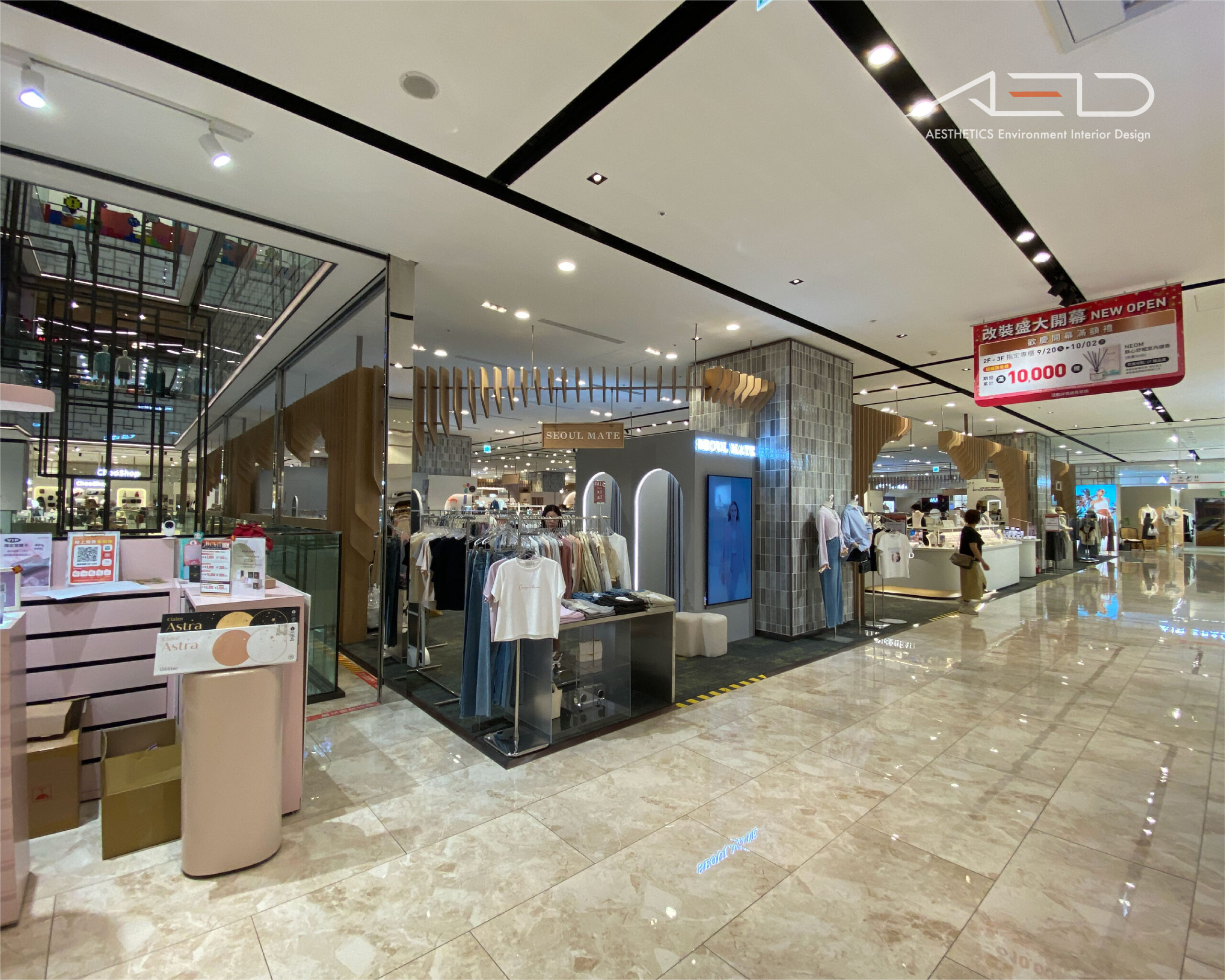 店櫃以開放式界面融入百貨公共動線,通透的視線使商品展示自然向外延伸,形成輕盈且具有吸引力的品牌入口,懸掛式 LOGO 品牌識別清晰呈現 SEOUL MATE 的品牌形象,強化空間中的視覺辨識。