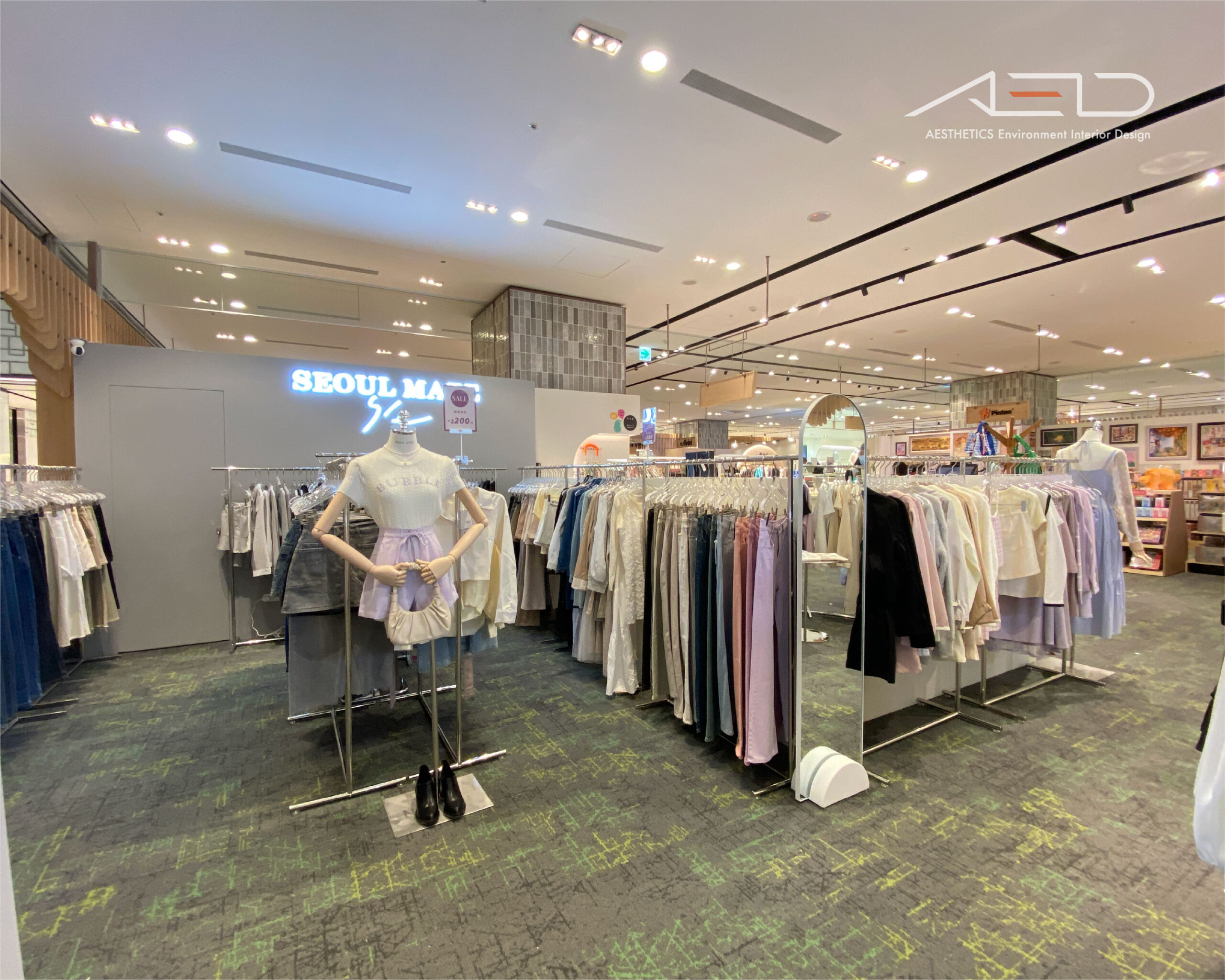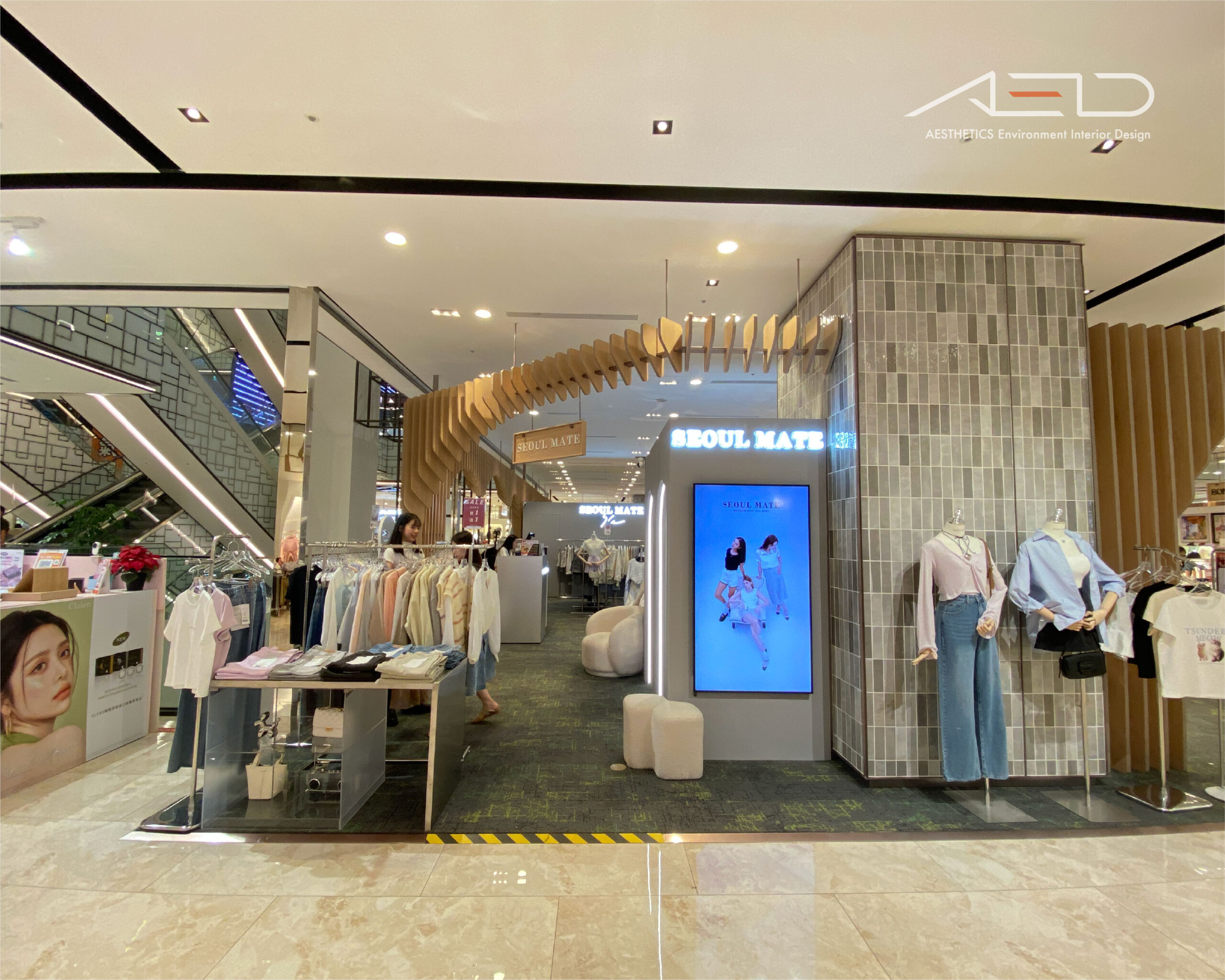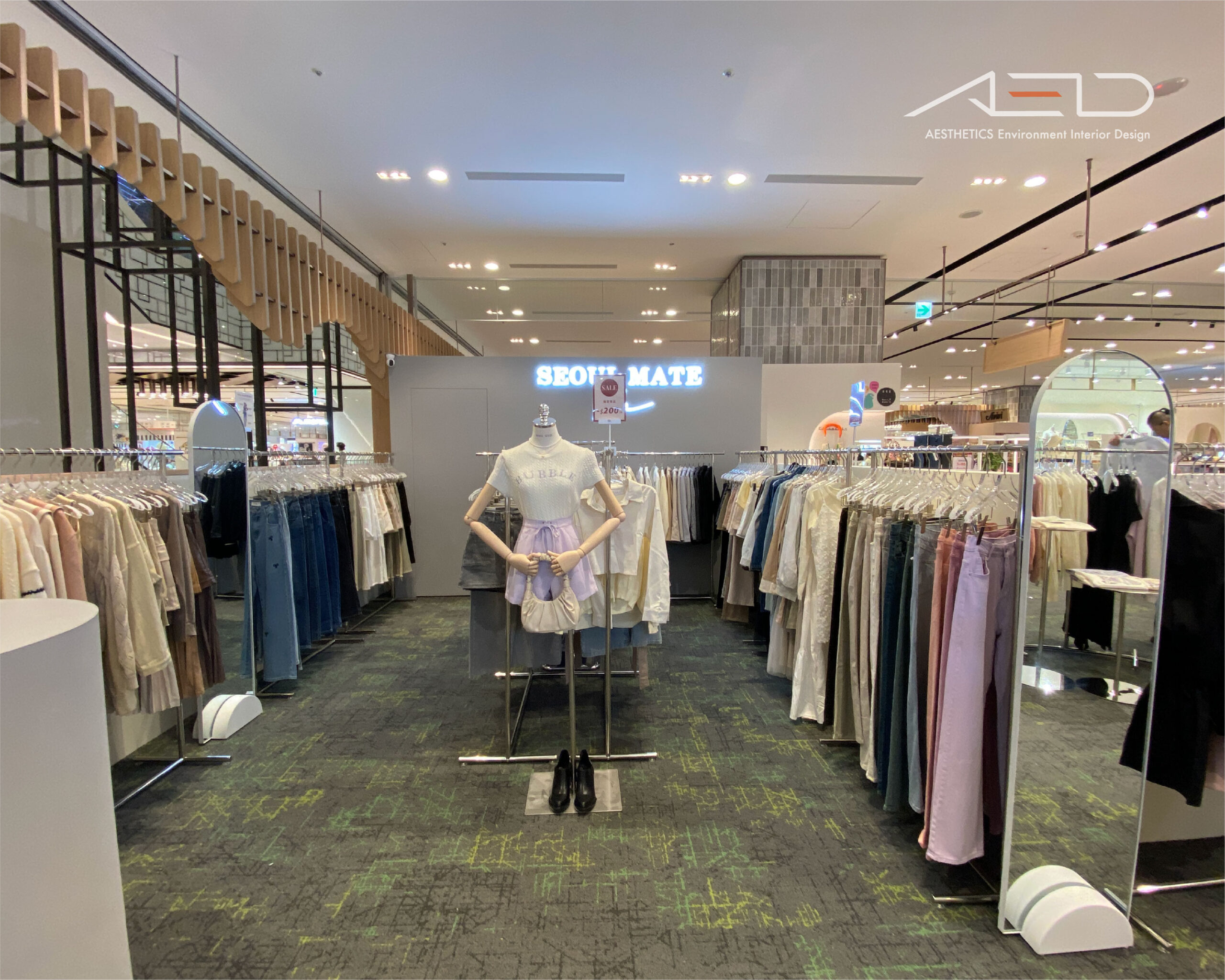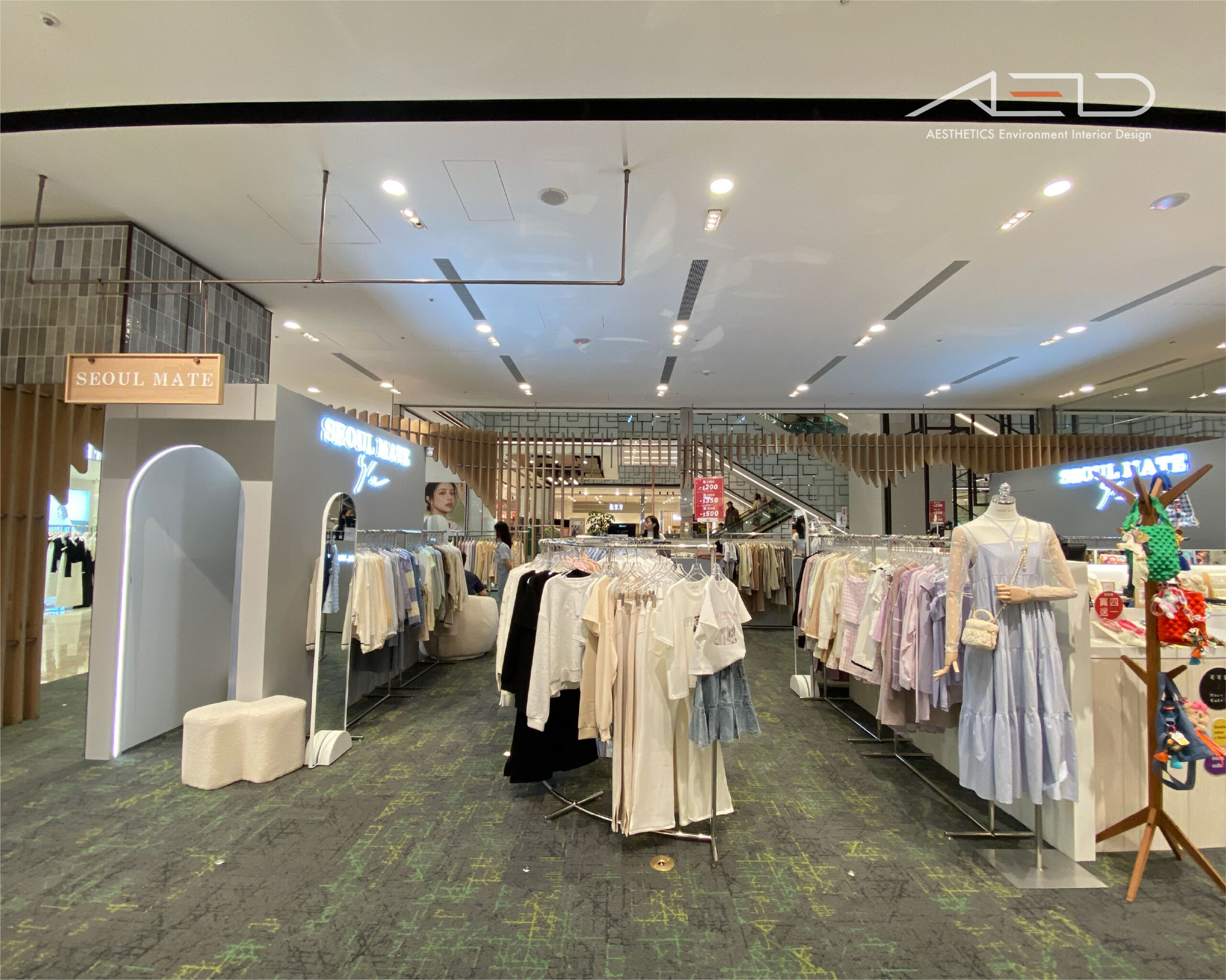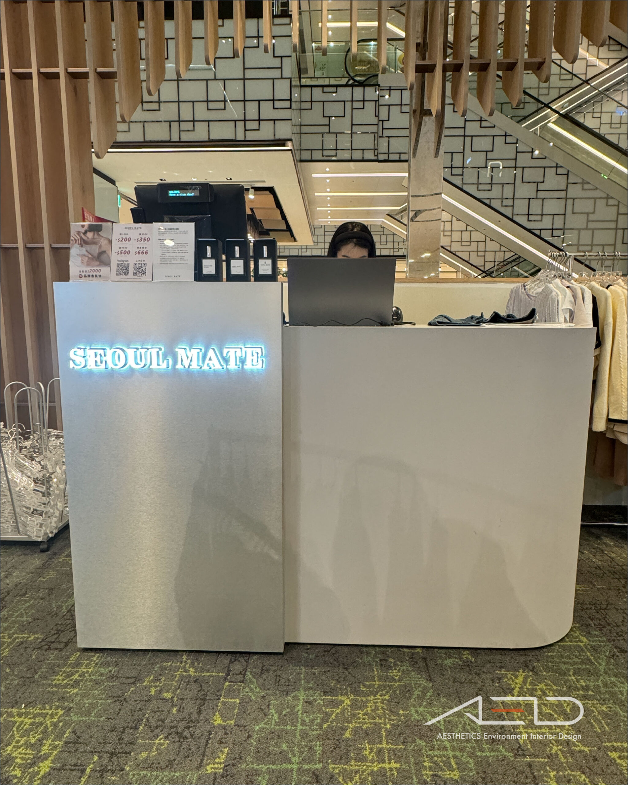 The store adopts an open retail interface that integrates with the department store circulation, transparent sightlines allow merchandise displays to extend outward, creating a light and inviting storefront presence. Suspended logo signage clearly presents the identity of SEOUL MATE and strengthens the brand’s visual recognition within the space.