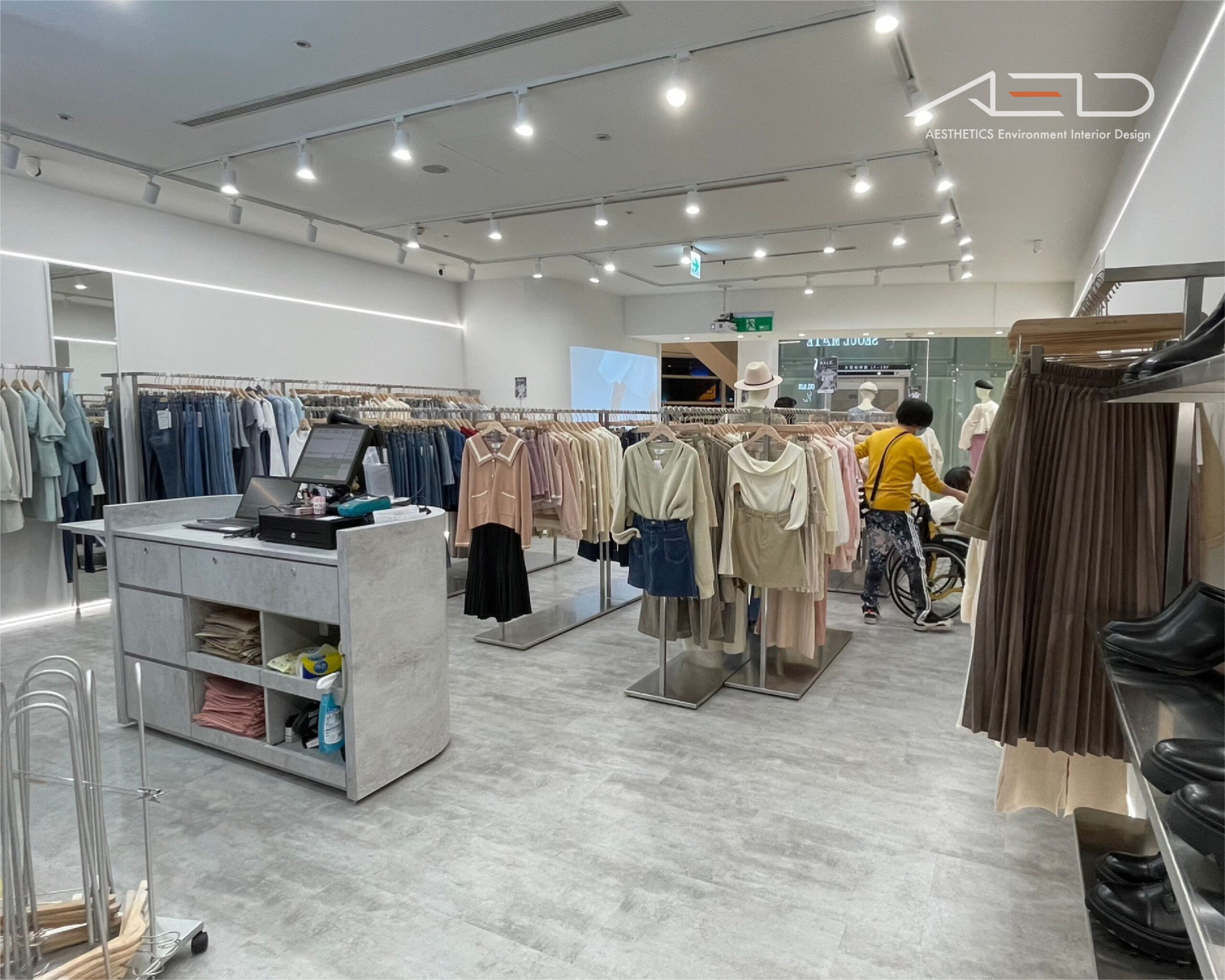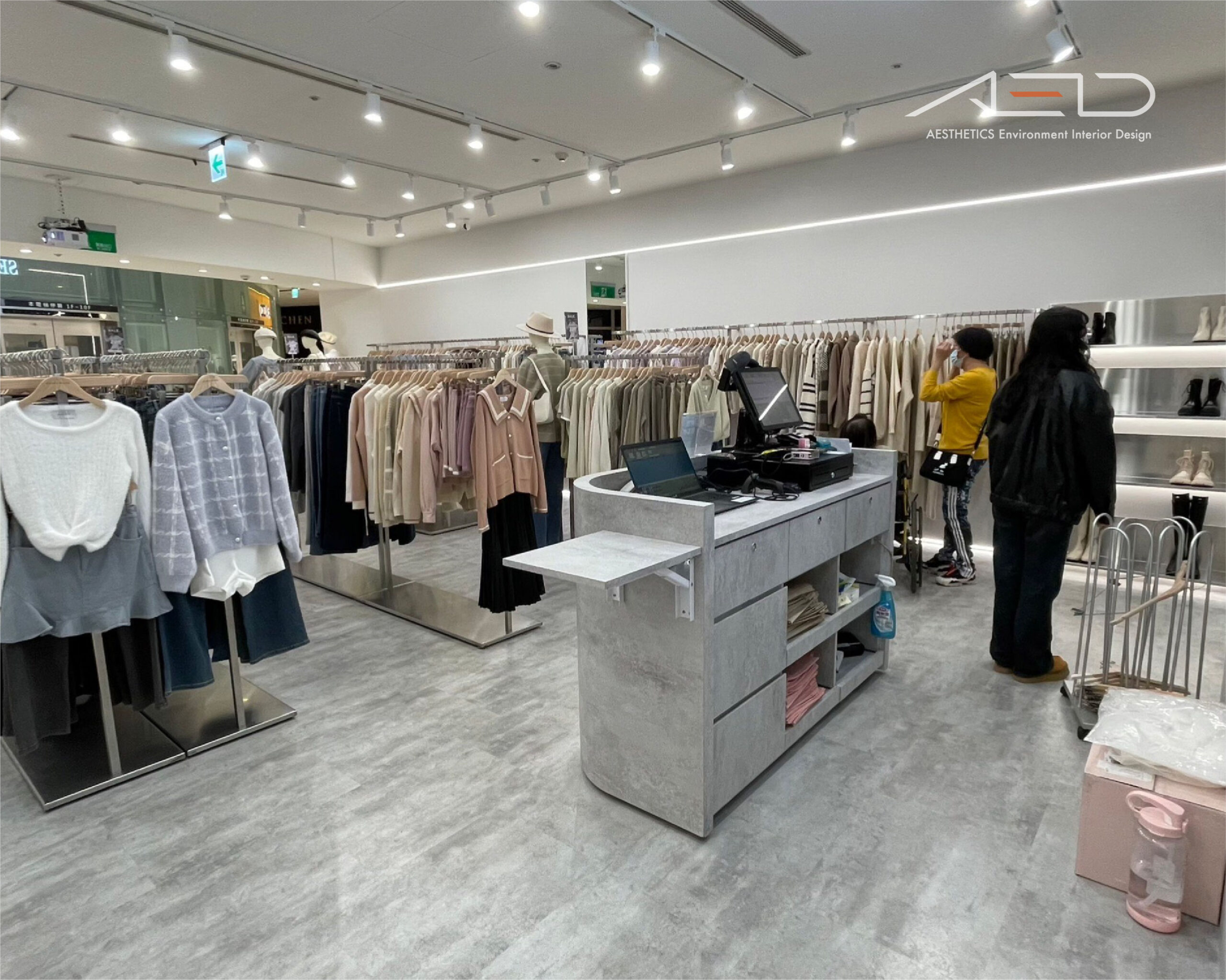 室內透過中央展示中島與環形商品動線組織空間節奏。不鏽鋼展示架與雙層吊掛系統構成主要陳列架構,搭配模特展示台與造型展示架,使服飾搭配形成清晰且有序的視覺序列。周邊壁面整合長型吊掛軌道與 LED 線性燈光,營造輕盈而富有秩序感的展示界面。