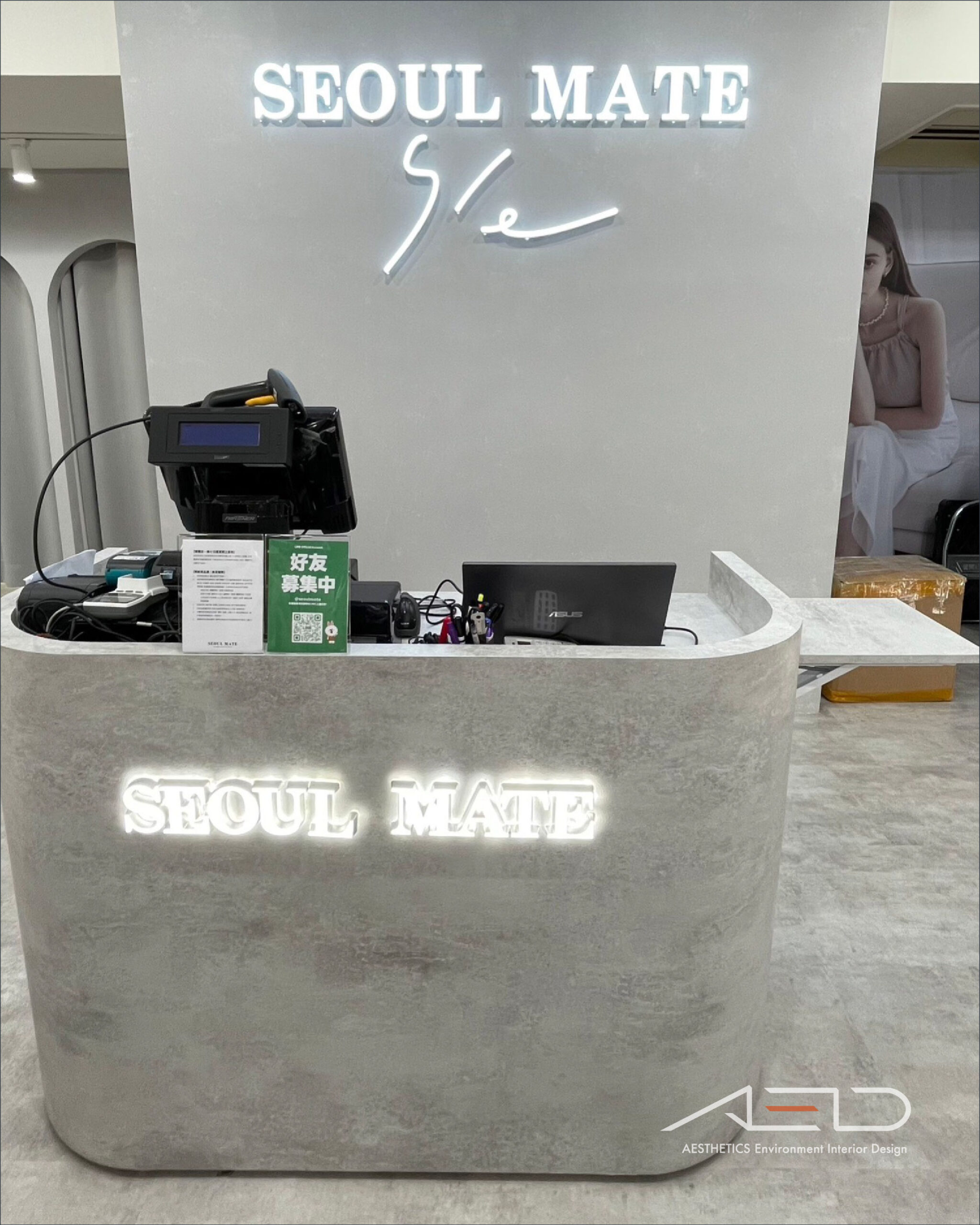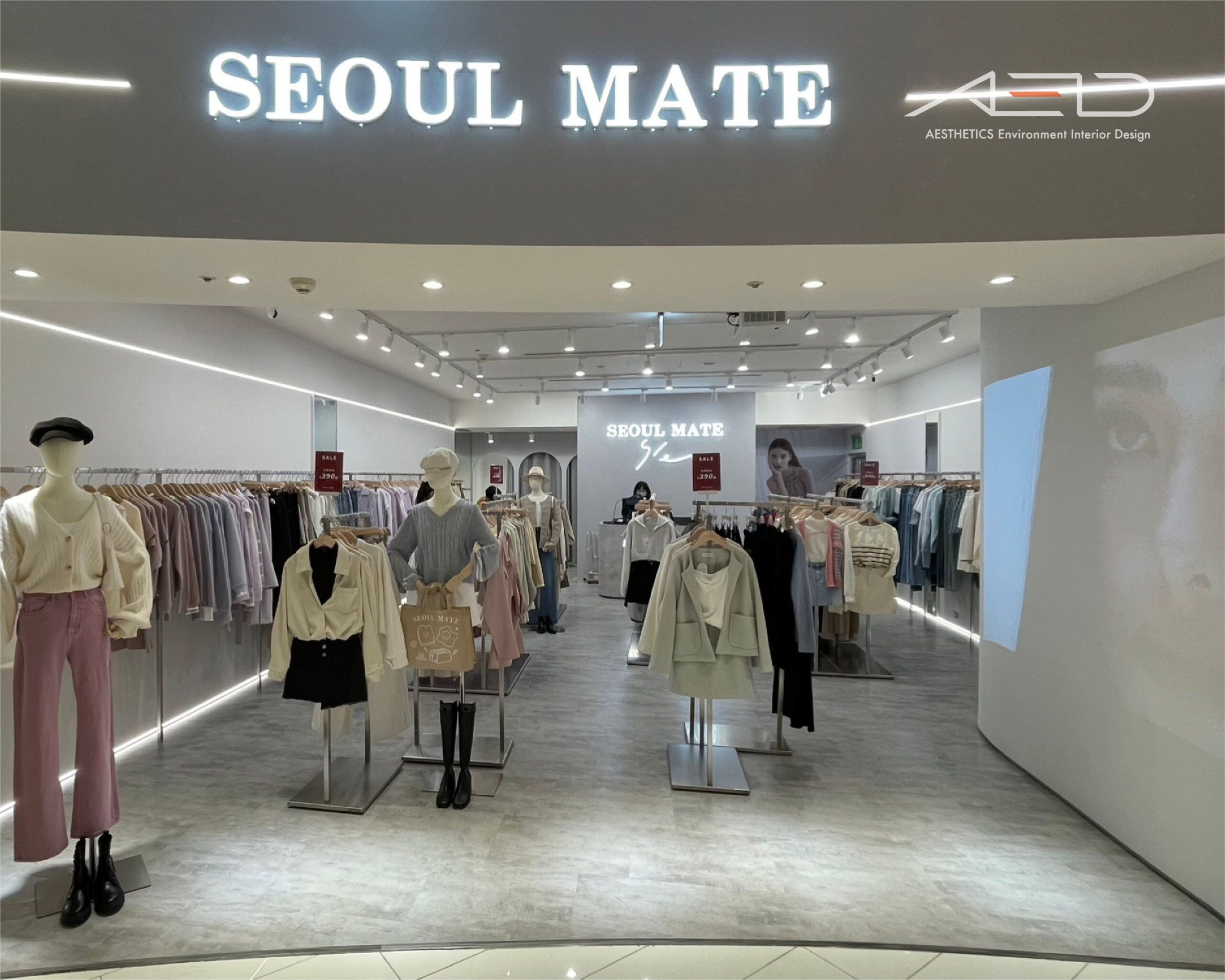 弧形立面結合 LED 品牌識別與線性燈光框構,形成鮮明且優雅的入口形象,使 SEOUL MATE 的時尚風格在百貨動線中被清晰呈現。