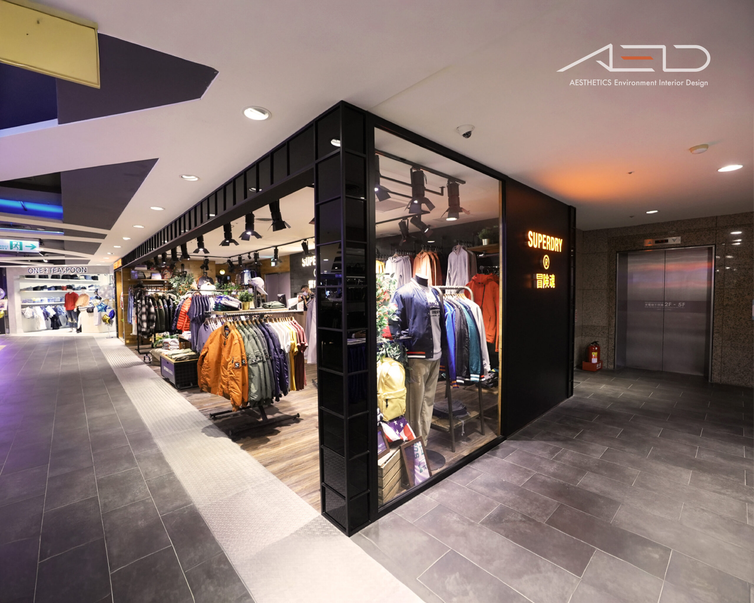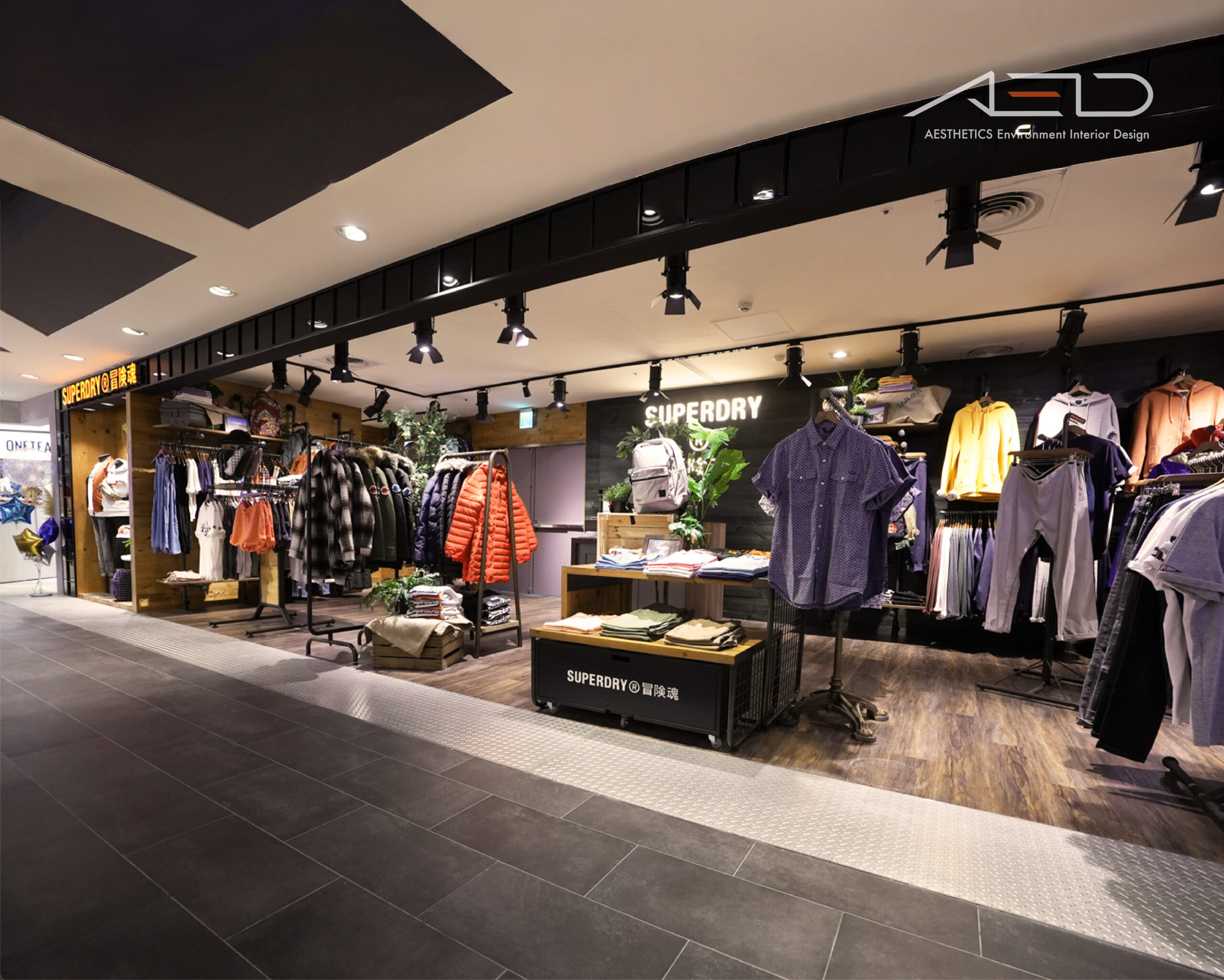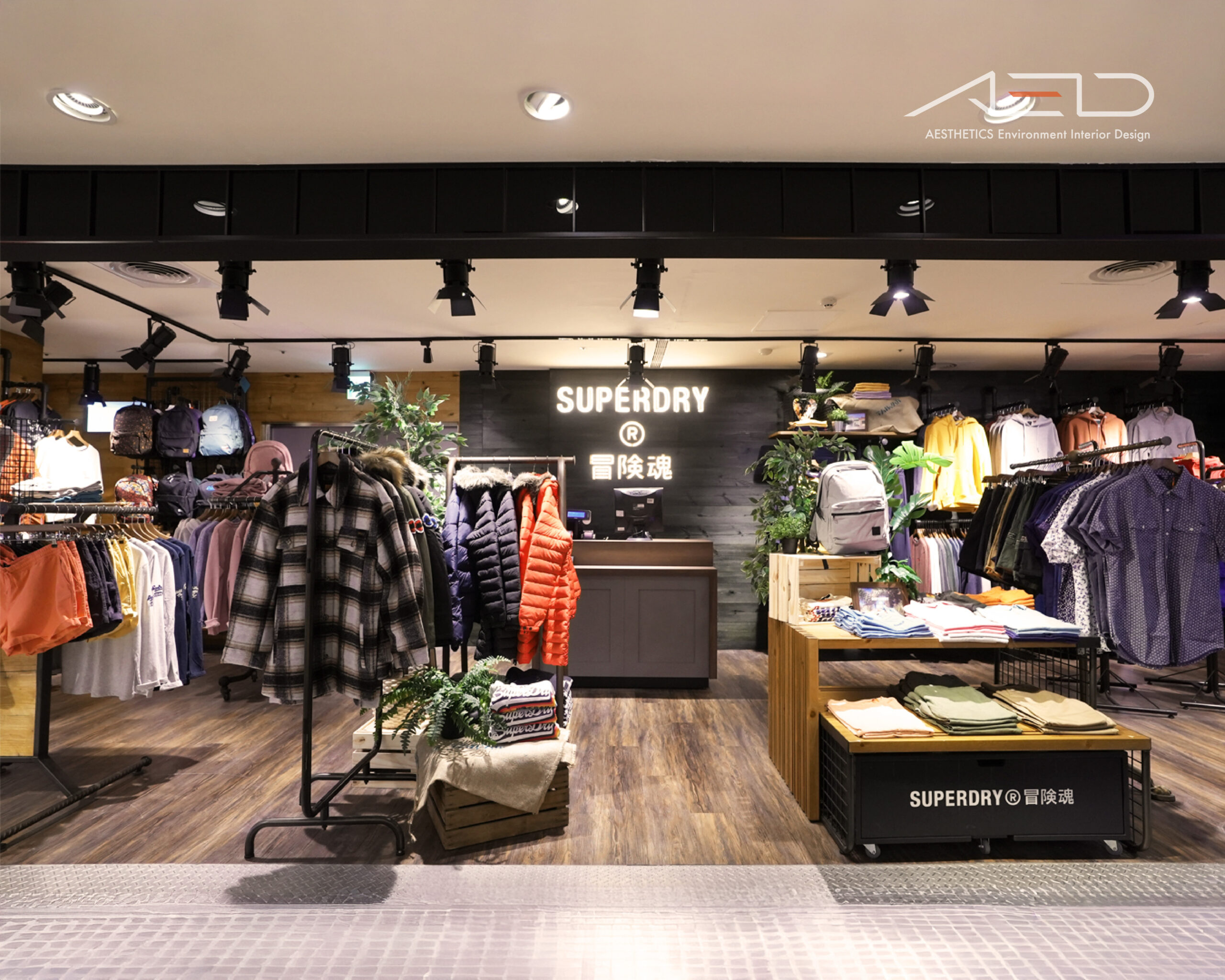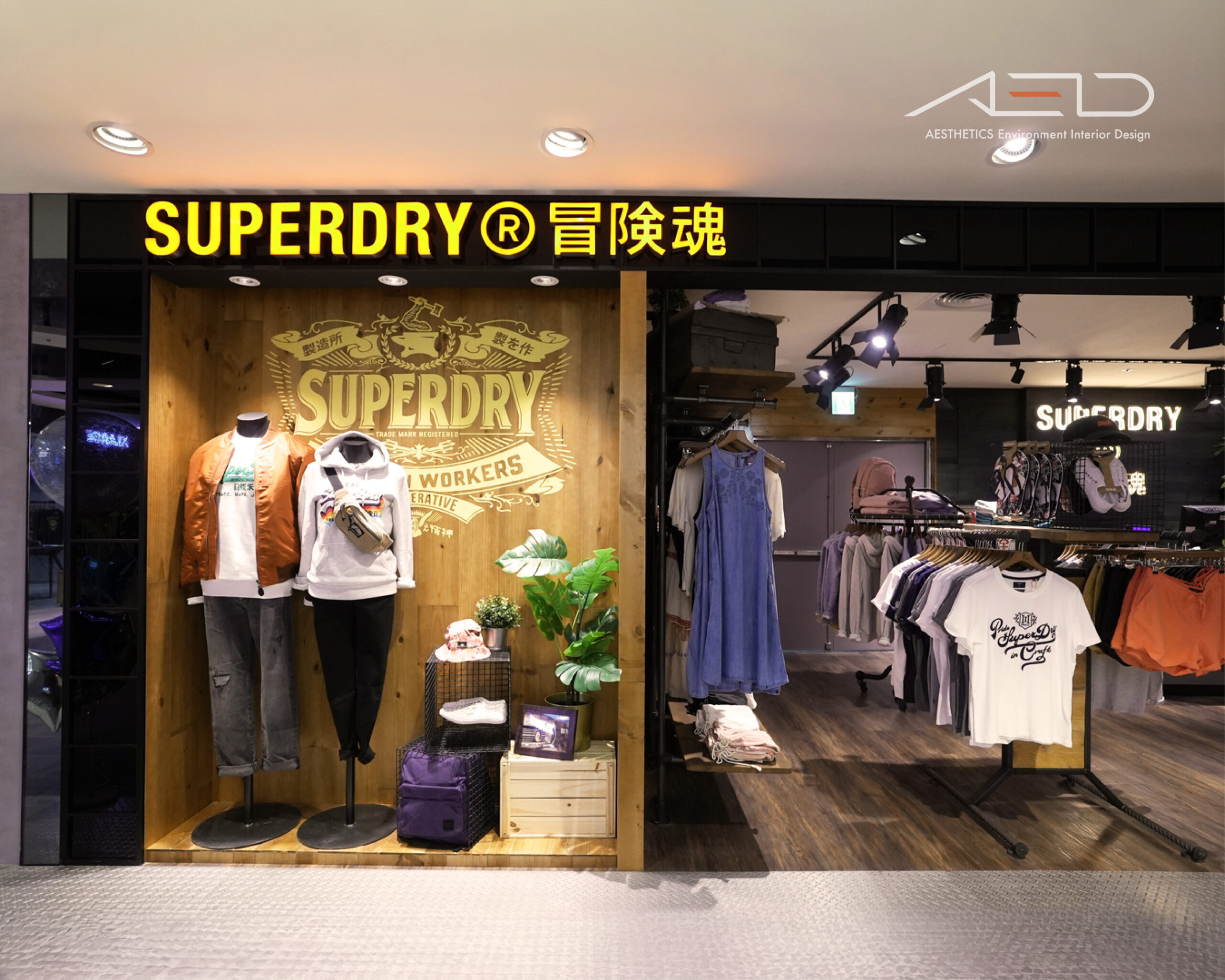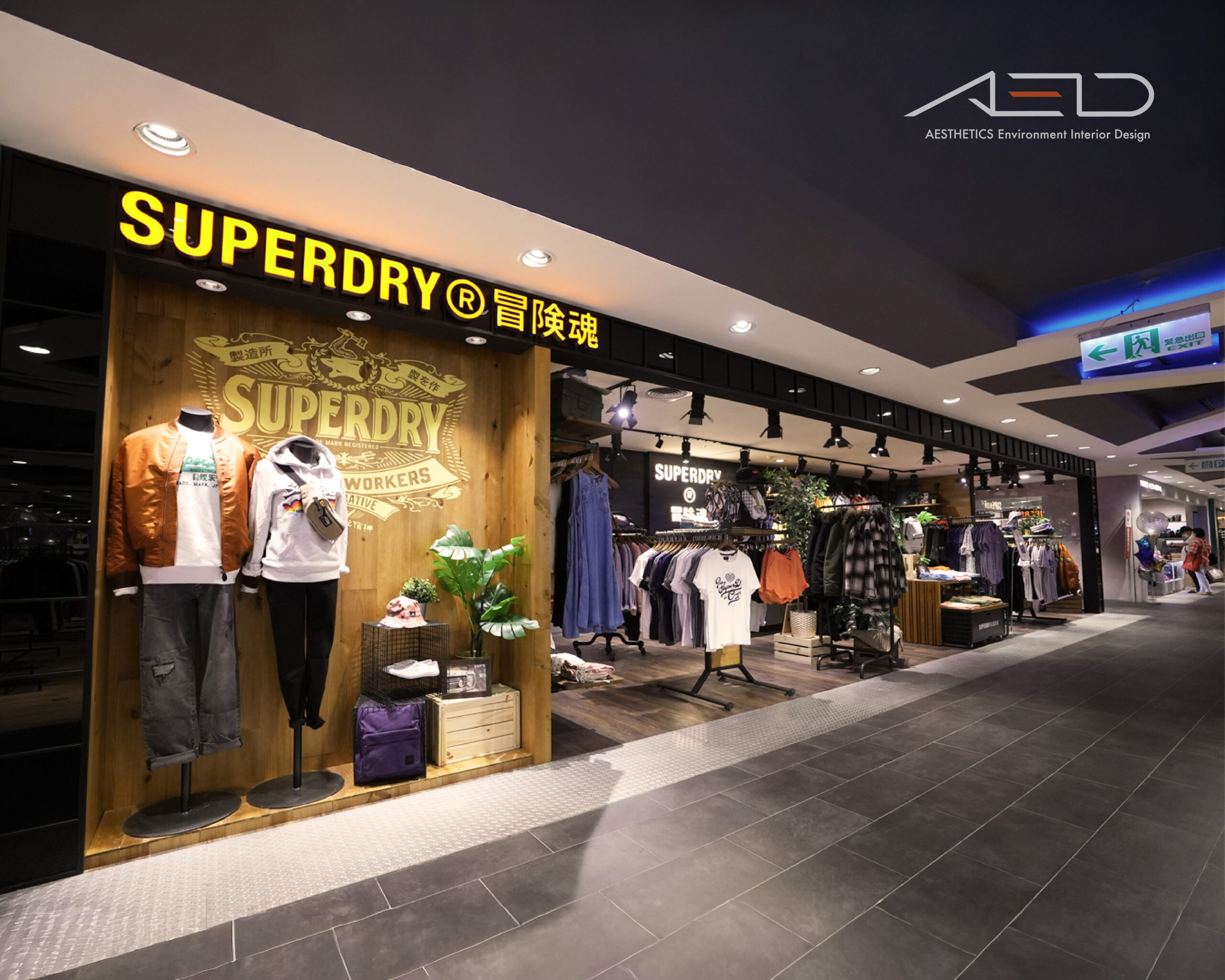 木質紋理與黑色門楣結構交織,展現 SUPERDRY 獨有的街頭文化與英倫風格。