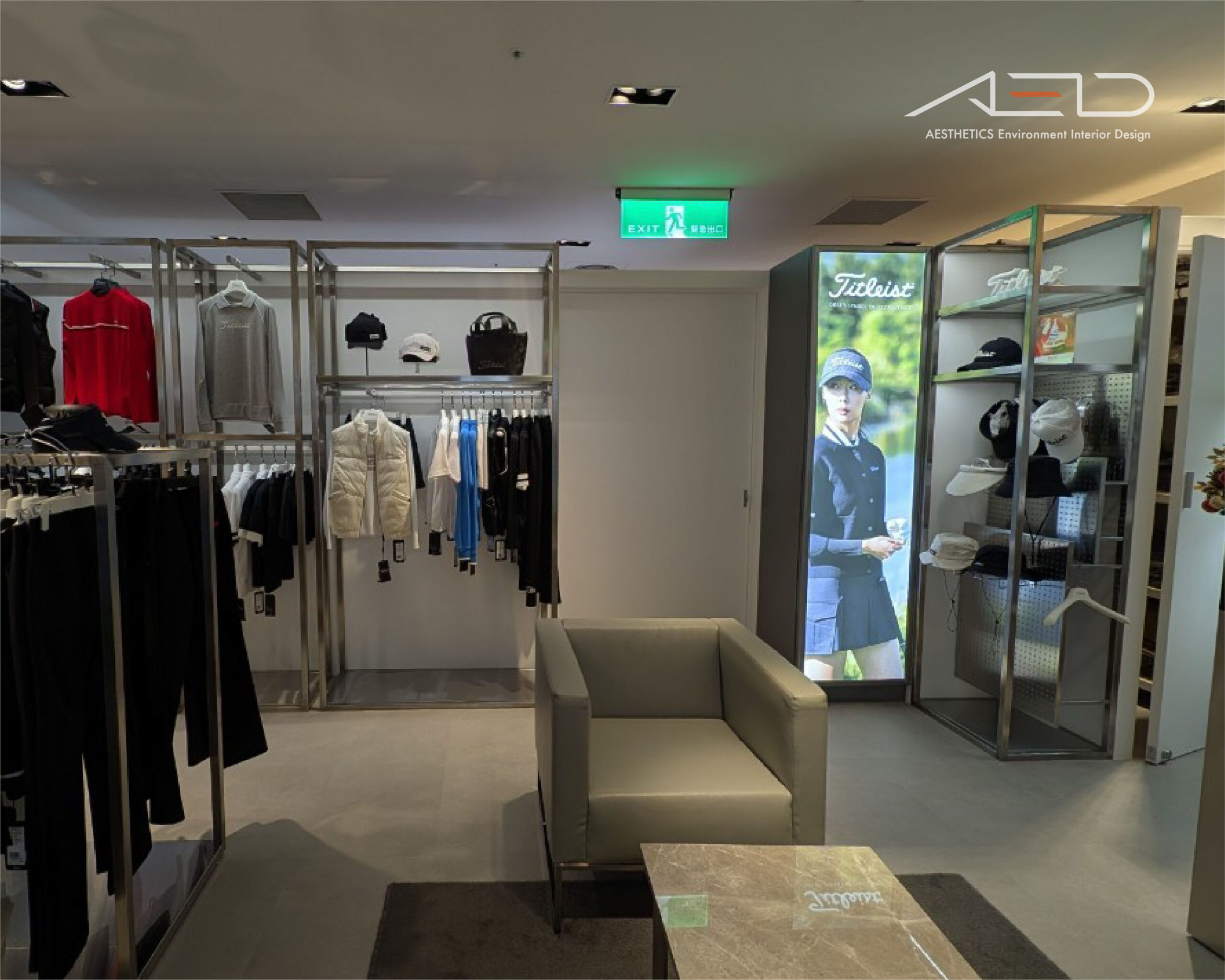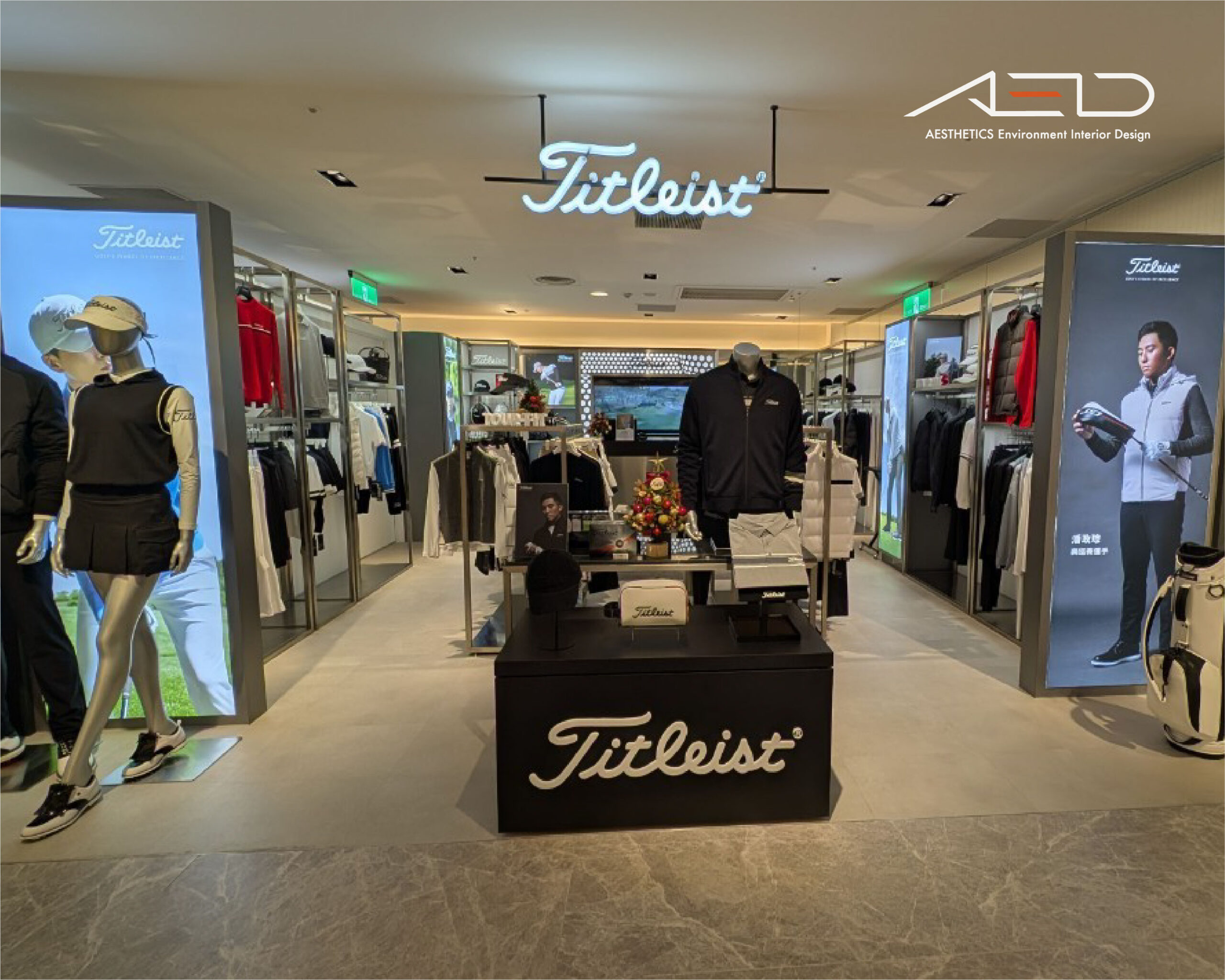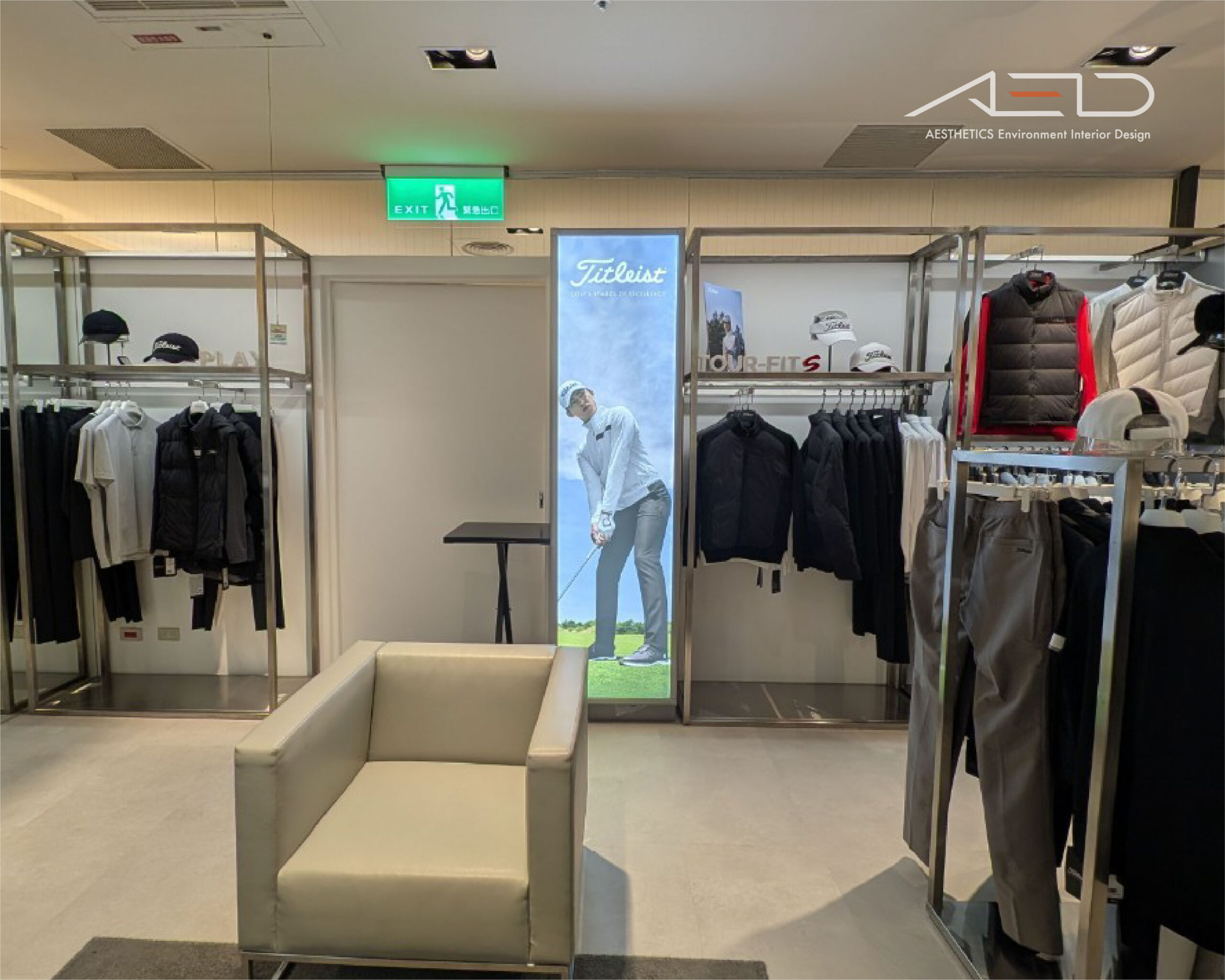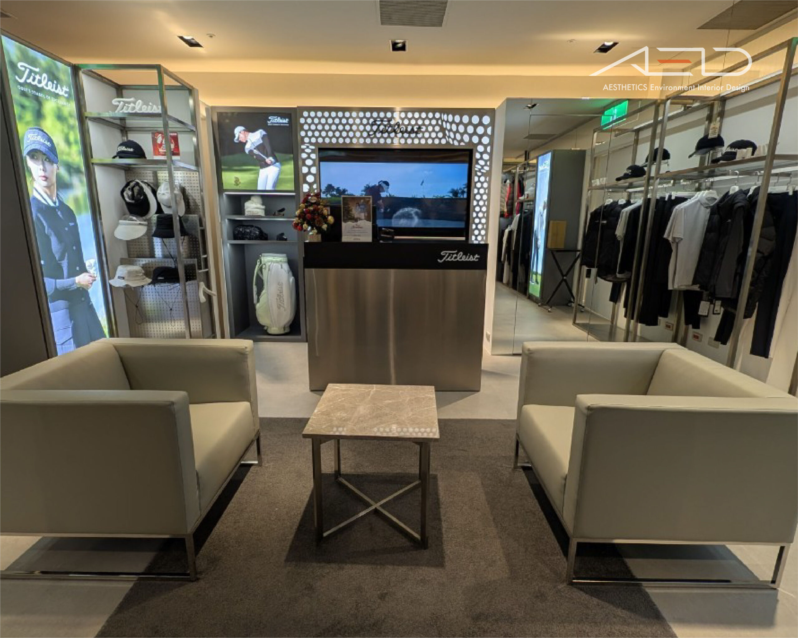 後場整合品牌影像牆與數位螢幕展示平台,前場設置休憩沙發區與配件展示櫃;整體透過簡潔展示道具與整合照明系統,營造俐落且具有國際感的高爾夫品牌零售空間。