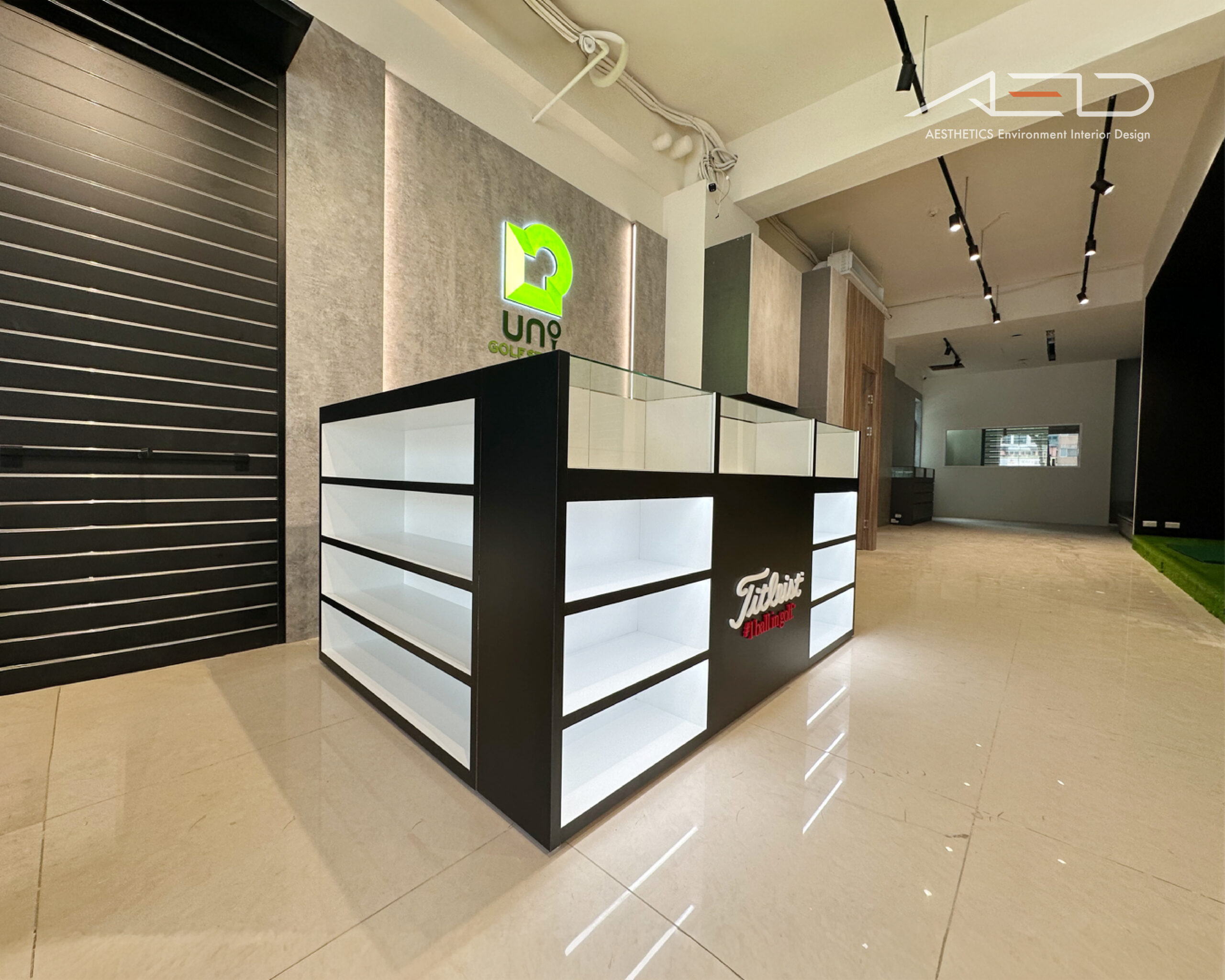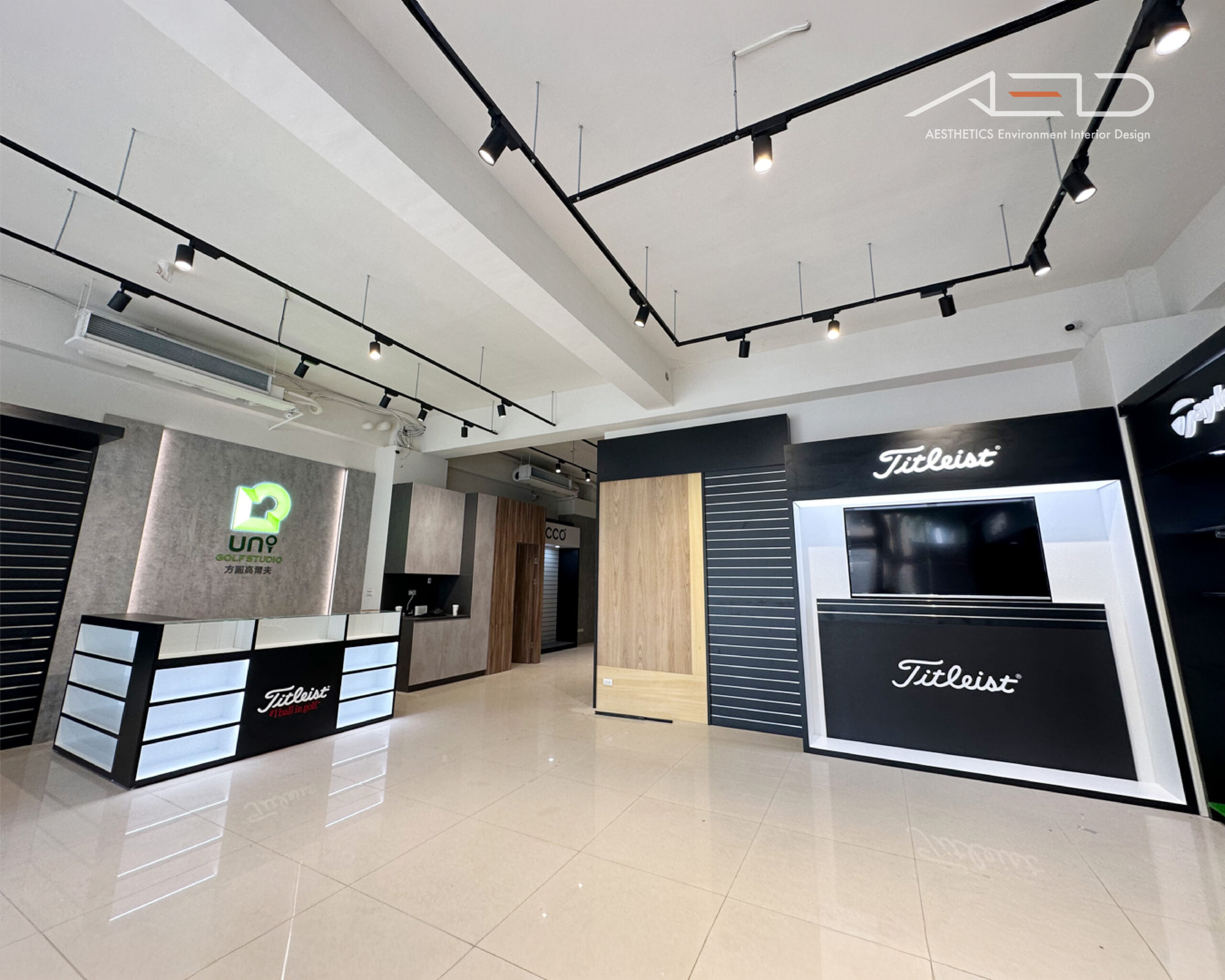 中央設置玻璃展示櫃與品牌展示平台,結合黑色櫃體、內嵌燈帶與開放層架,使商品展示更加立體;整體透過黑白對比材質與軌道照明系統,營造簡潔、專業且具有品牌辨識度的高爾夫零售空間。