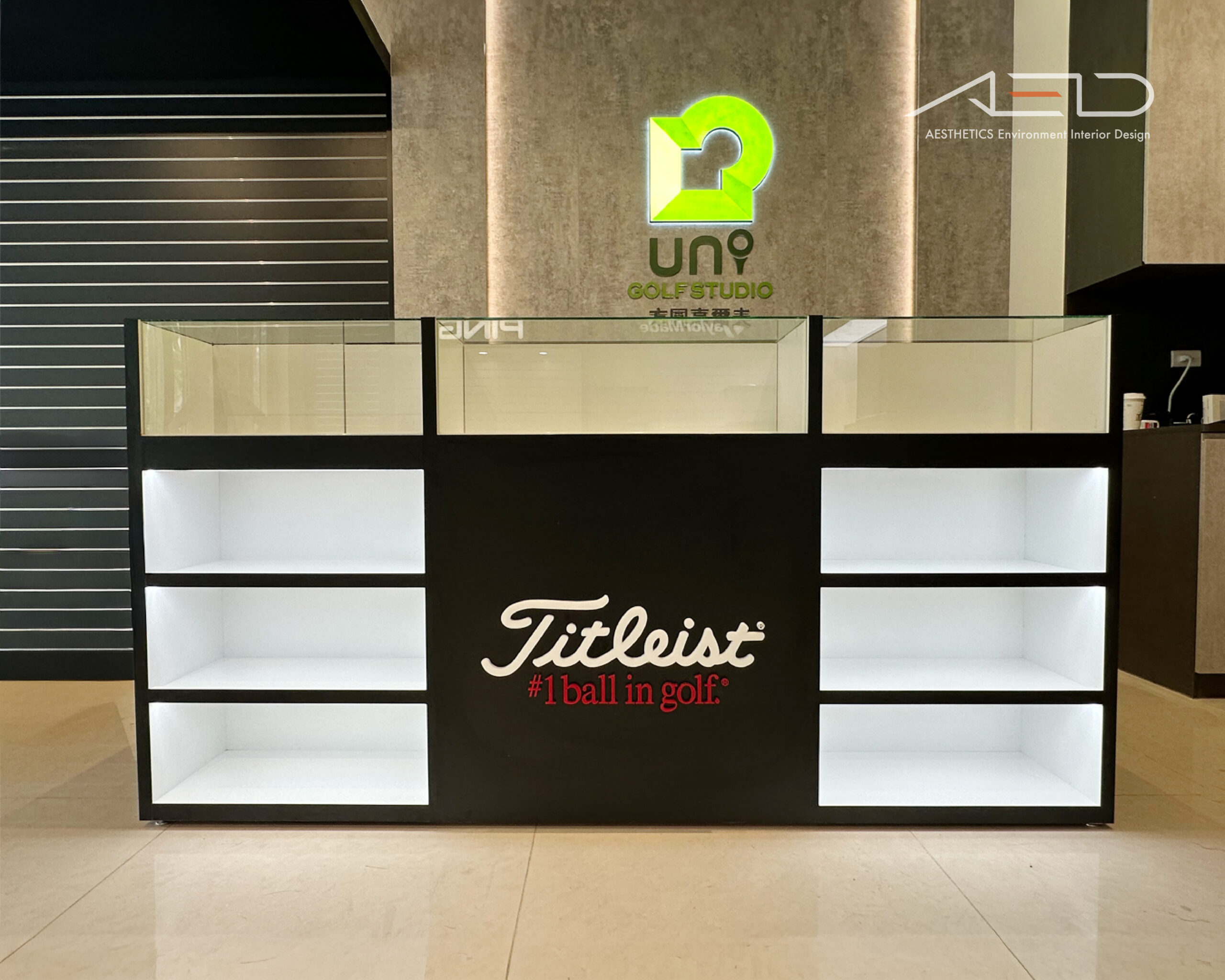 黑色品牌展示牆與 LED 發光LOGO作為空間核心,建立清晰而聚焦的品牌識別,使專業高爾夫品牌在球場零售環境中形成鮮明的視覺入口。