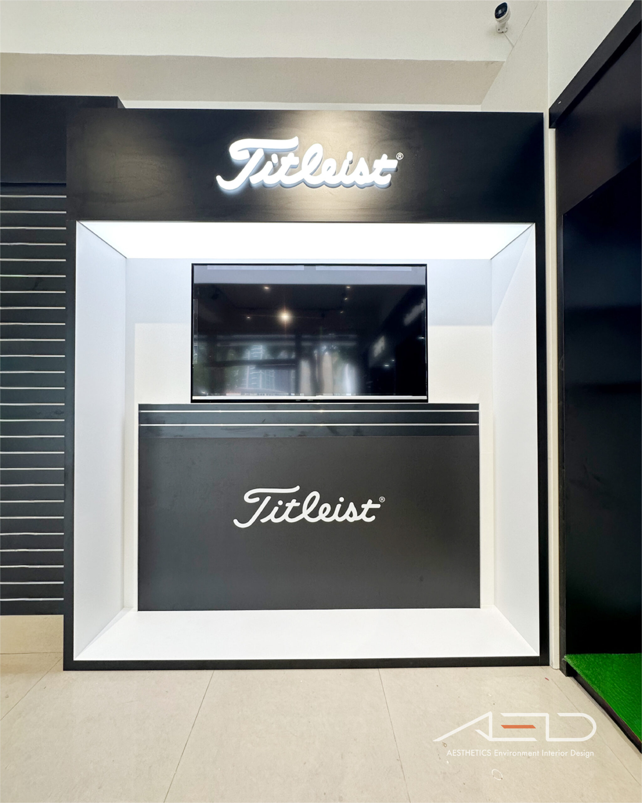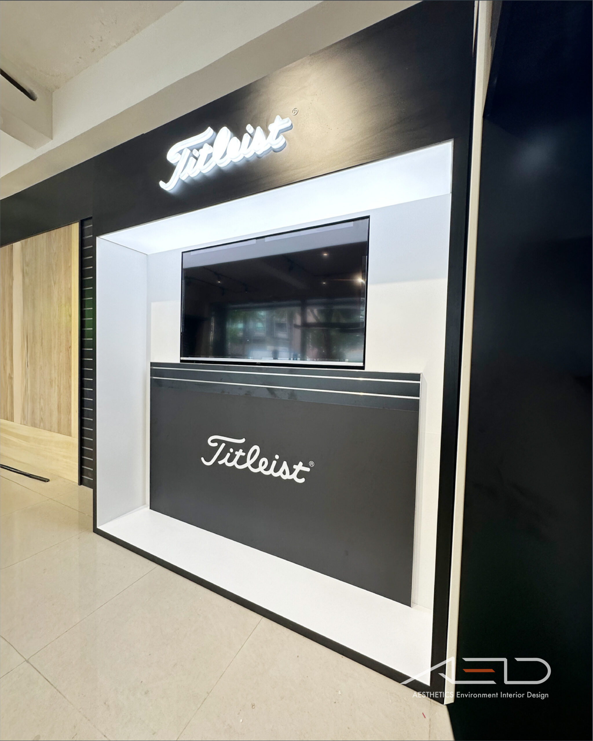 A black feature wall with an illuminated Titleist logo anchors the space, establishing a clear brand identity and creating a strong visual entrance within the golf retail environment.