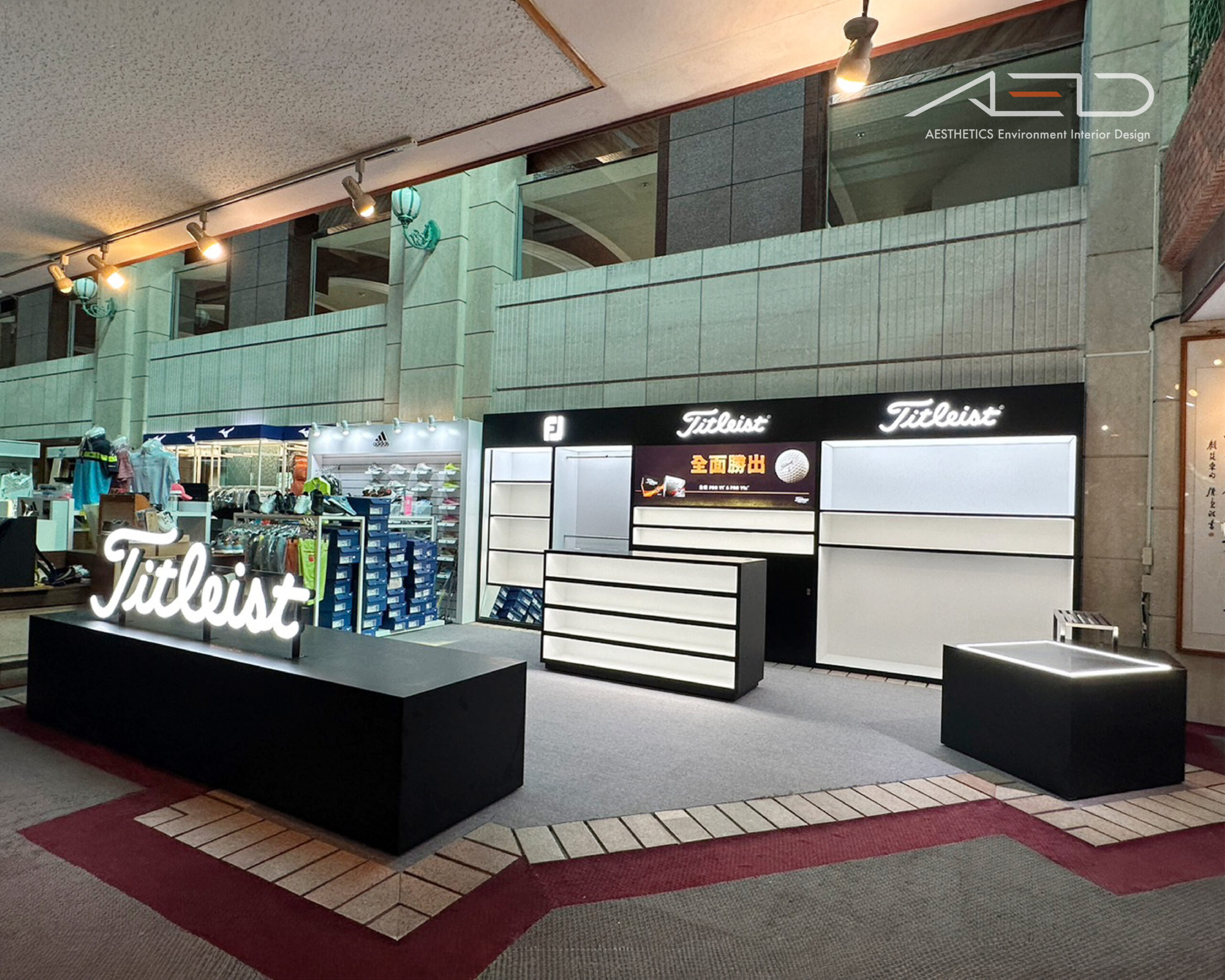 黑色品牌展示牆結合 LED 發光品牌招牌,形成清晰且聚焦的品牌界面,使高爾夫品牌在球場零售場域中建立強烈且具有辨識度的展示入口。