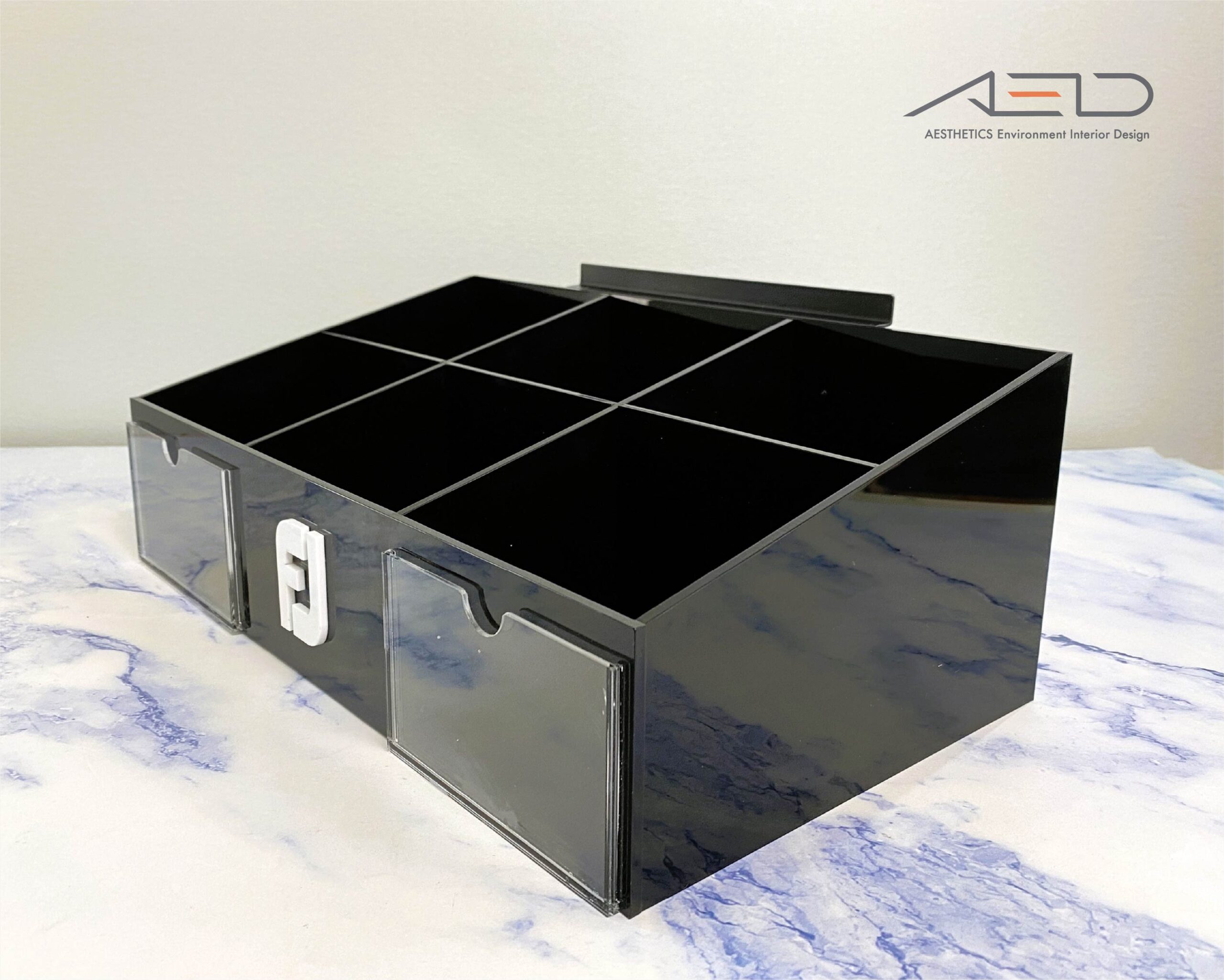 整體以簡潔比例與霧面黑色壓克力材質強化專業質感,提升商品陳列效率,同時維持俐落且具有品牌一致性的展示效果。
