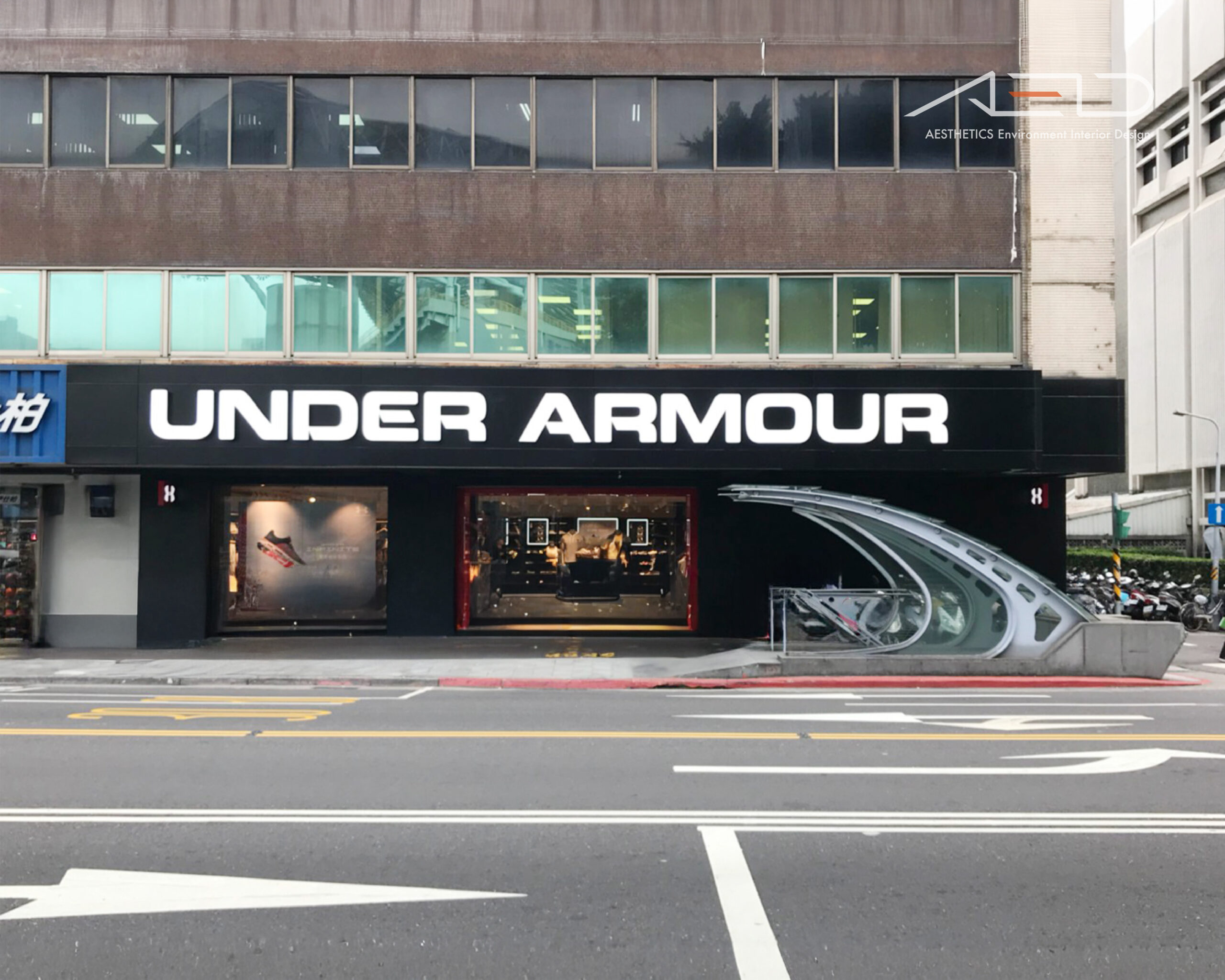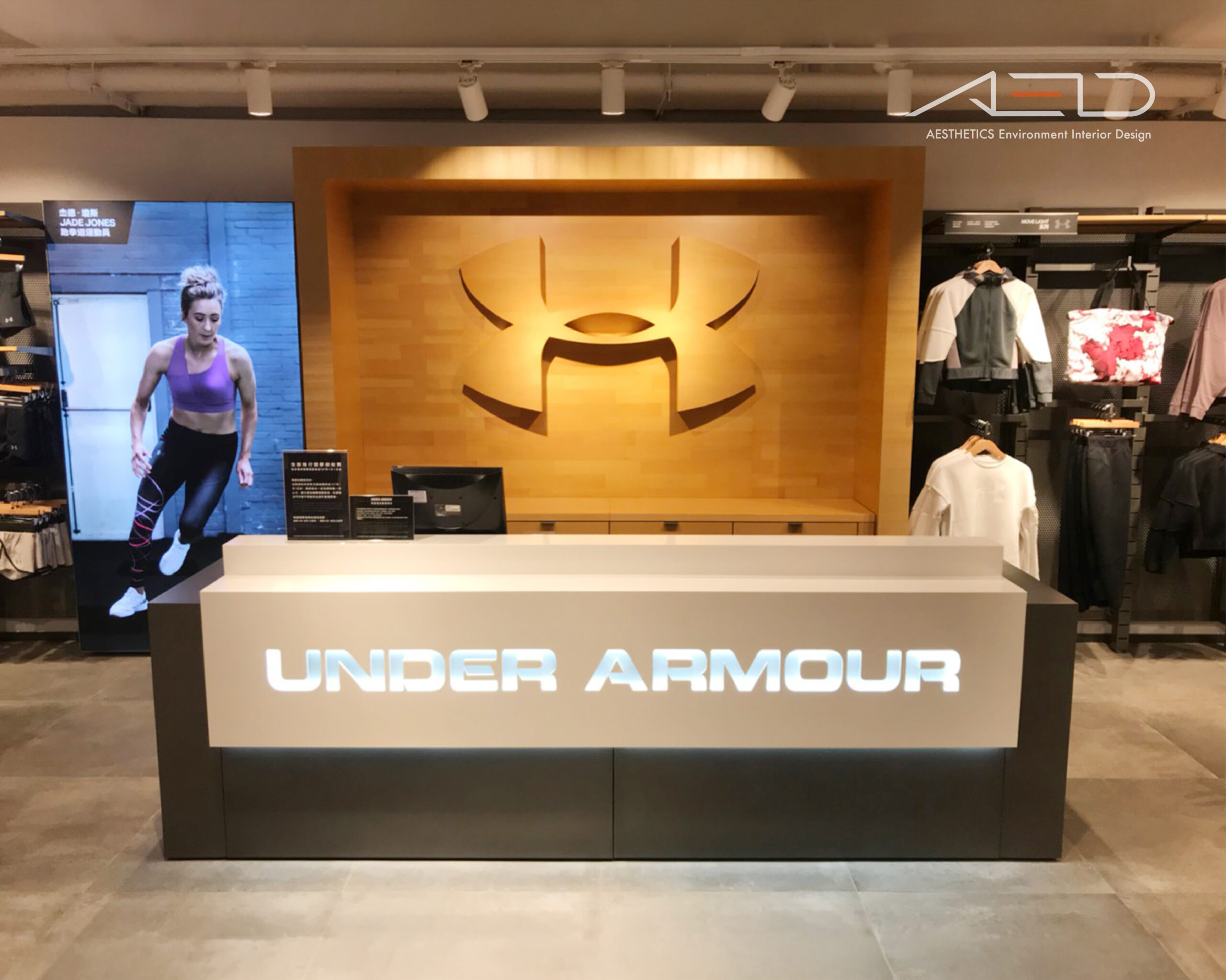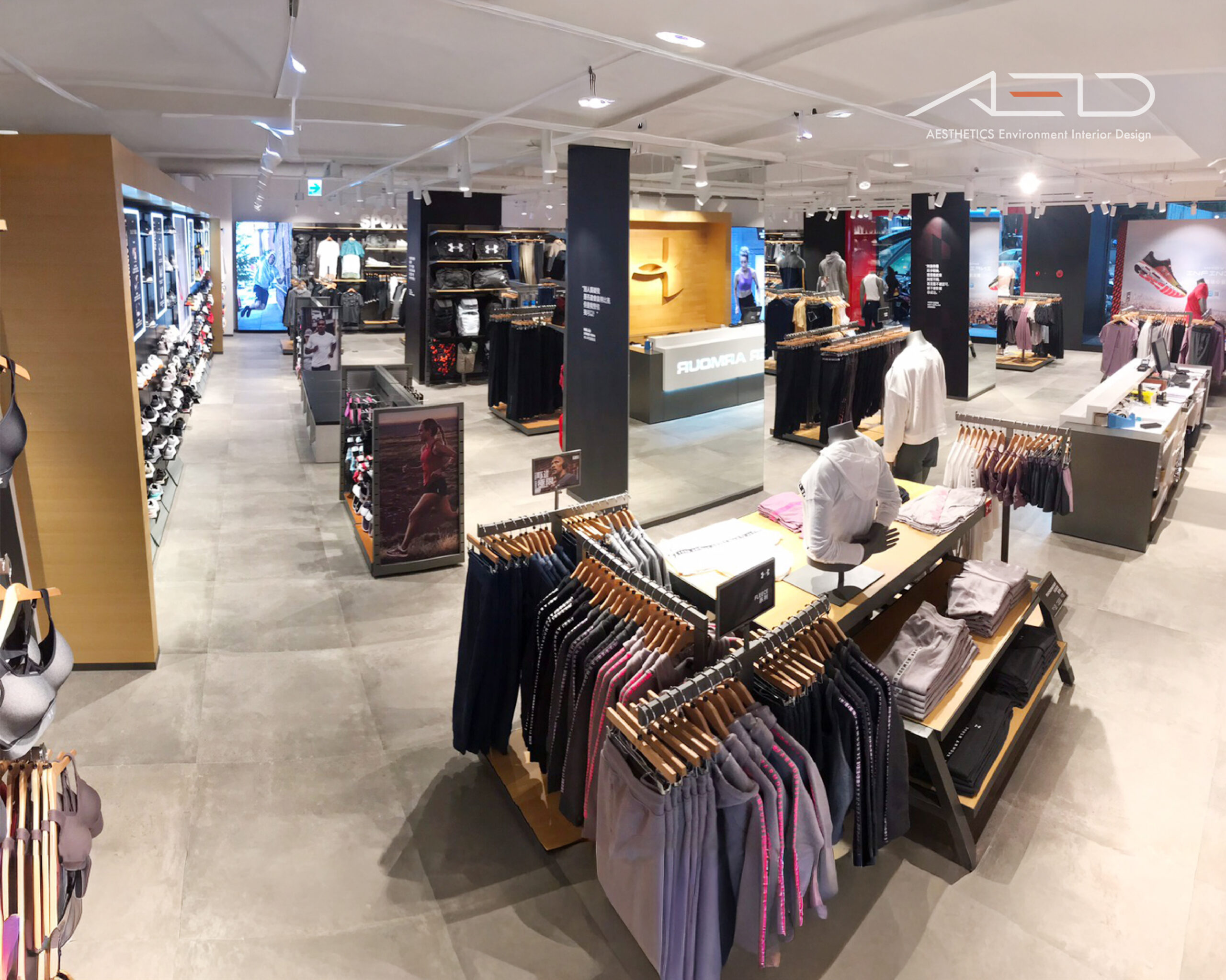 室內透過俐落的結構節奏與模組化陳列系統組織空間,使商品、品牌與顧客動線整合於同一體驗之中,回應 UNDER ARMOUR 對性能、力量與運動文化的品牌精神。