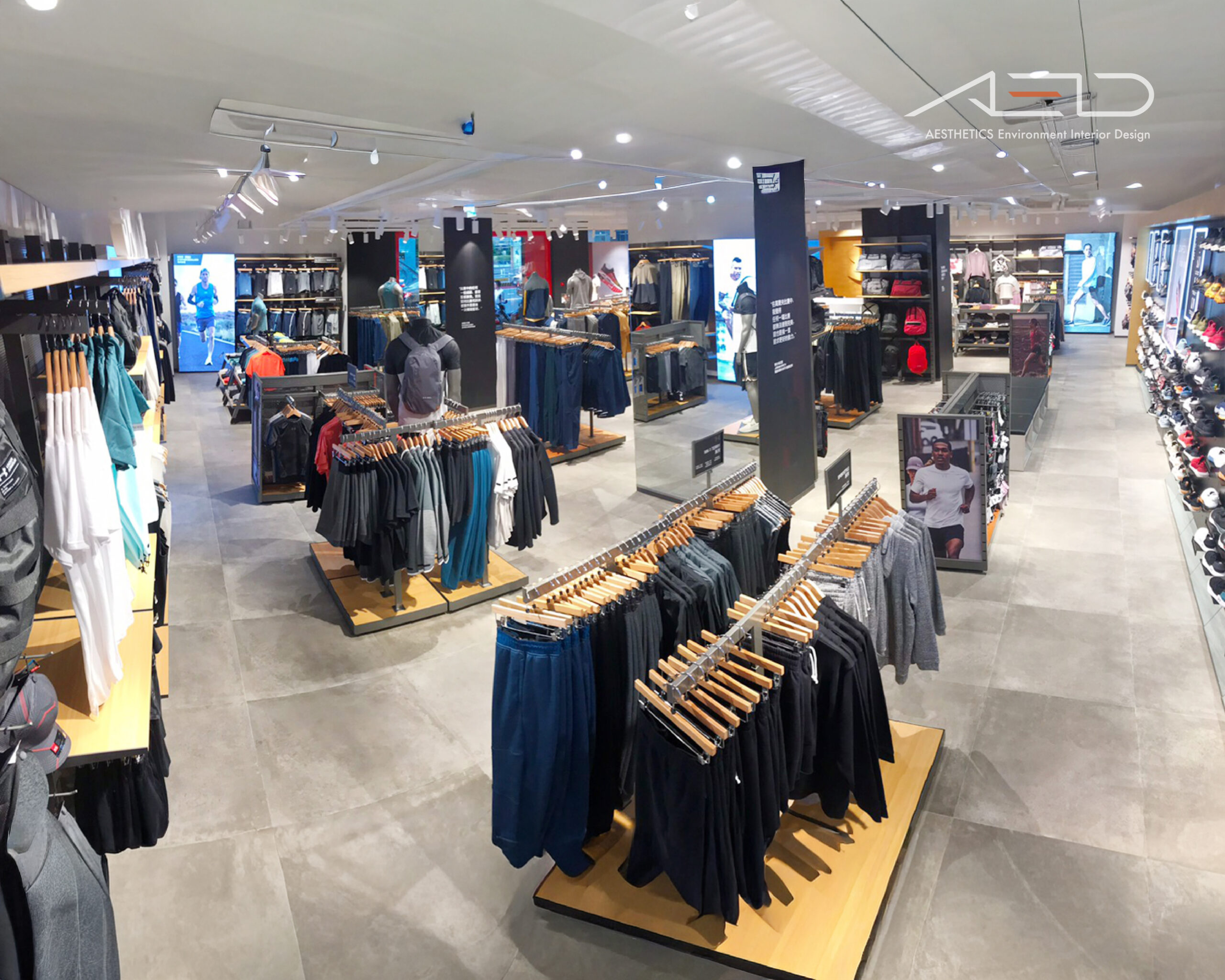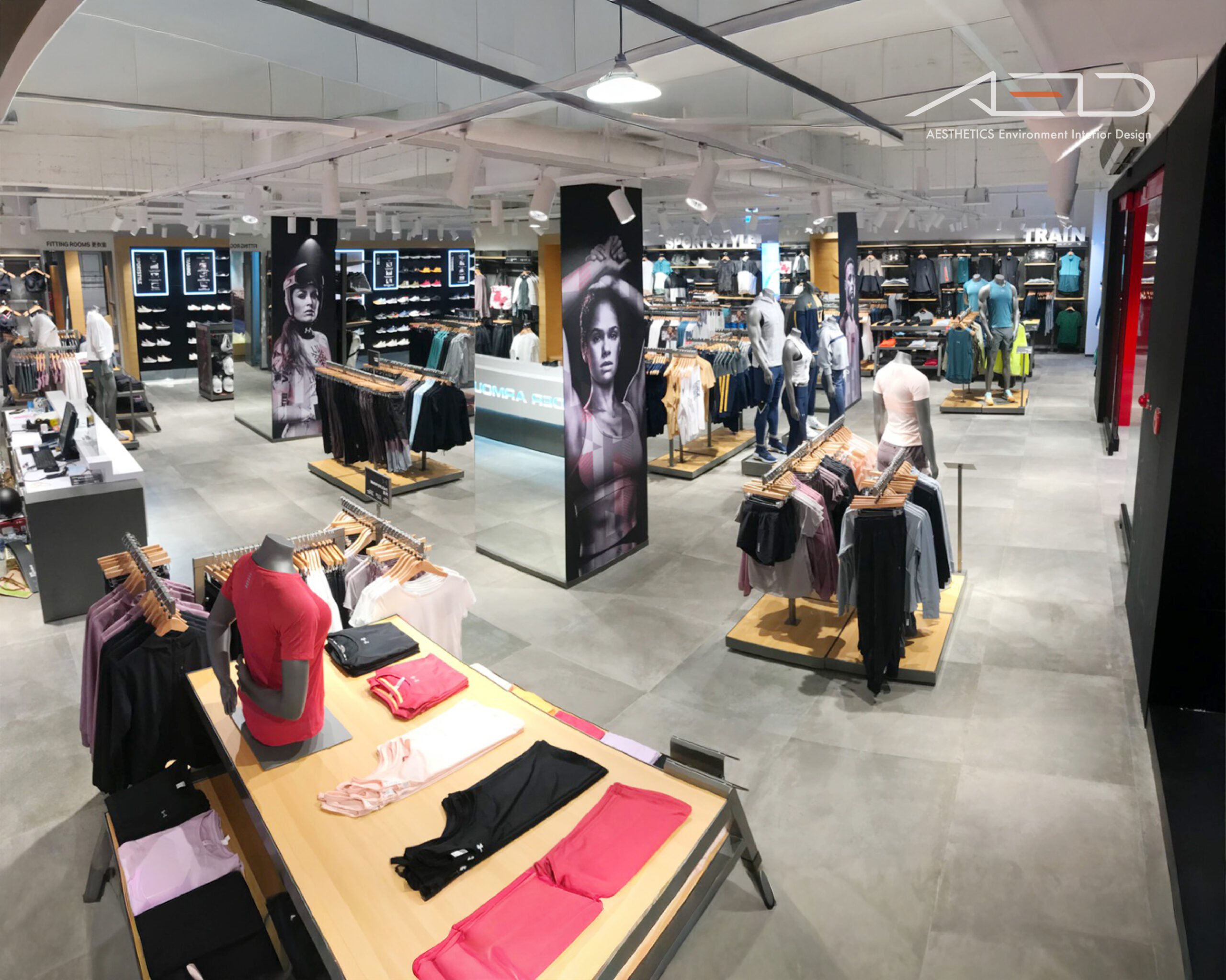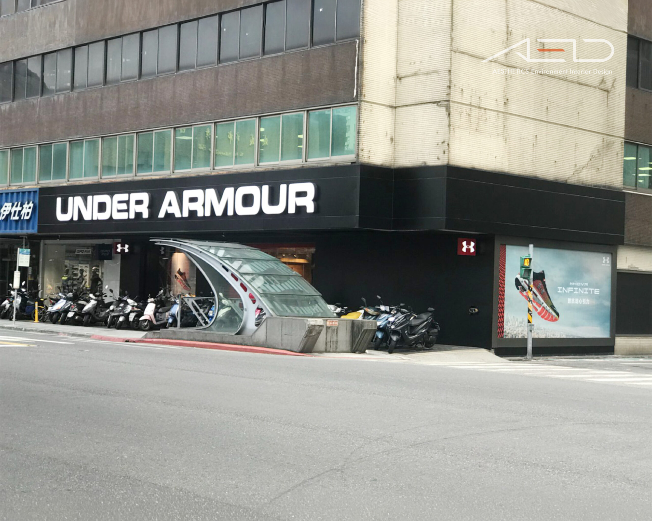 室內透過俐落的結構節奏與模組化陳列系統組織空間,使商品、品牌與顧客動線整合於同一體驗之中,回應 UNDER ARMOUR 對性能、力量與運動文化的品牌精神。