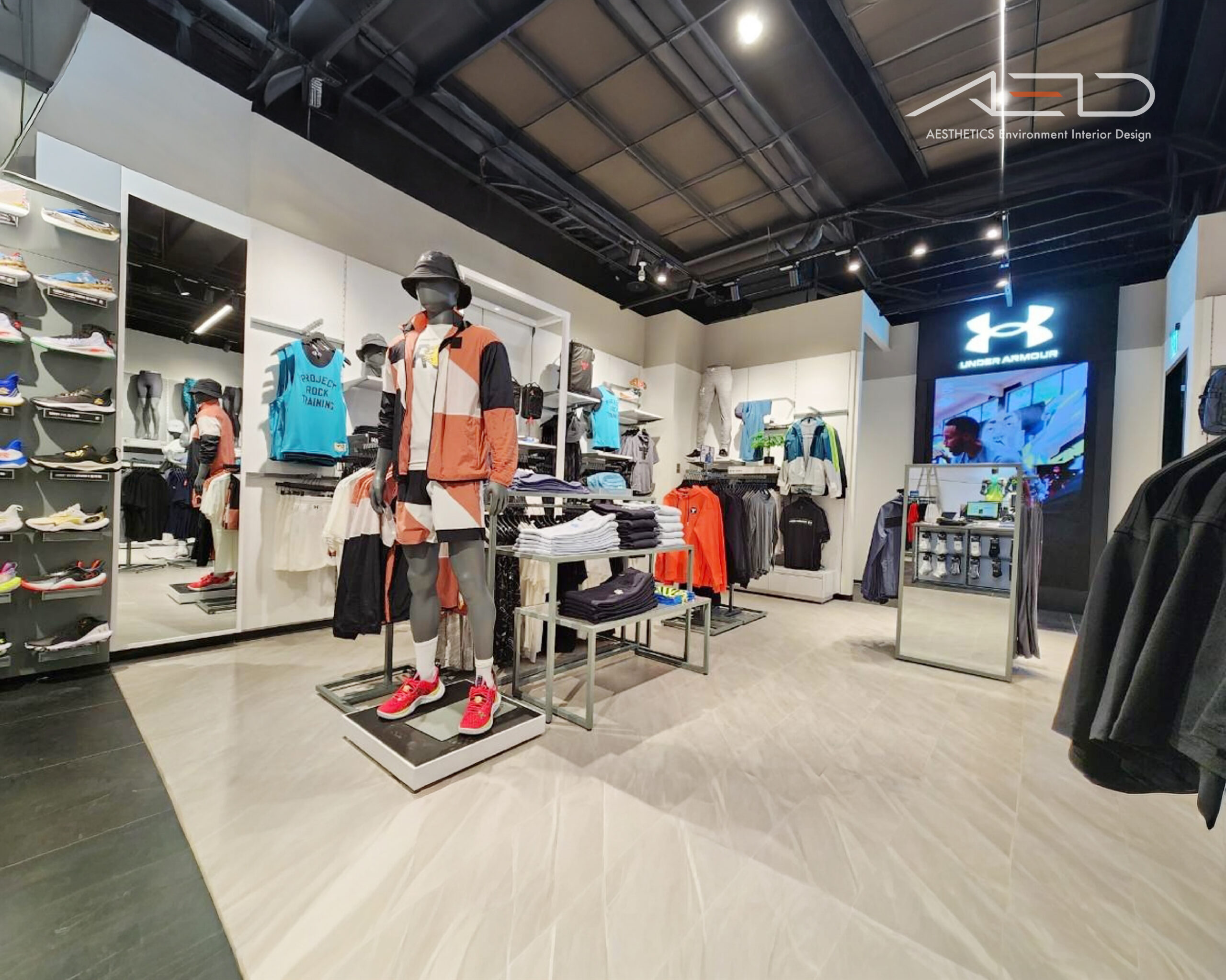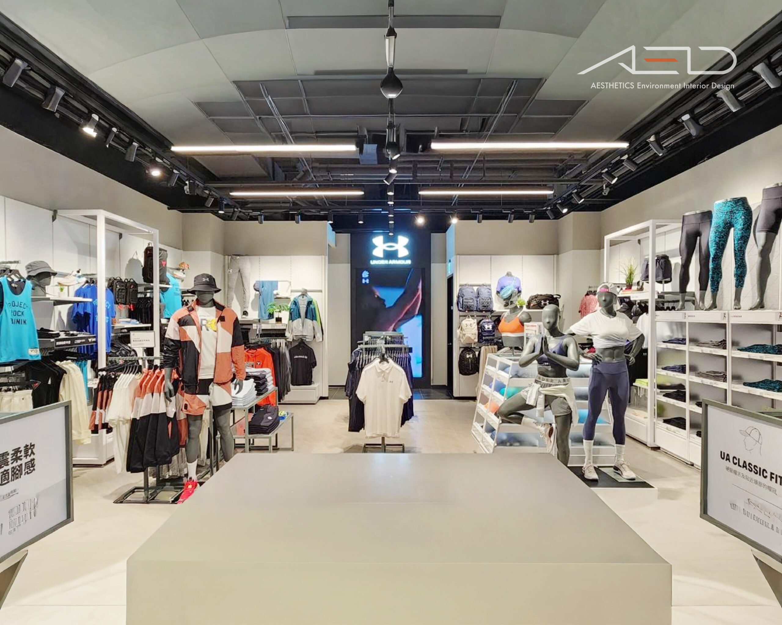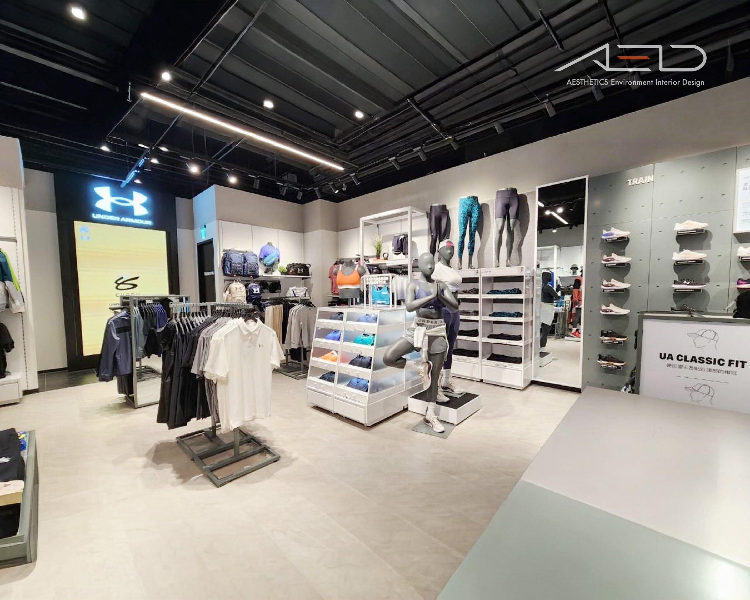 整體空間以簡潔而有力量感的設計語彙,呈現 UNDER ARMOUR 對性能、訓練與運動精神的品牌核心。