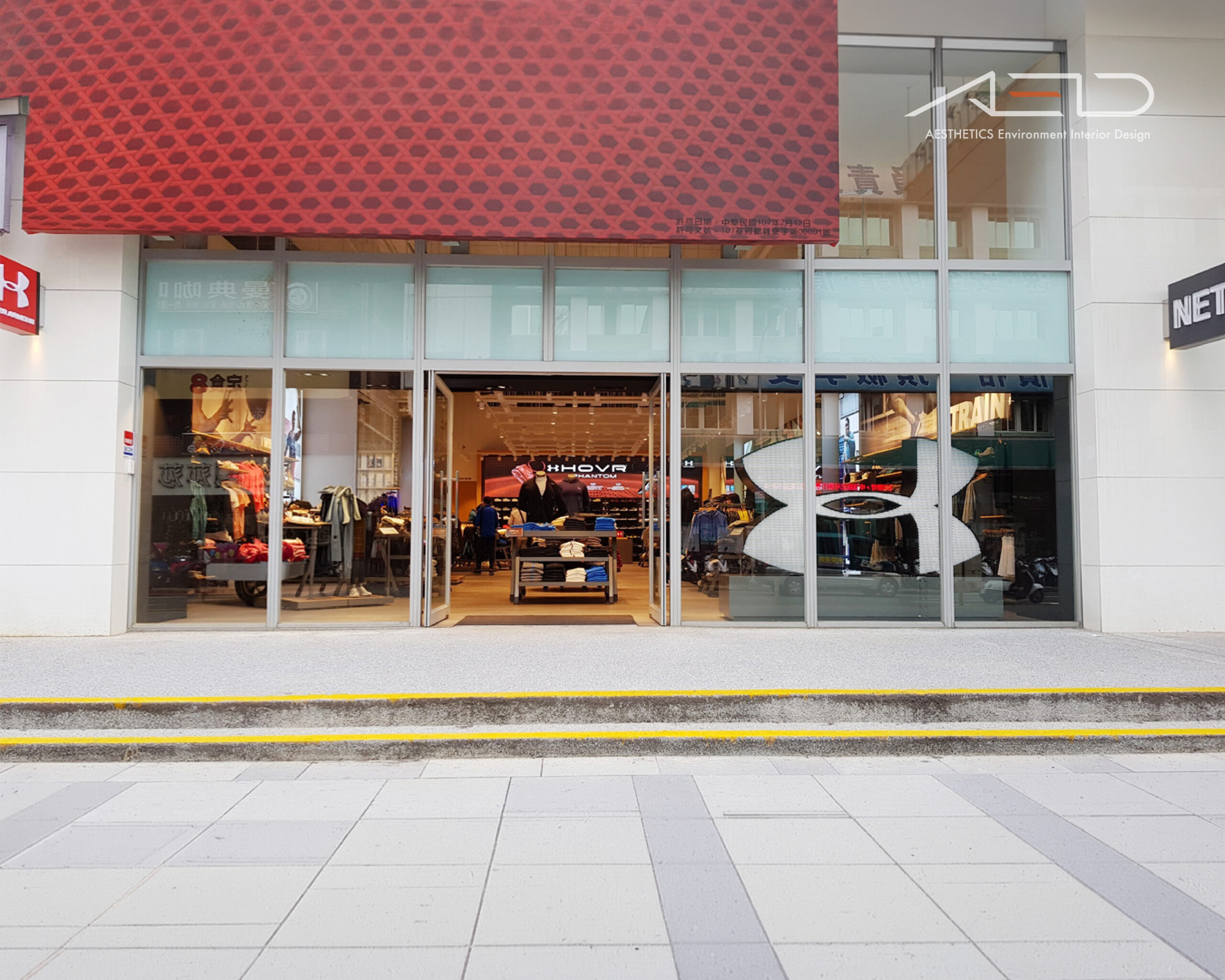 開放式玻璃立面構築鮮明的品牌入口,搭配大型品牌標誌與運動形象視覺,將 UNDER ARMOUR 的運動能量延伸至街道界面。