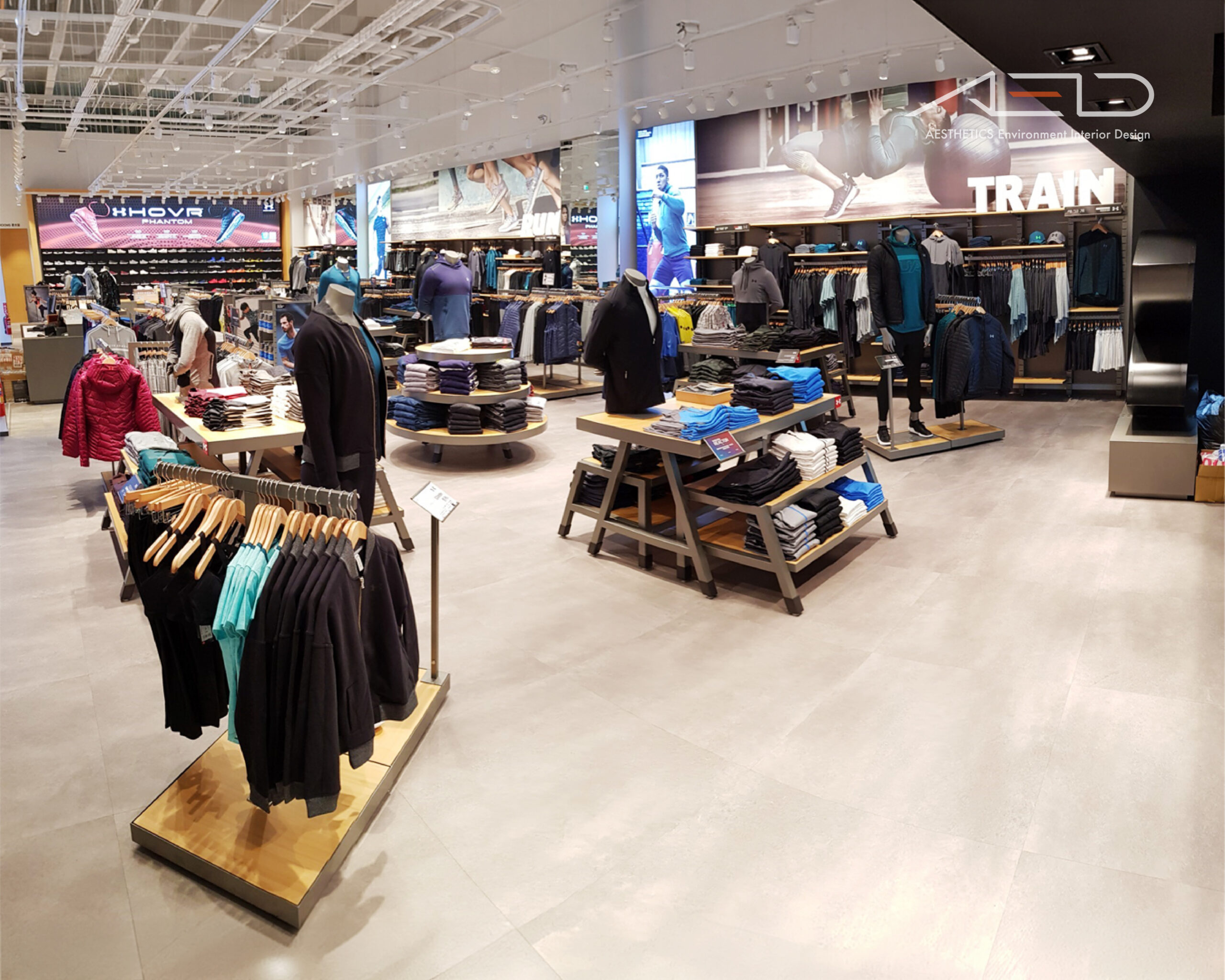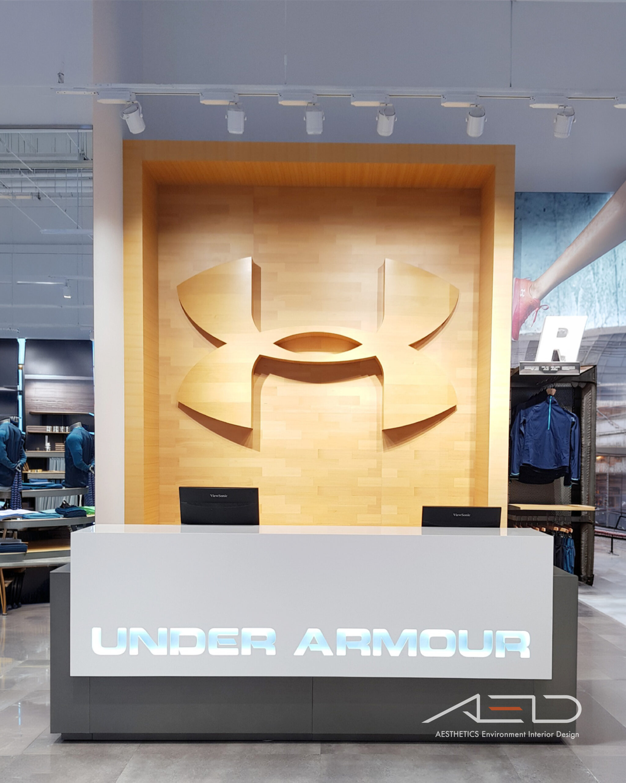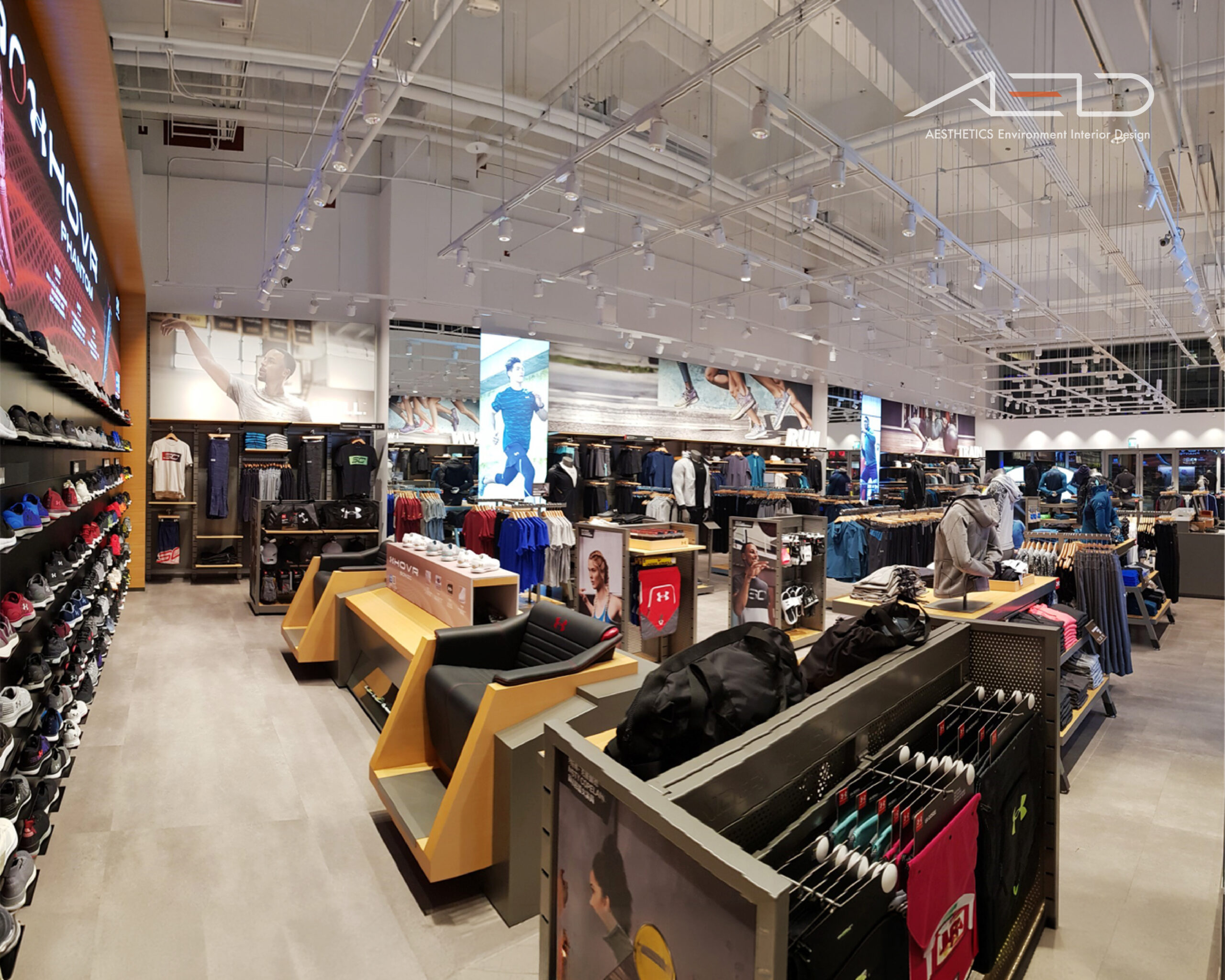 Track lighting and an industrial material palette define a bright and energetic retail environment that reflects UNDER ARMOUR’s performance-driven brand identity.