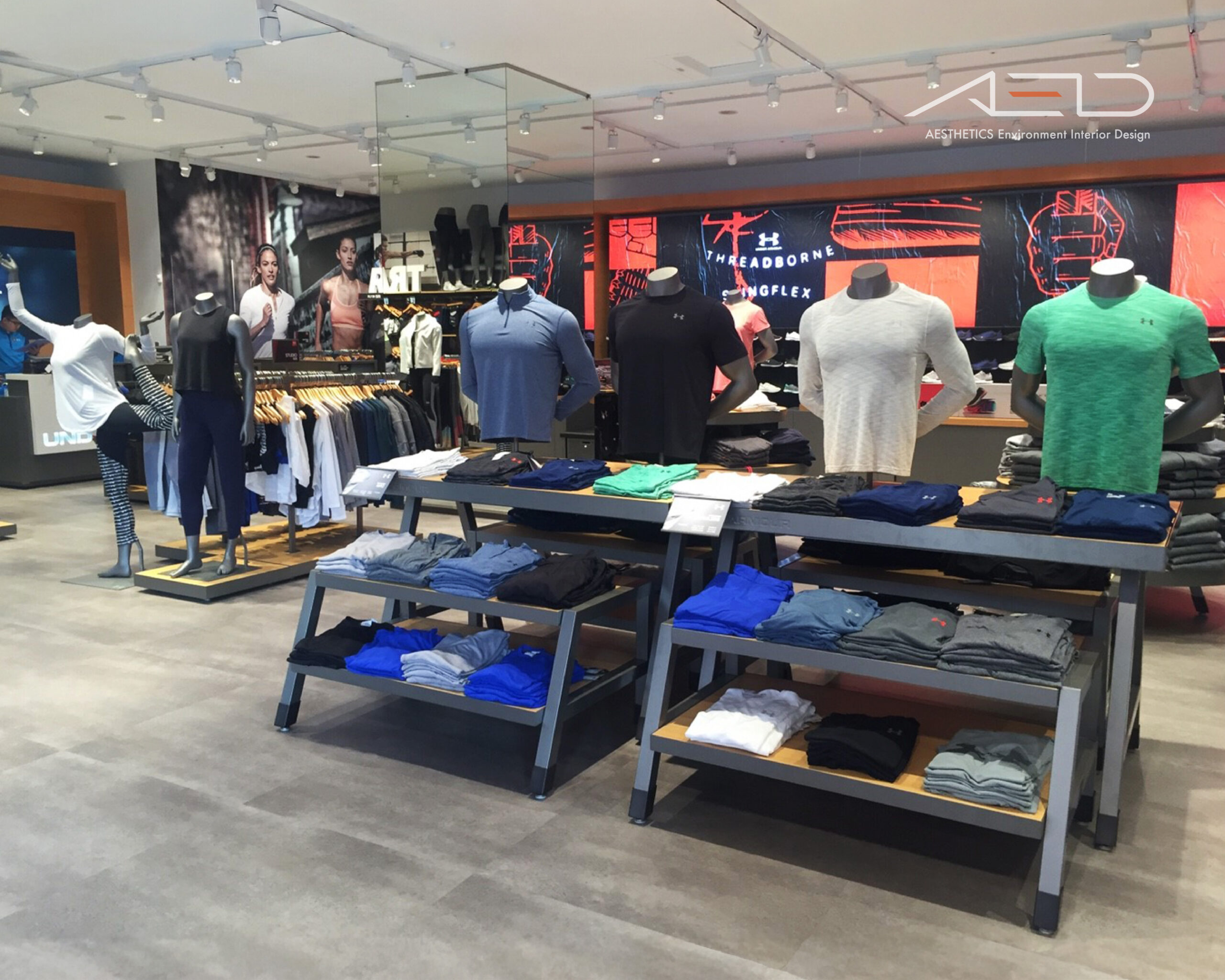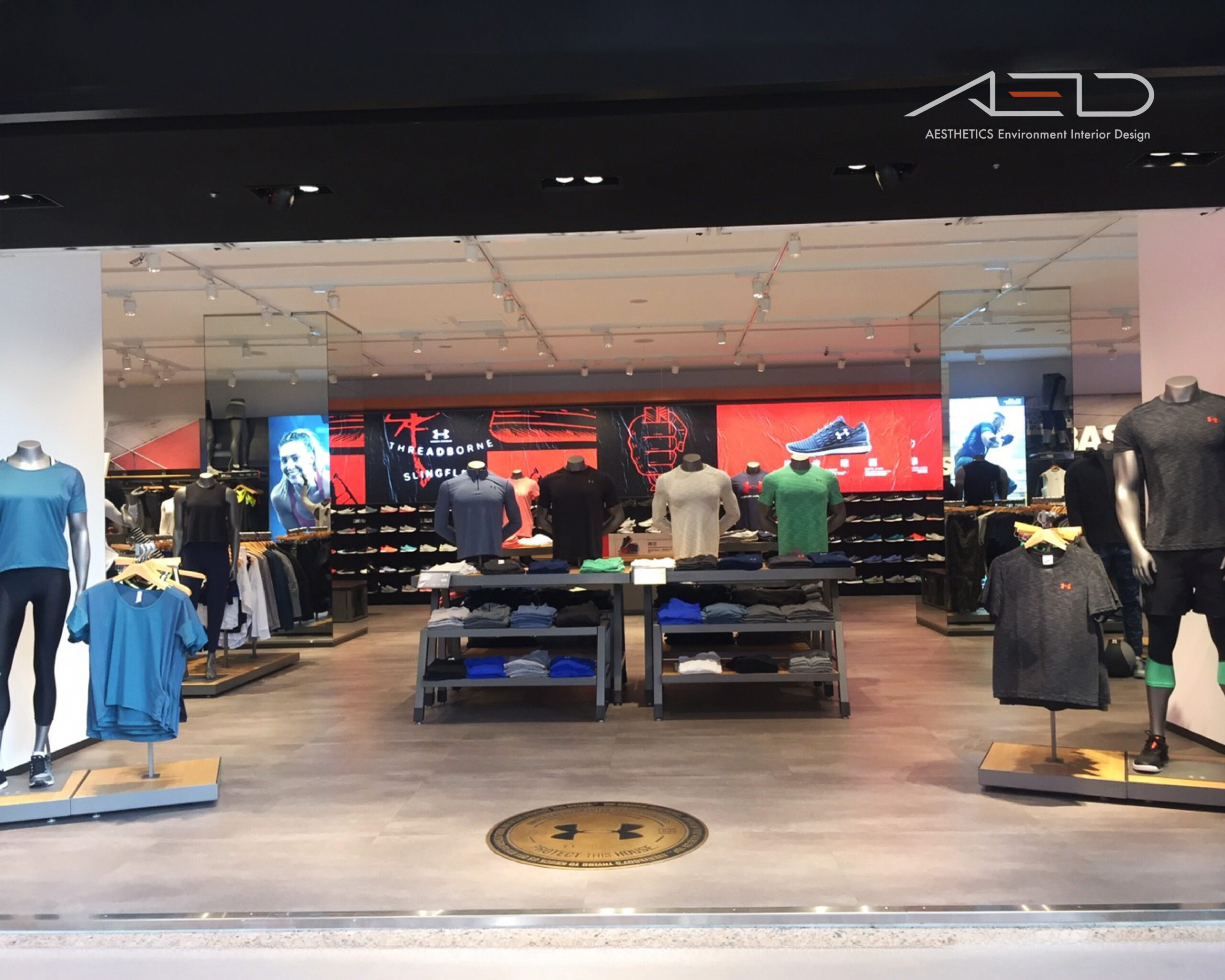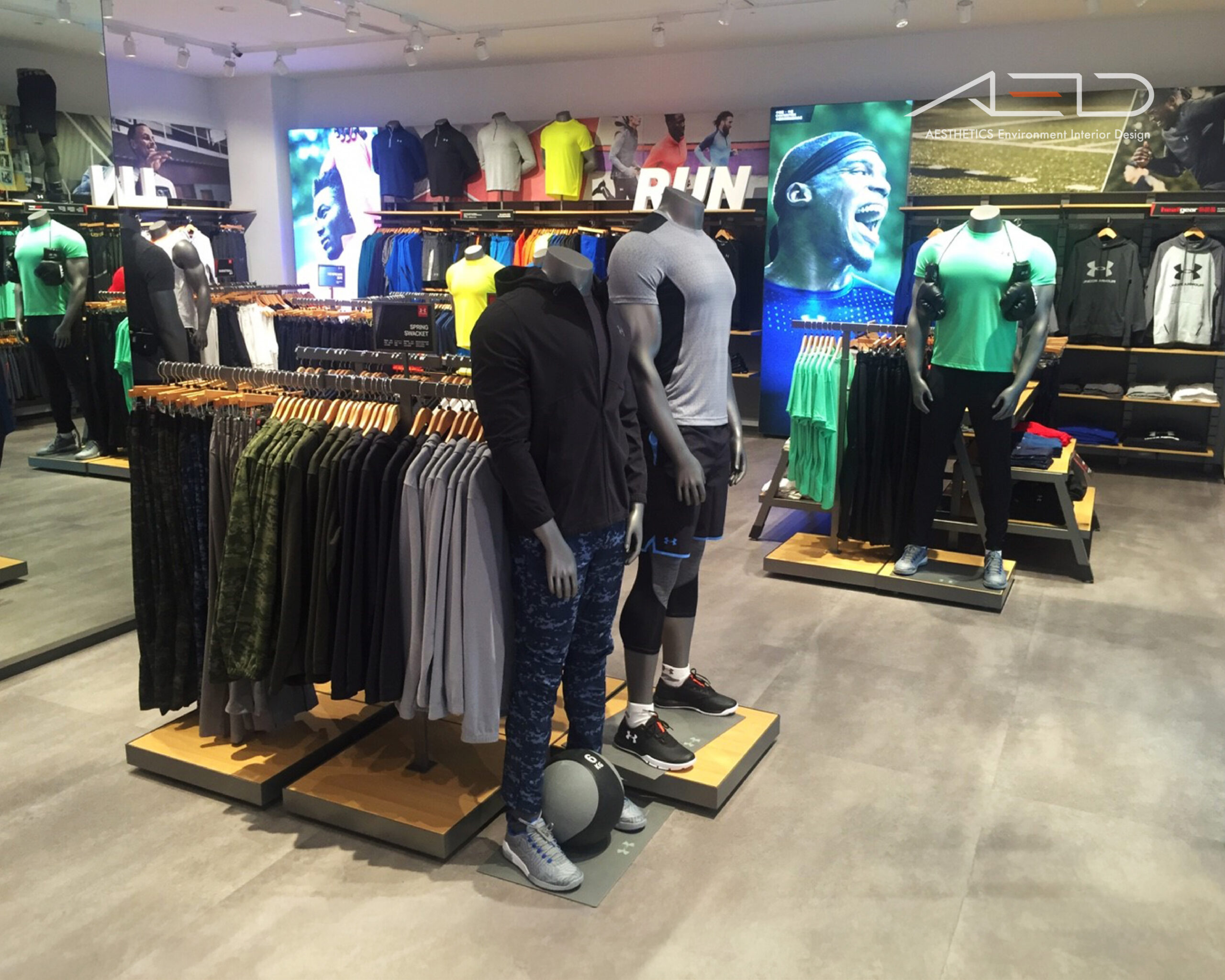Through branded display fixtures and a clear spatial axis, performance apparel and training gear are presented in an organized composition, expressing UNDER ARMOUR’s core values of performance, strength, and athletic spirit.