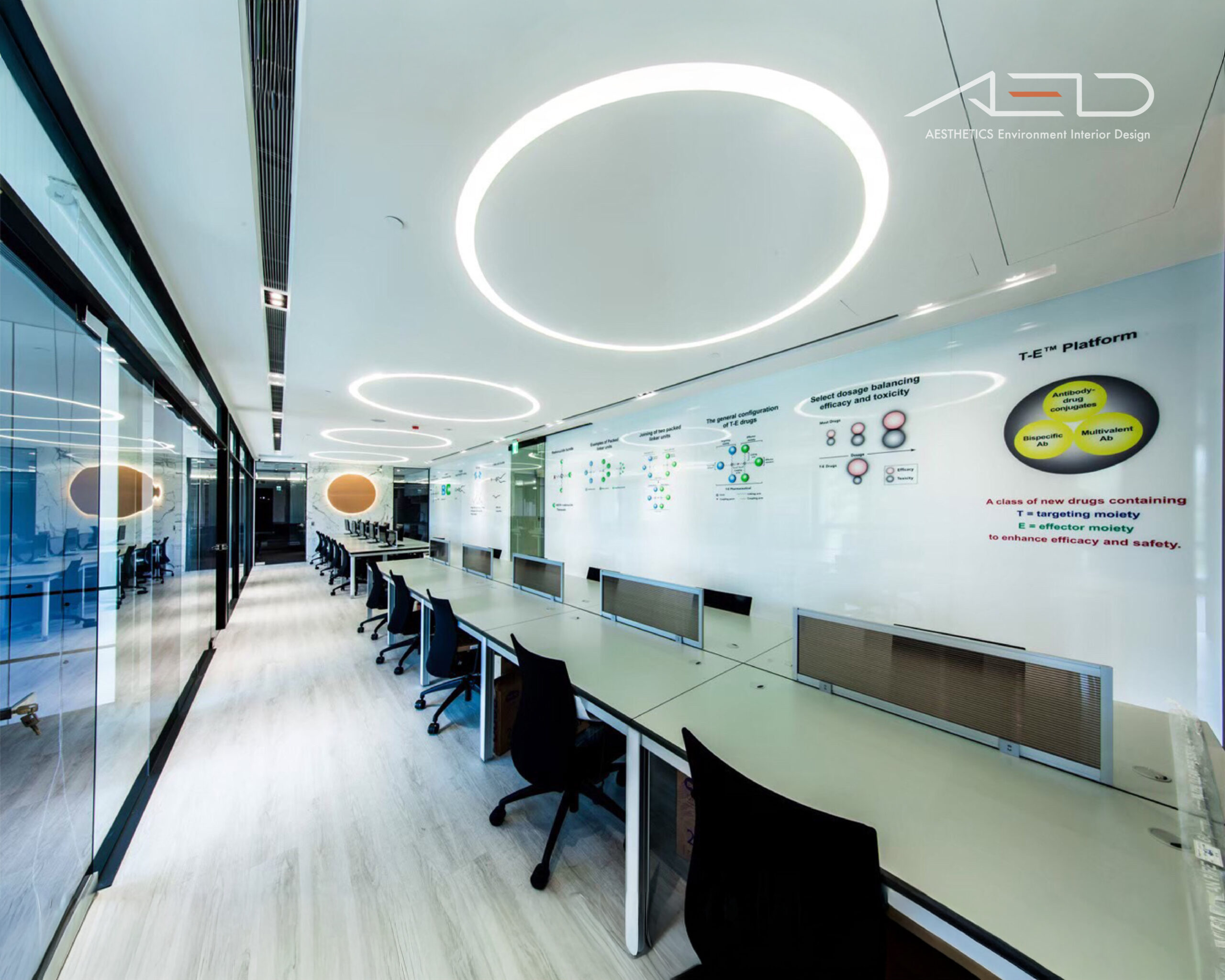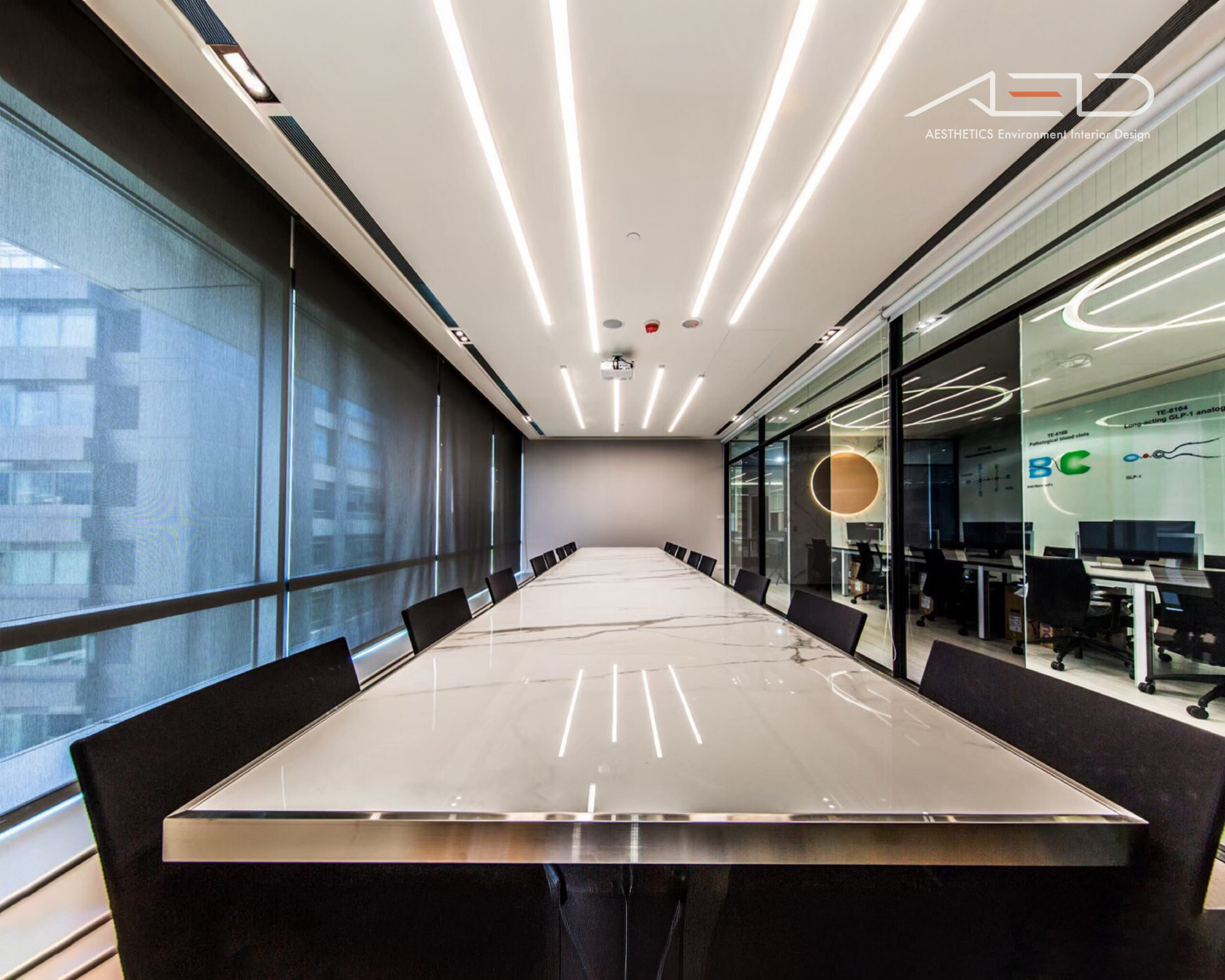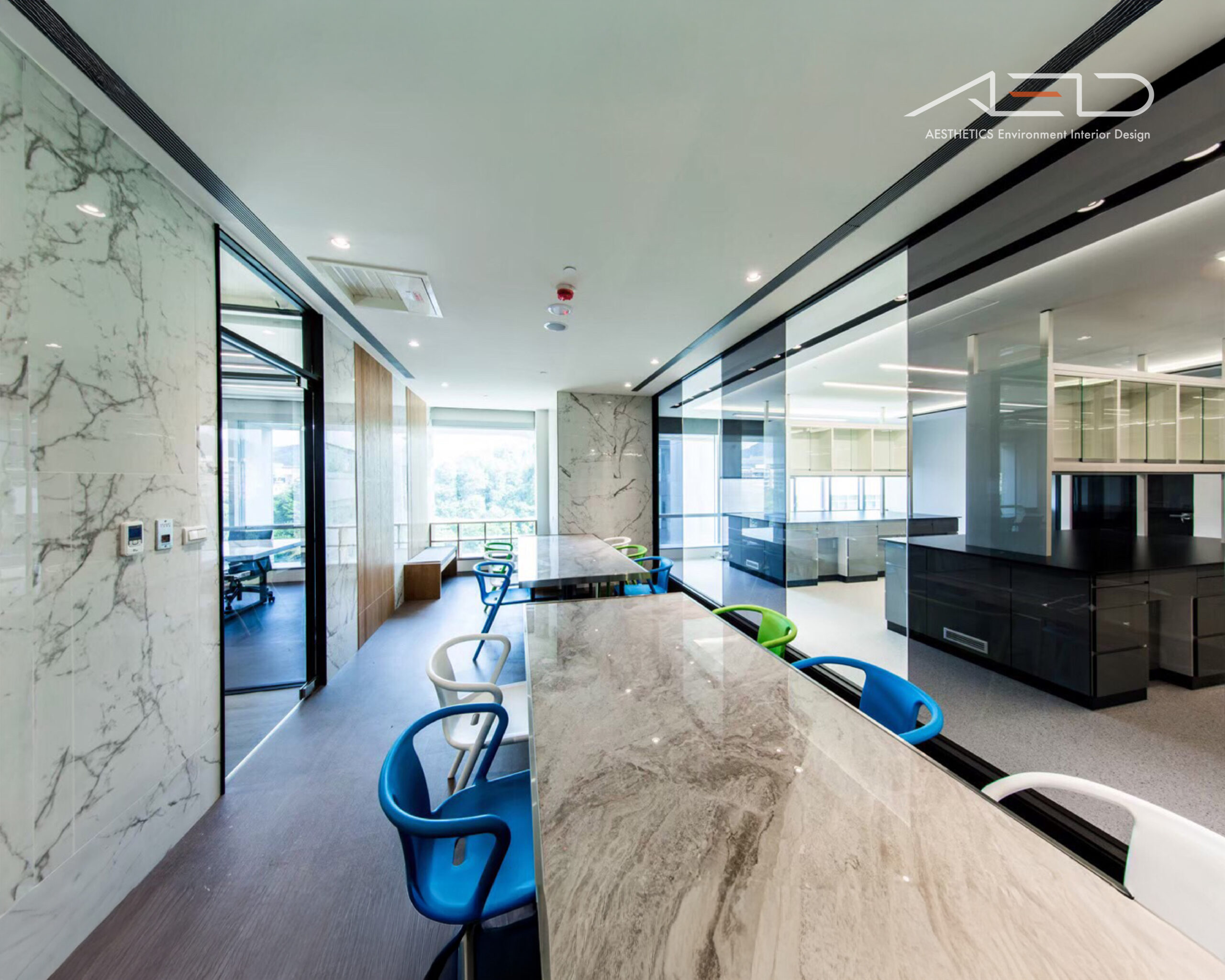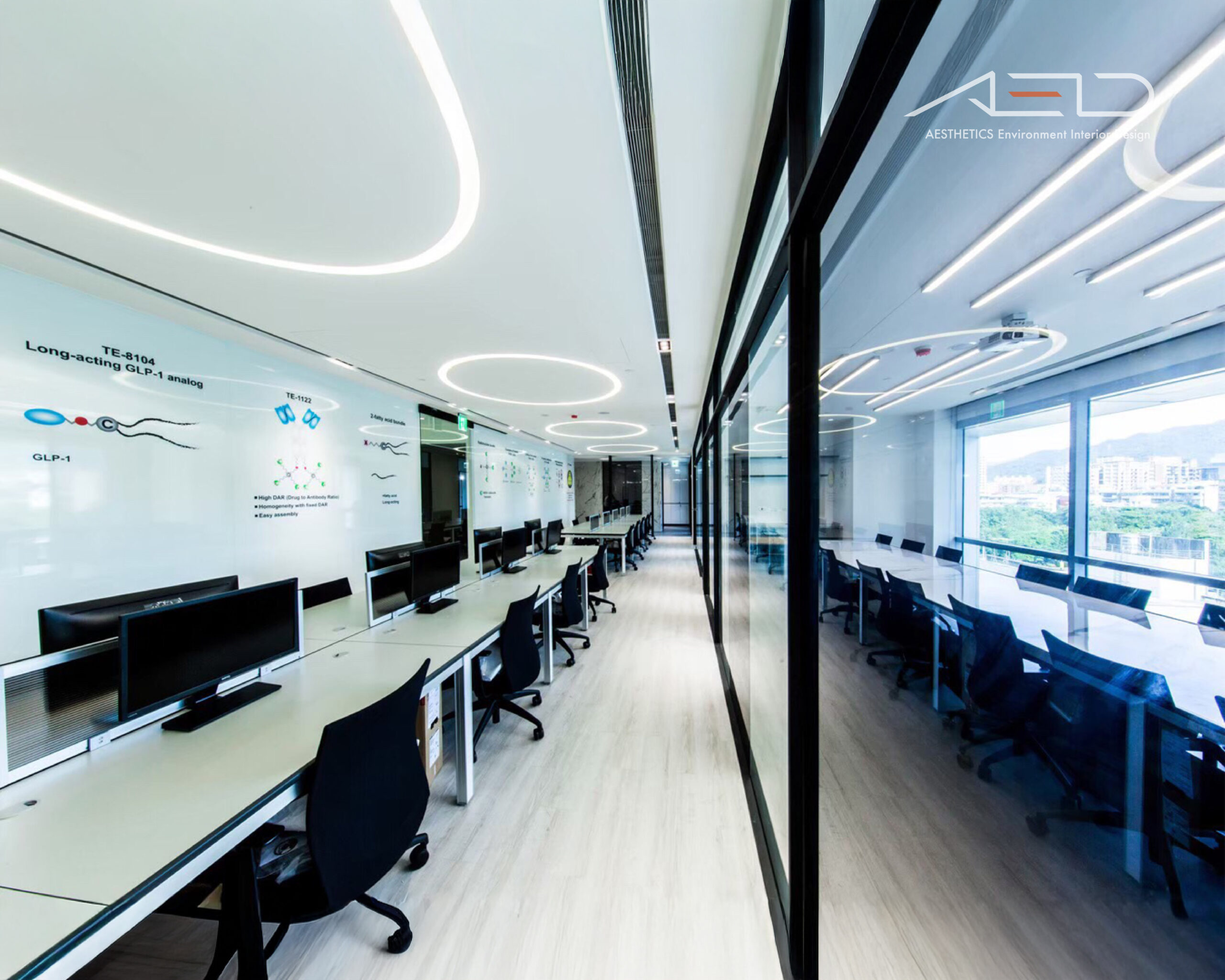 採用大片落地玻璃隔間,大量引進自然光線營造優閒的舒適感,藉由灰玻璃及清玻璃交錯配置的反射及穿透特性讓天花板光源相互交錯融合,並以業主企業圖騰導入設計讓空間更添話題。