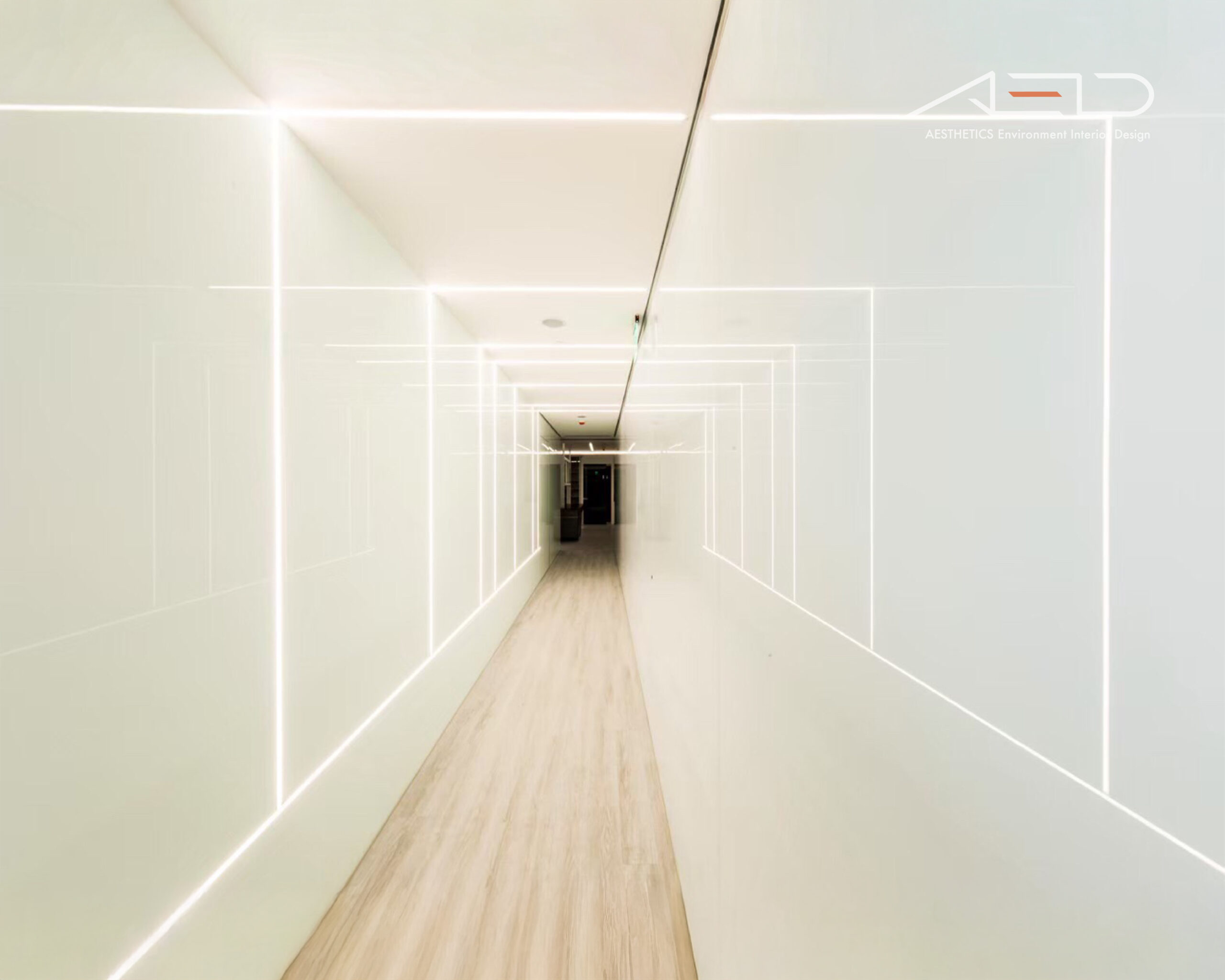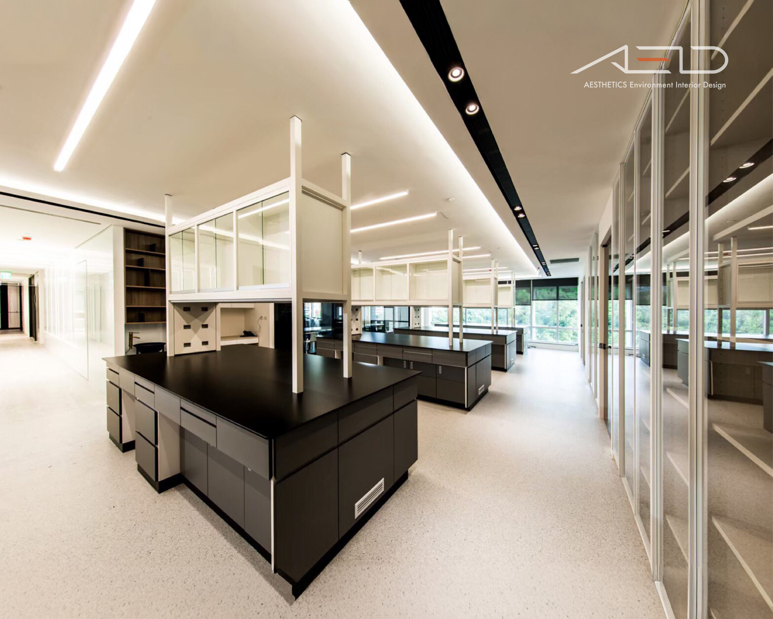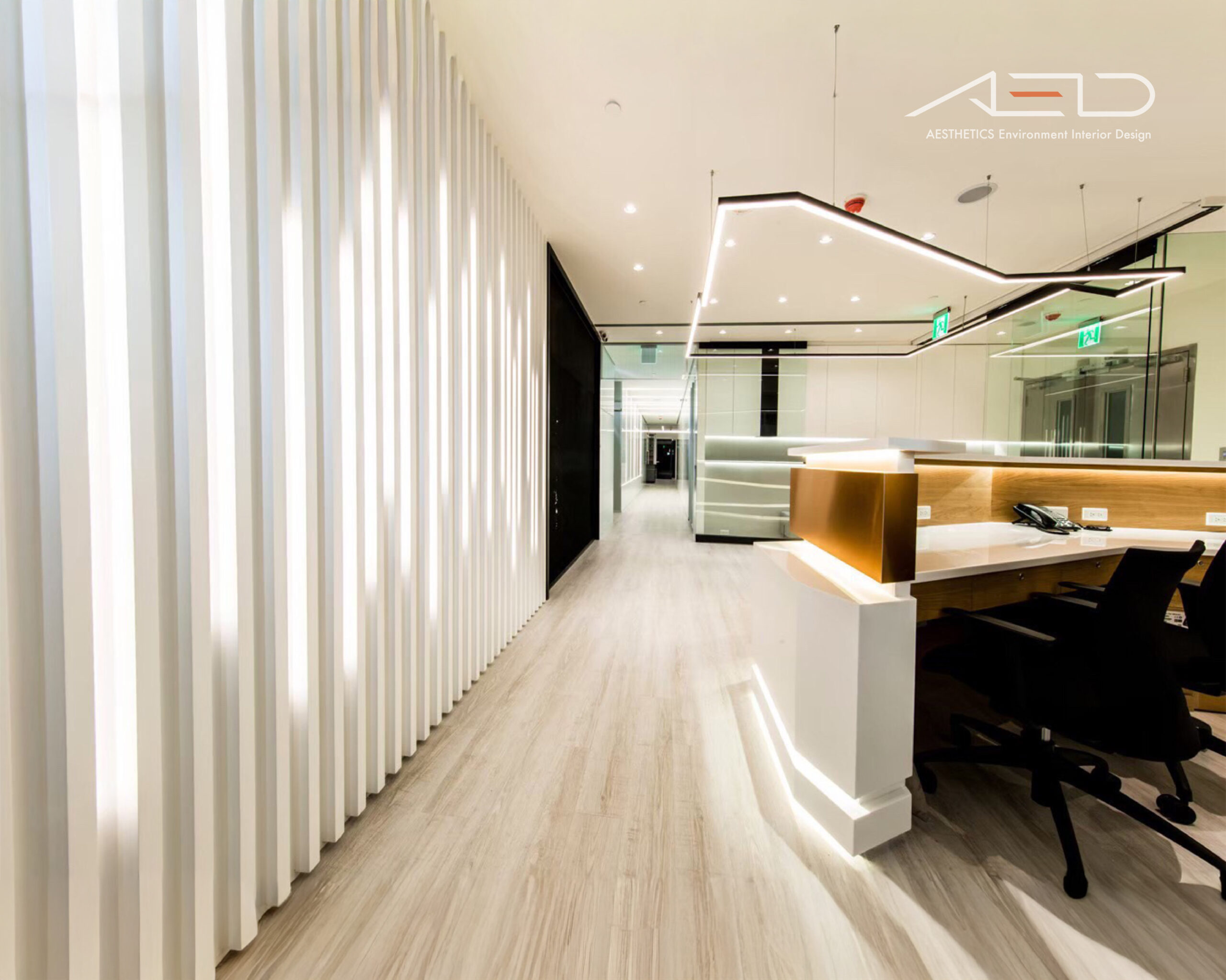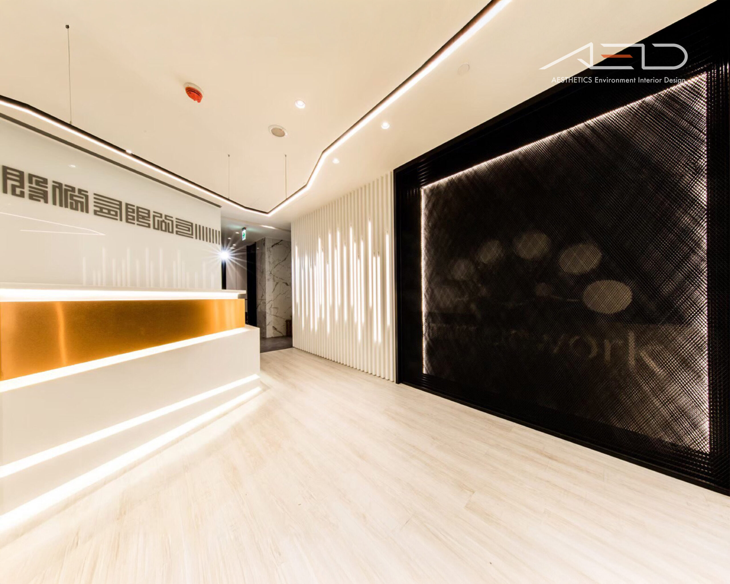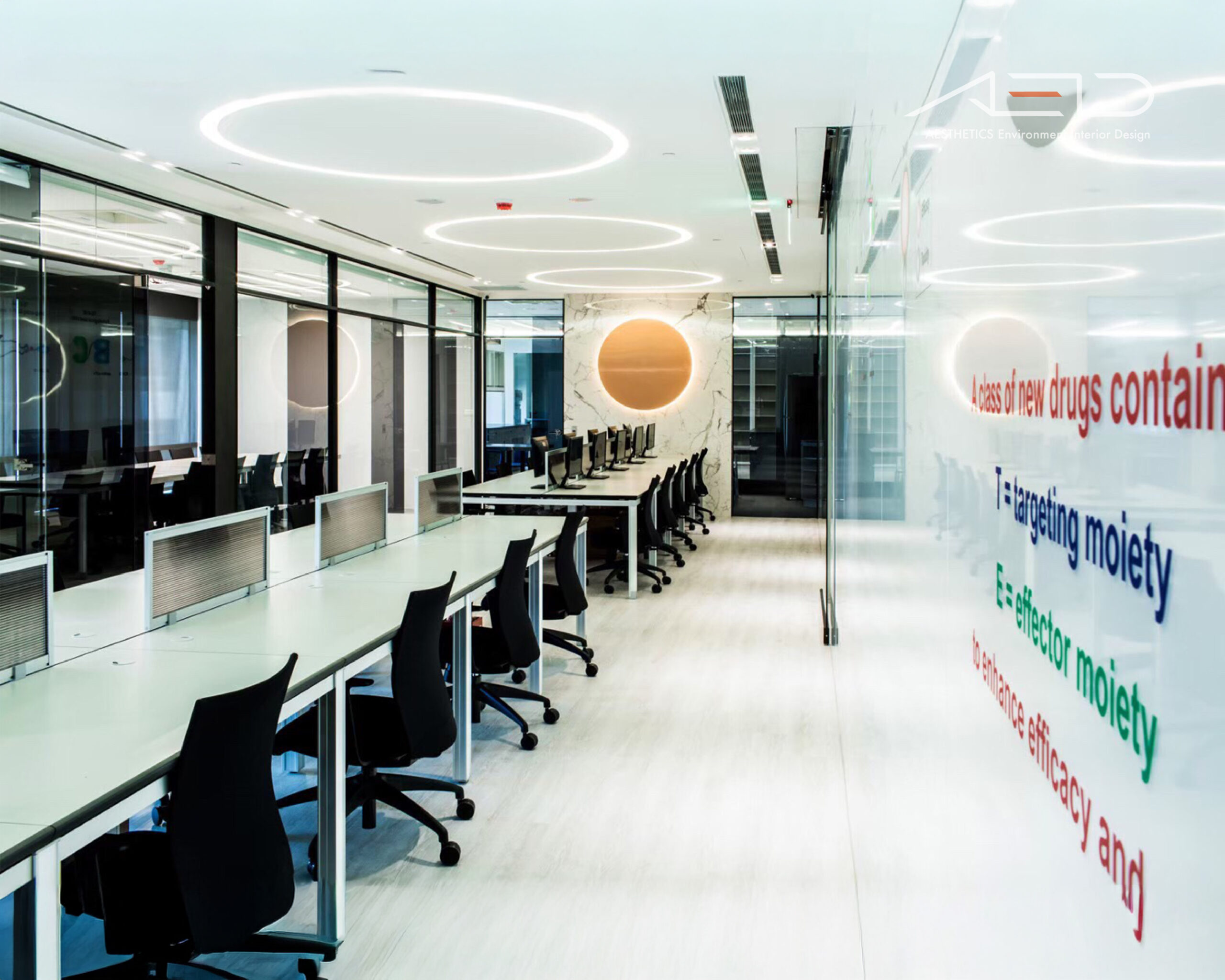 採用大片落地玻璃隔間,大量引進自然光線營造優閒的舒適感,藉由灰玻璃及清玻璃交錯配置的反射及穿透特性讓天花板光源相互交錯融合,並以業主企業圖騰導入設計讓空間更添話題。
