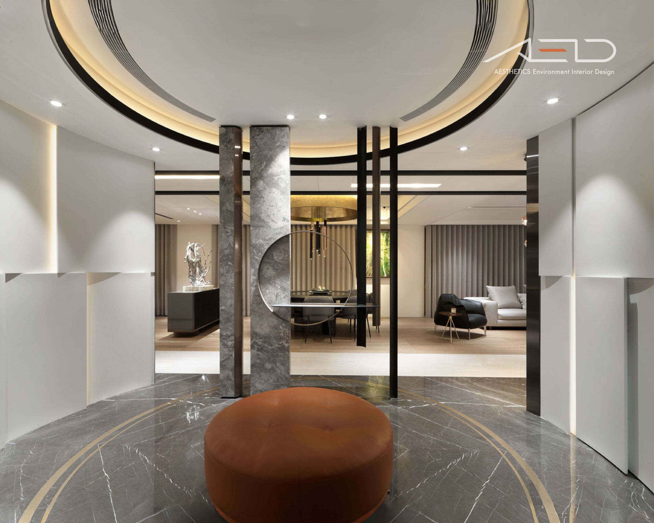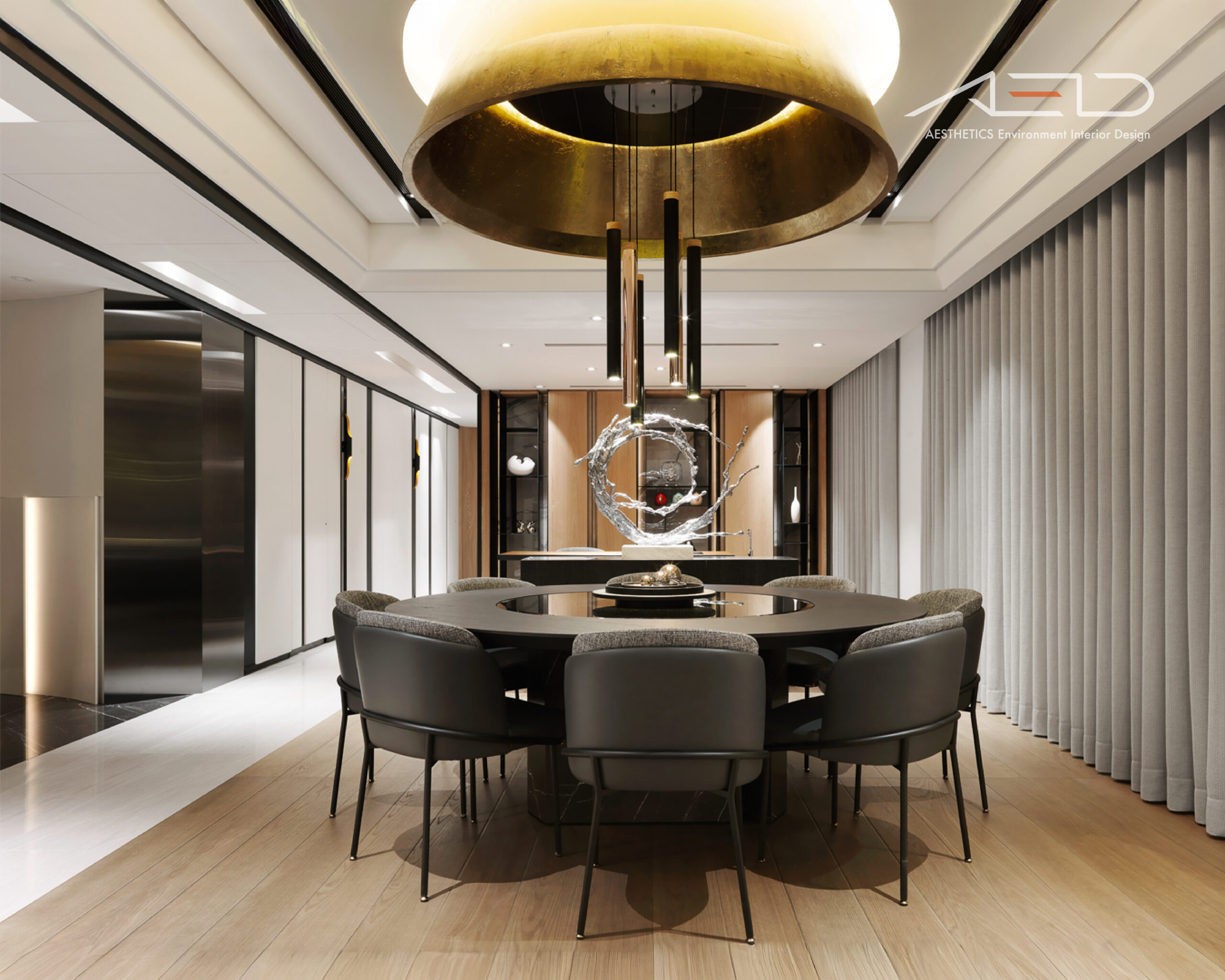 運用大氣底蘊的廳堂,透過大片落地窗,將窗外觀音山的綠意盎然景象帶入室內,營造明亮寬敞氛圍外更放大視覺感受,視線與光影巧妙在空間連成一氣,擺脫大坪數豪宅的清冷調性,增添幾分人文暖意。