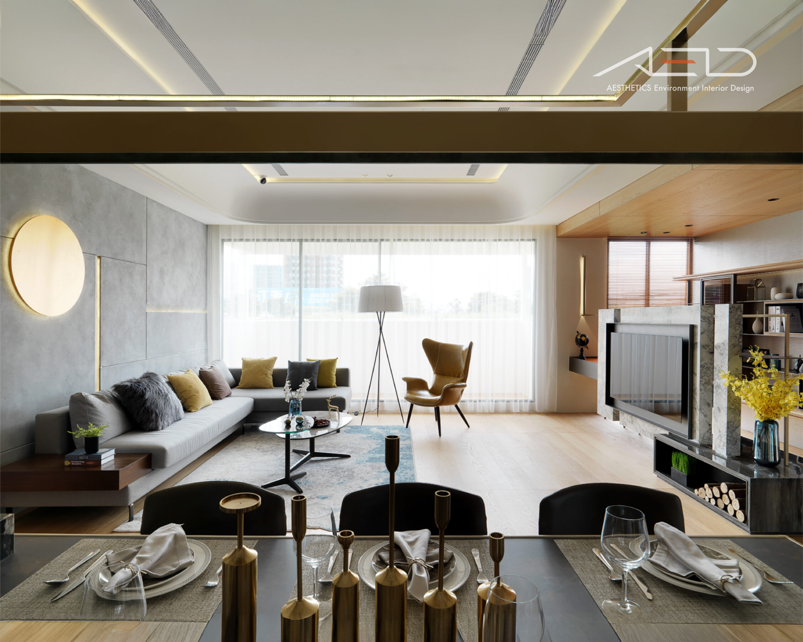 Inspired by the idea of three generations living in harmony—reunion and well-being—the designer subtly incorporates circular elements throughout the space. These forms symbolize unity, togetherness, and familial connection.