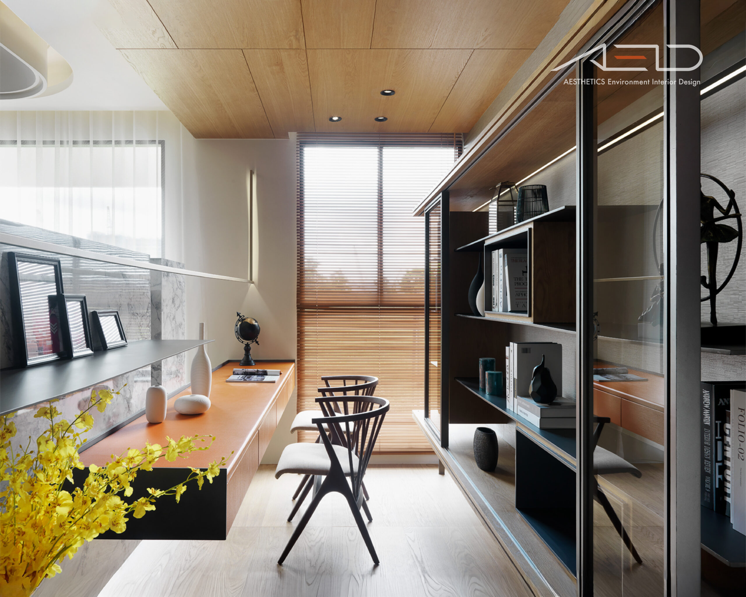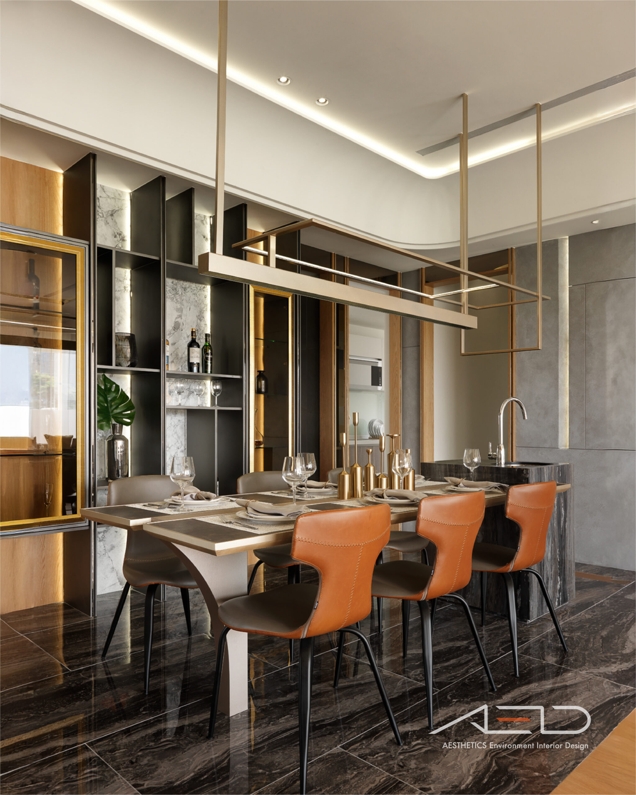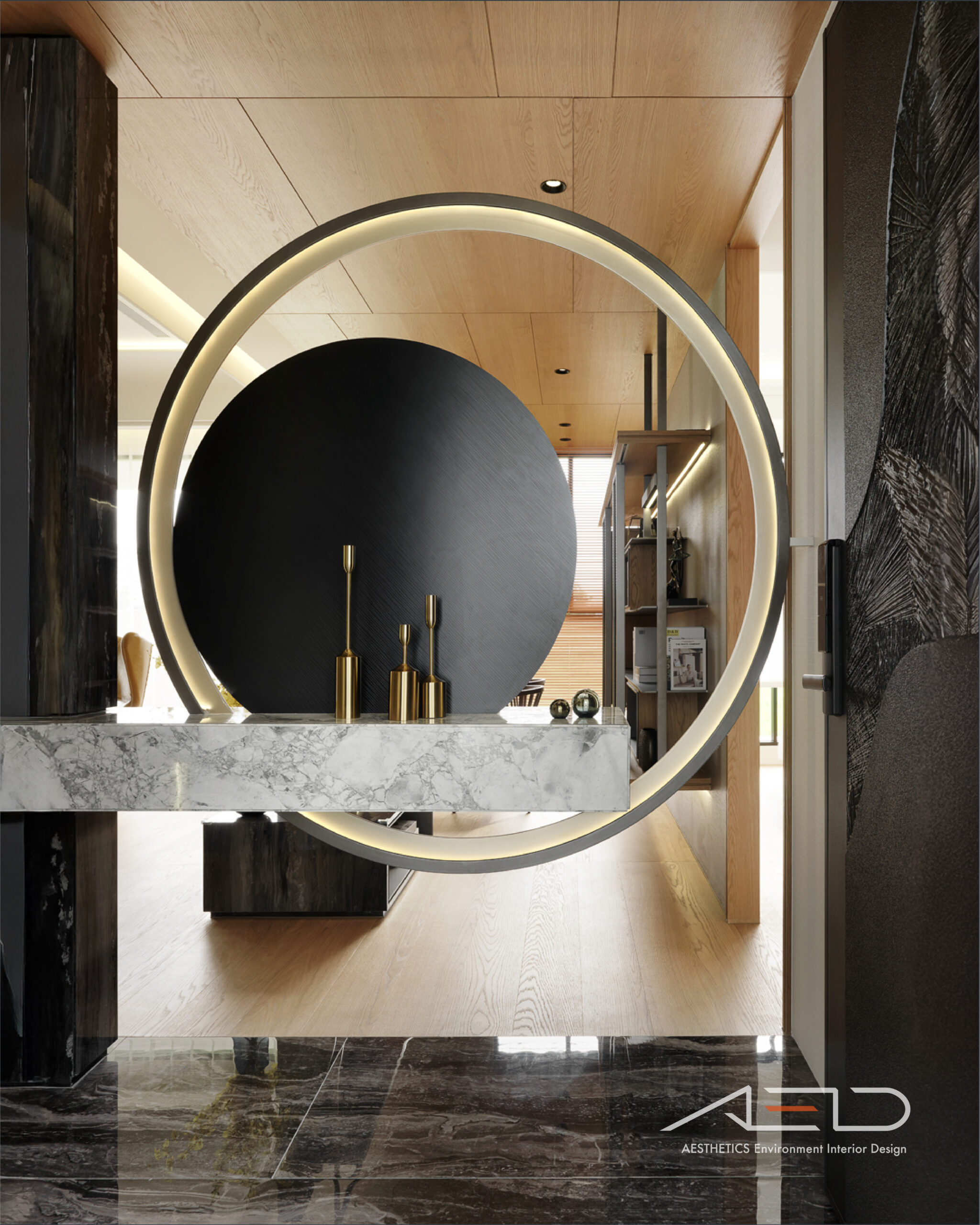 Warm wood tones and marble textures create a sense of grandeur and spatial generosity.