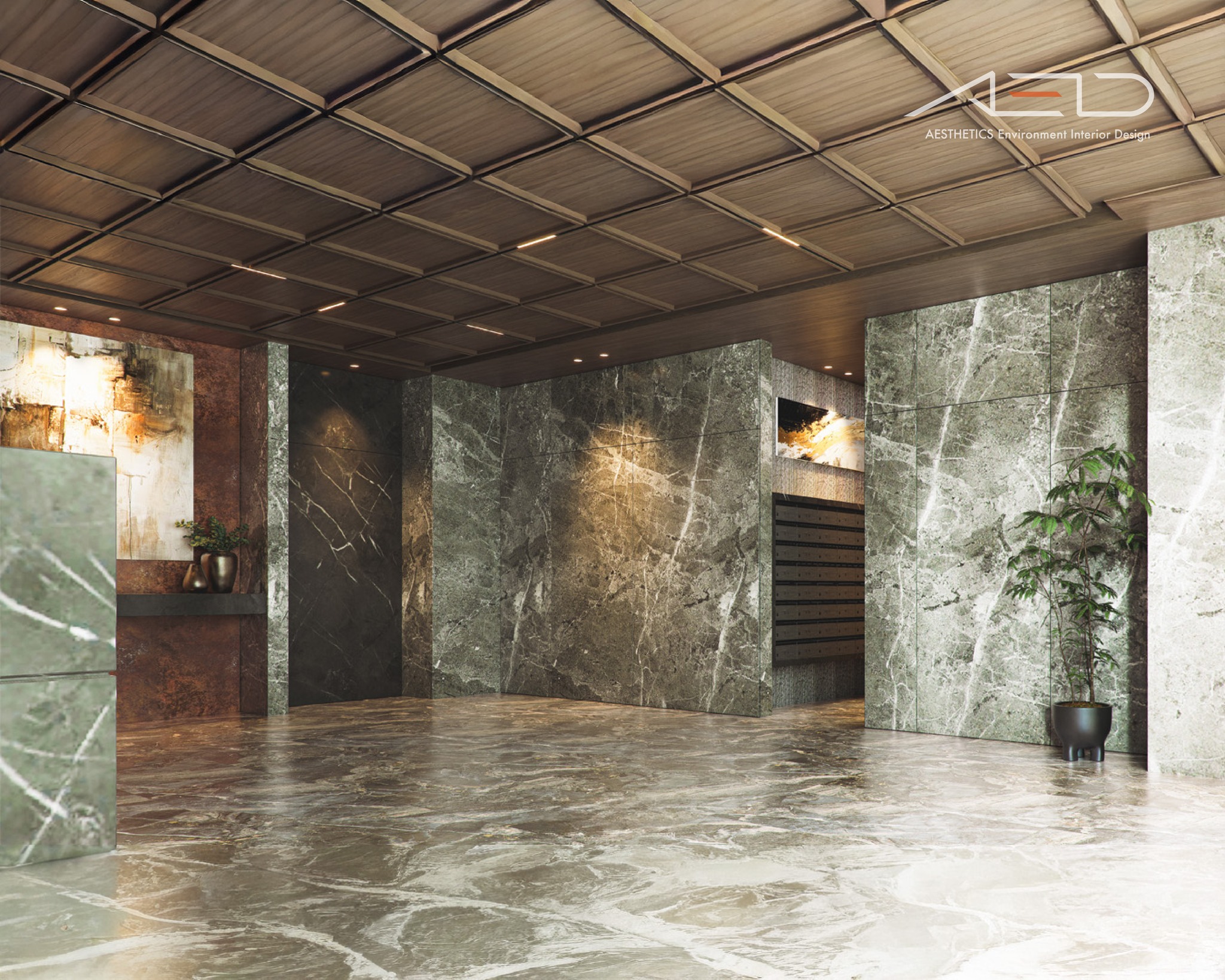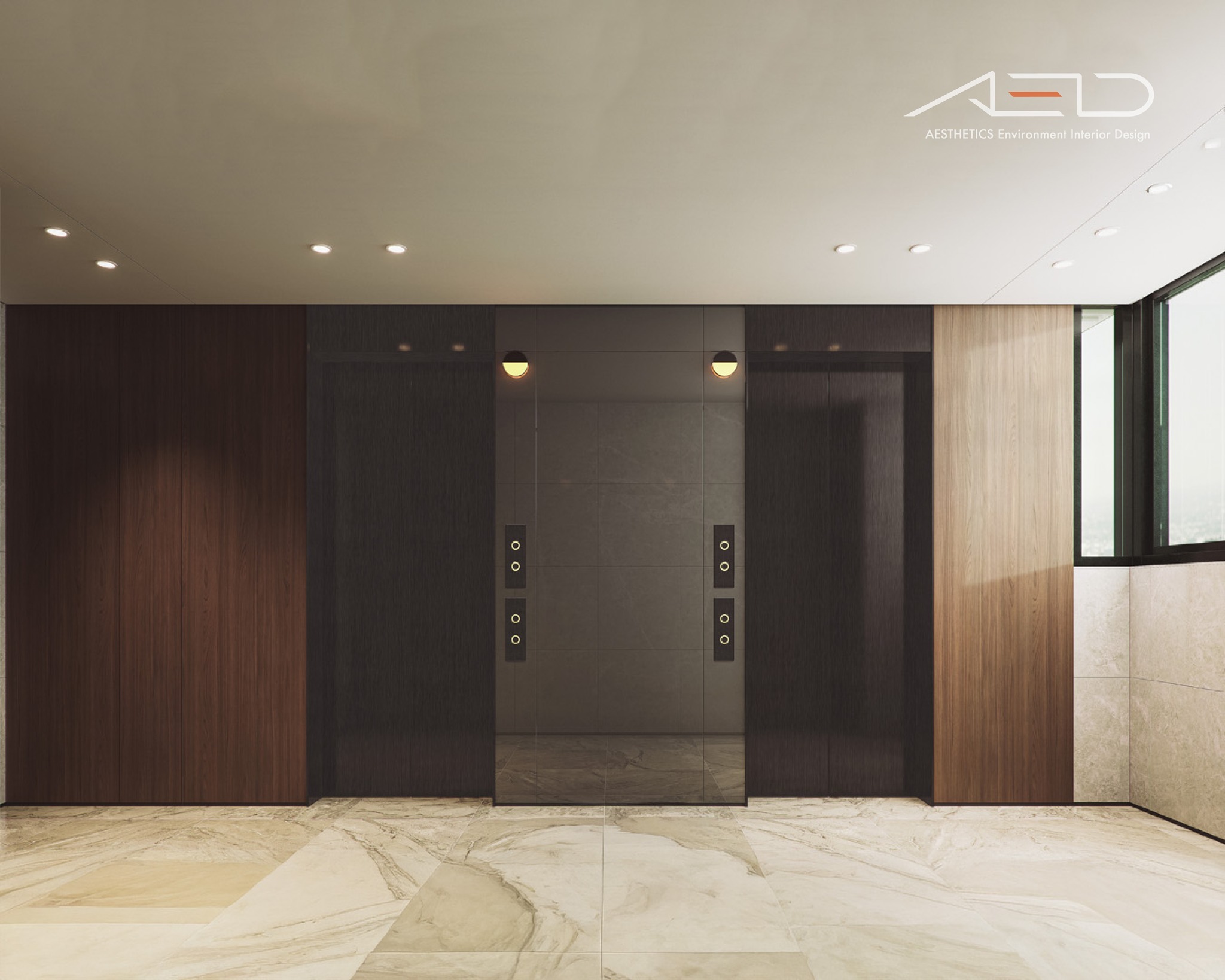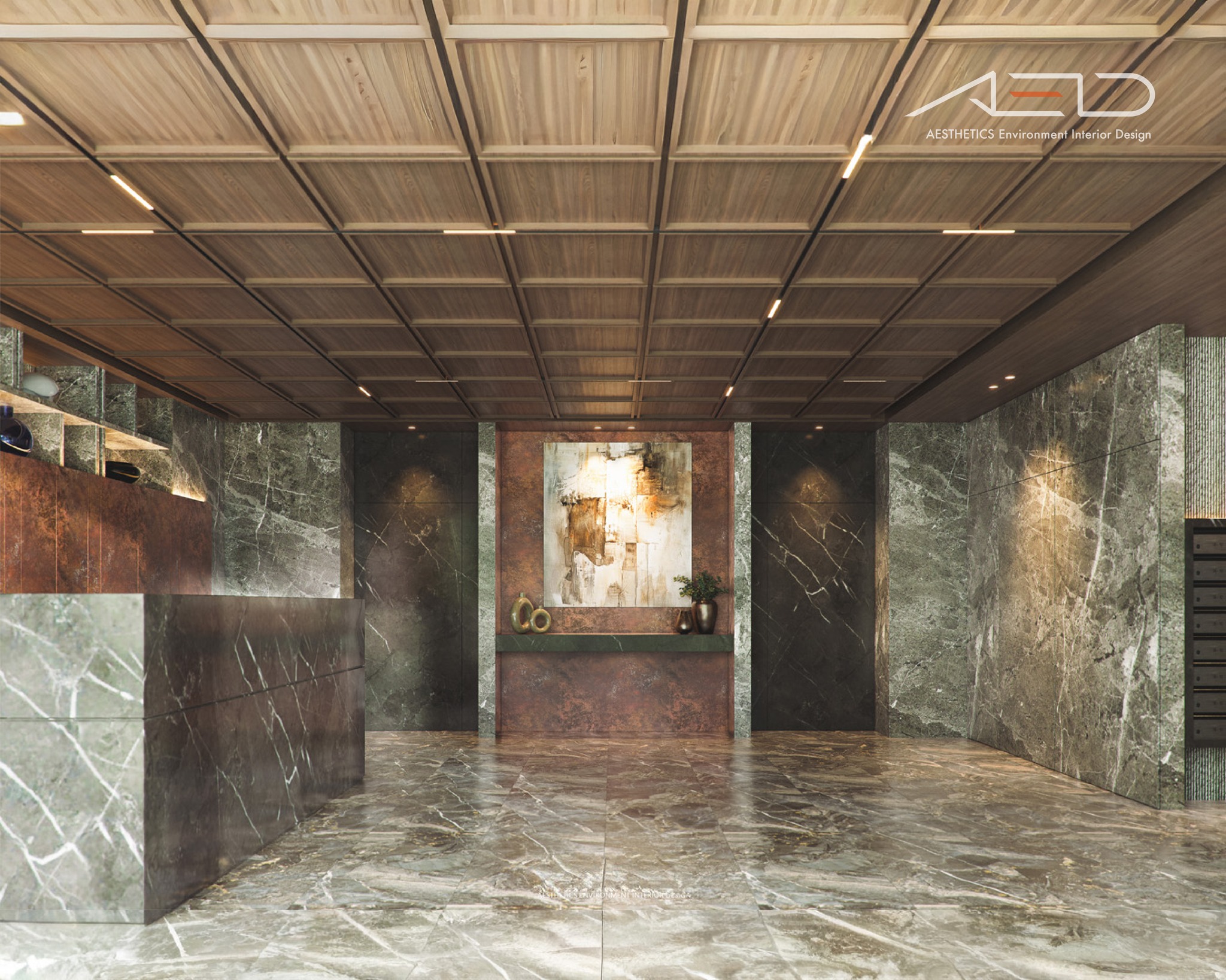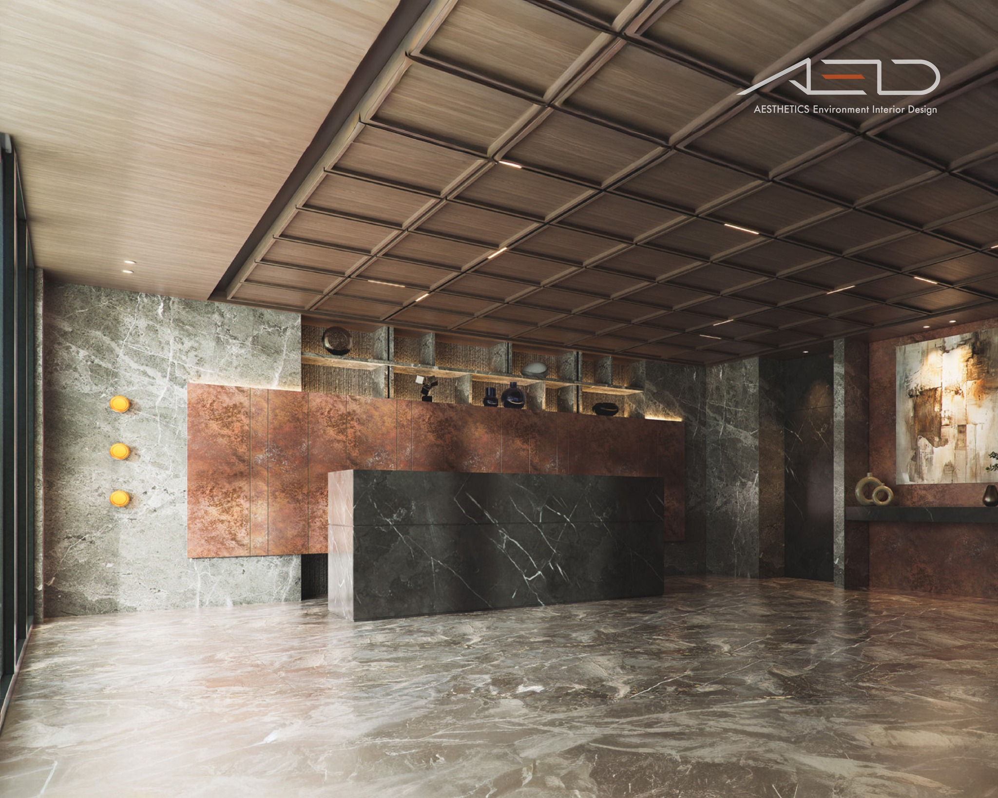 The warmth of natural wood veneer pairs with the timeless elegance of marble,accented by curated artworks—creating a welcoming hall that balances human warmth with contemporary refinement.