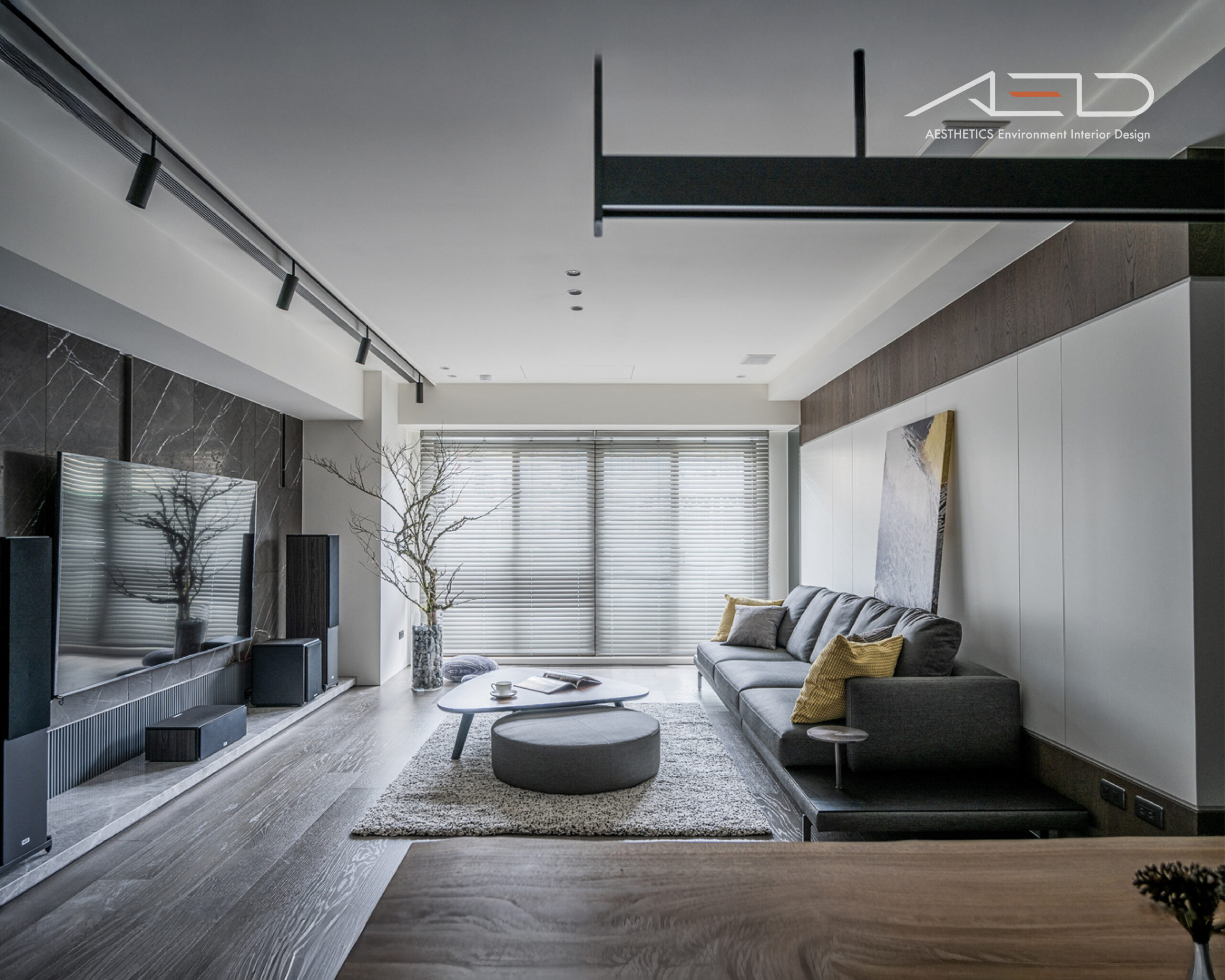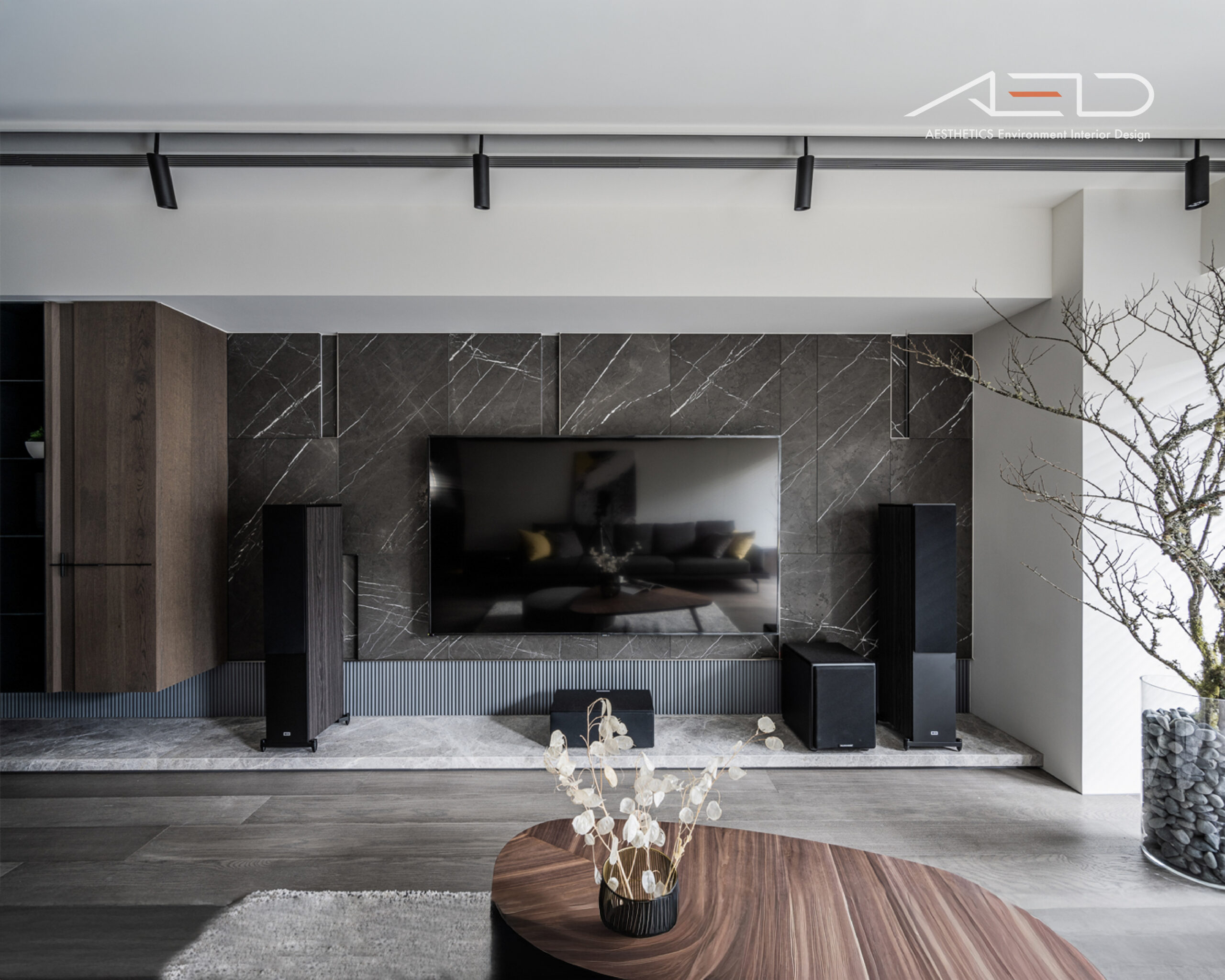 空間拒絕過多裝飾和繁複設計,電視牆面使用大面積深松柏大理石,搭配地面米灰色木皮地板,強調沉穩內斂態度。