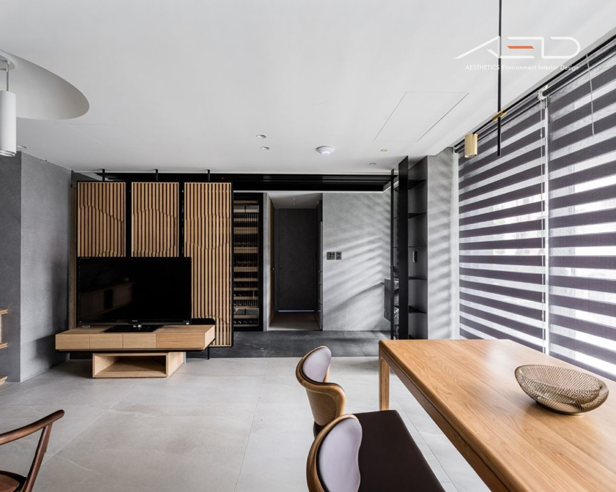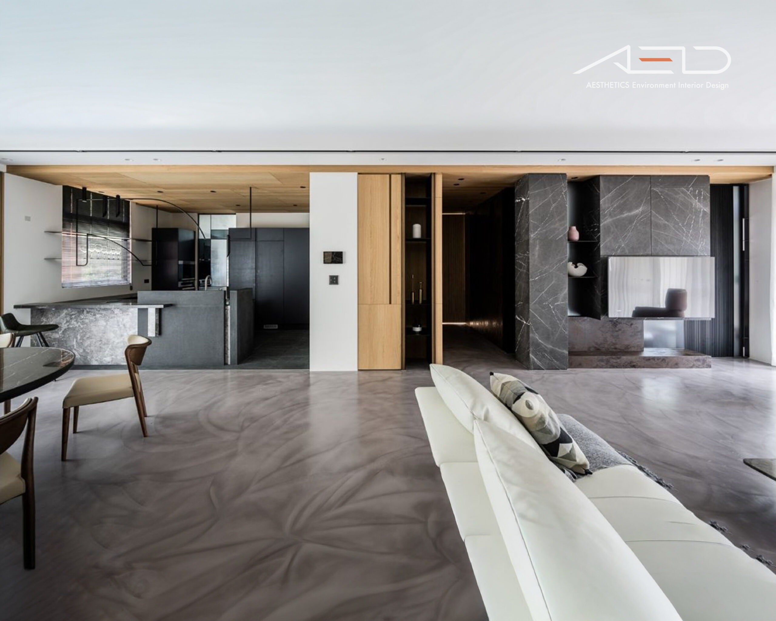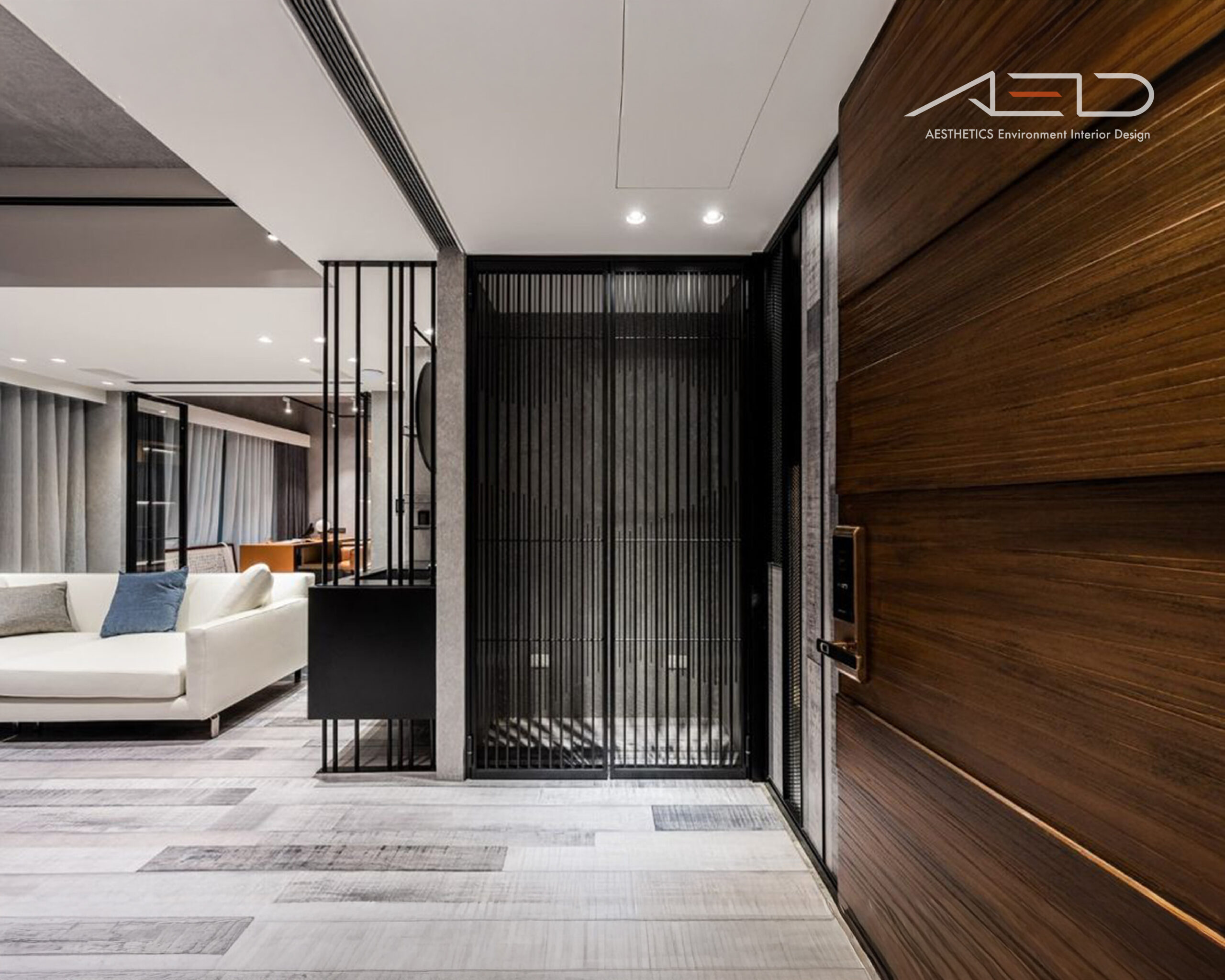 Black and gray tones are paired with natural white oak flooring to define zones and circulation. The interwoven gray wood textures echo the brown-toned wood feature walls, creating a harmonious dialogue between contrasting materials.