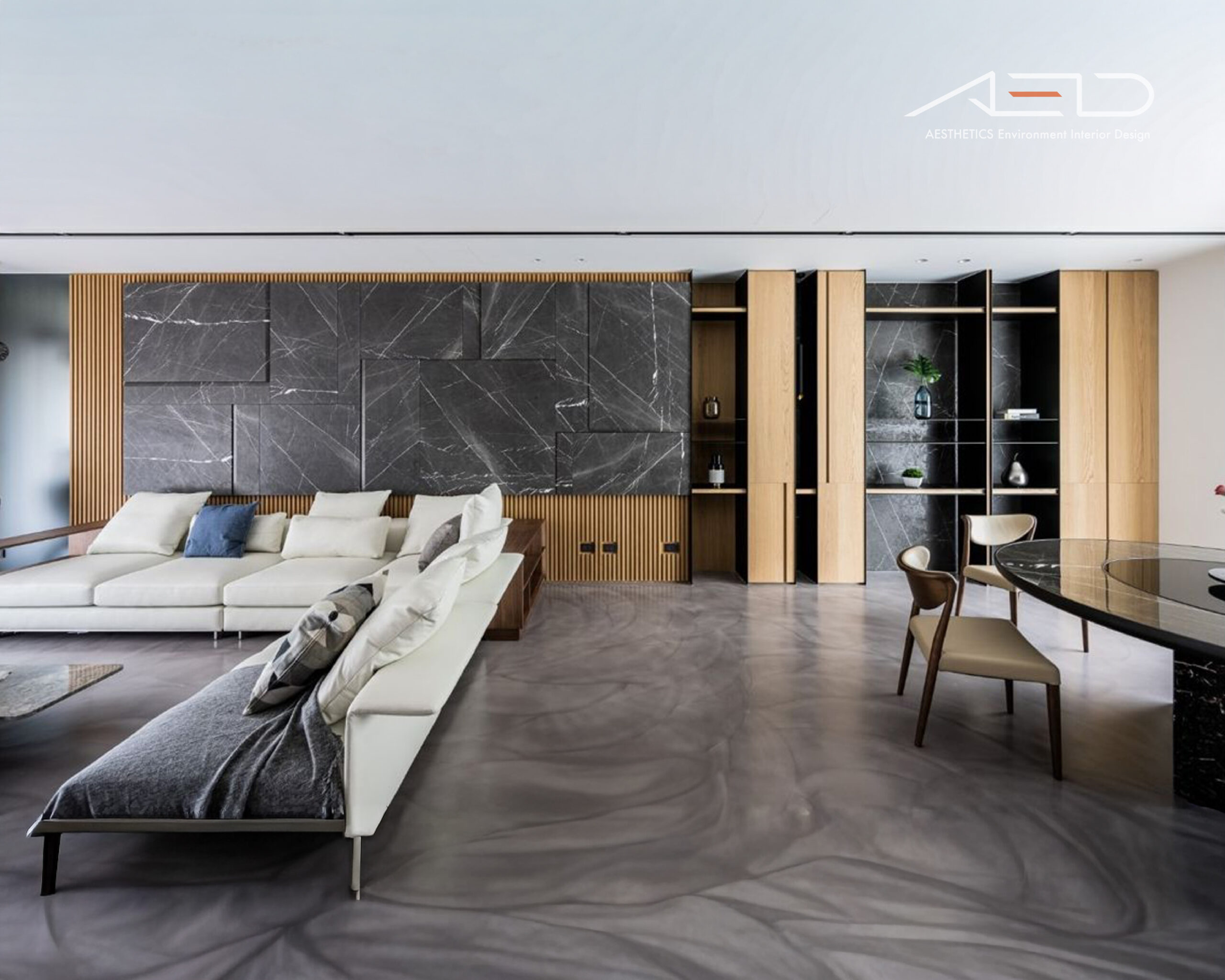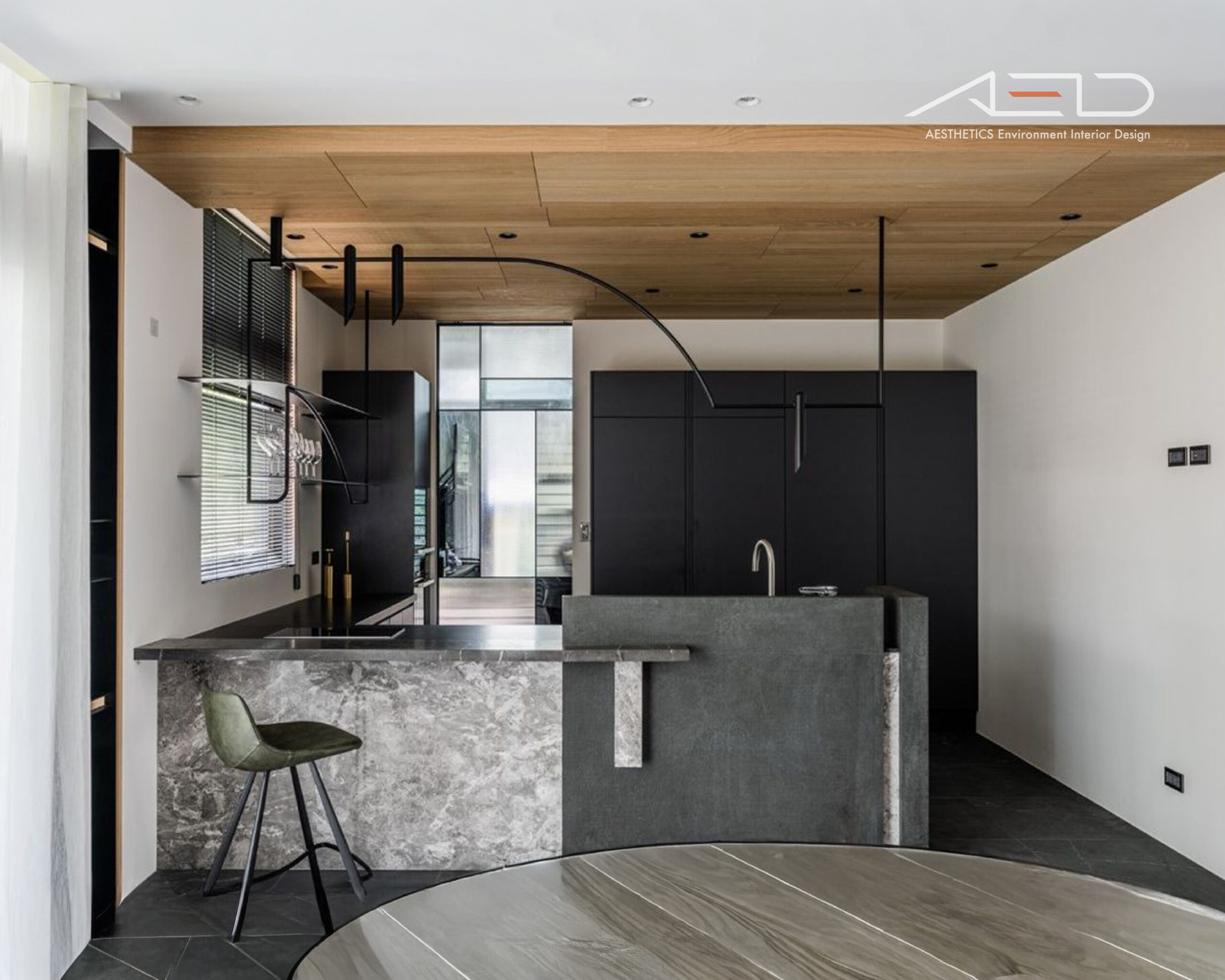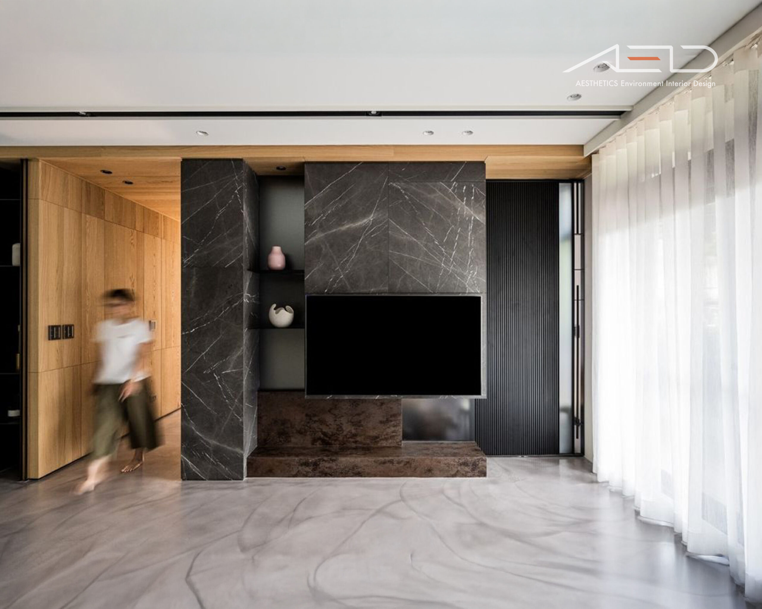 Black and gray tones are paired with natural white oak flooring to define zones and circulation. The interwoven gray wood textures echo the brown-toned wood feature walls, creating a harmonious dialogue between contrasting materials.