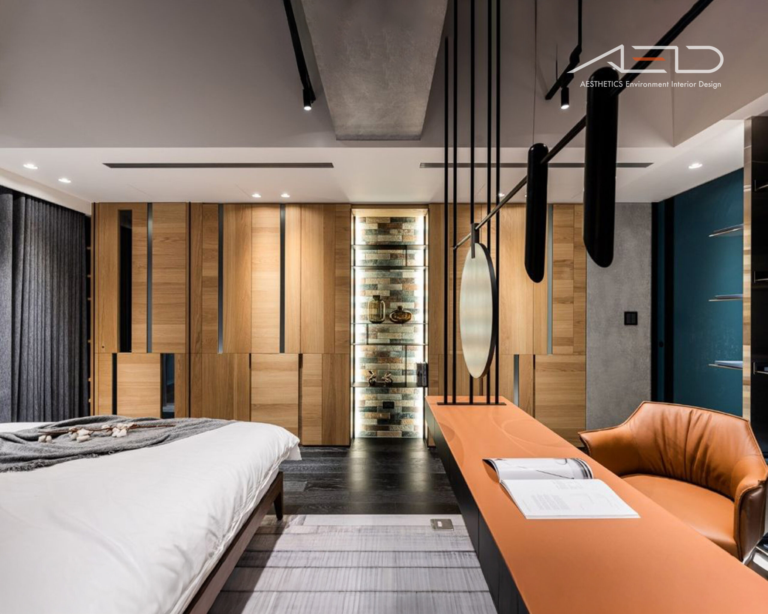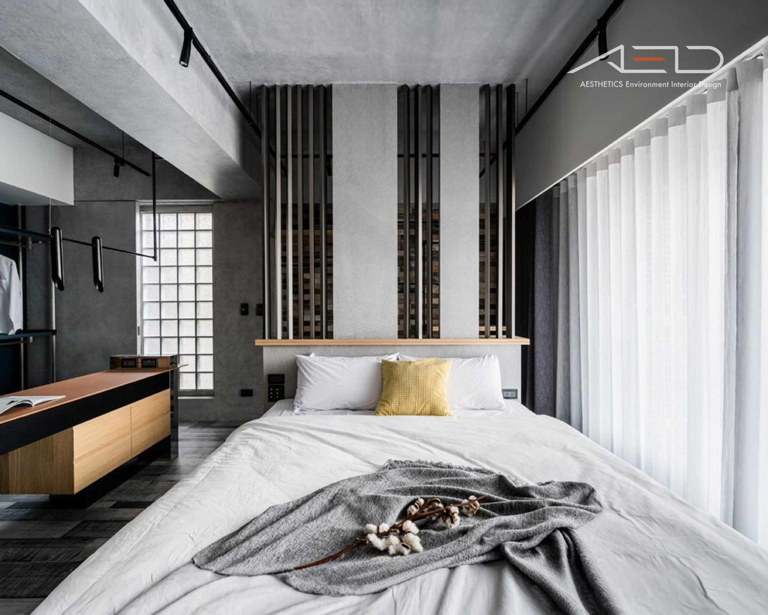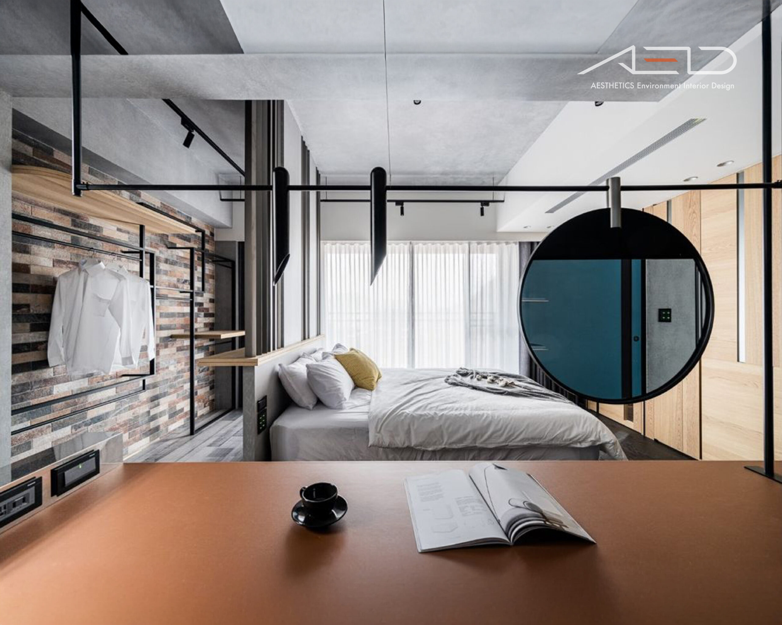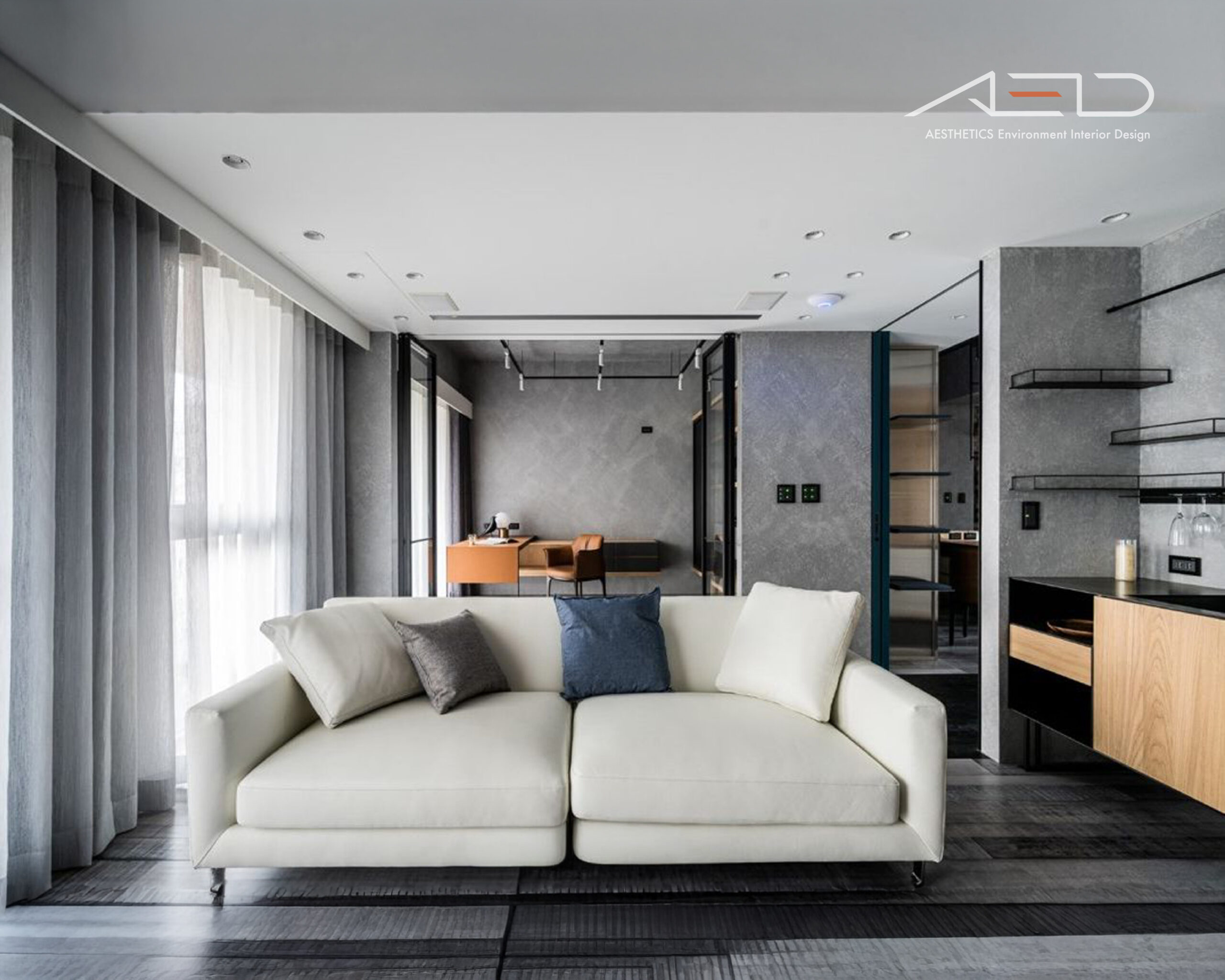 The TV feature wall incorporates rust-finished metal to reinforce the industrial character. The rusted panels are diagonally cut to interact with incoming light, generating dynamic shadow lines that enhance visual depth within the monochromatic palette. As the rust naturally evolves over time, it embodies the concept of “the passage of time,” symbolizing the intimate relationship between the home and the flow of living.