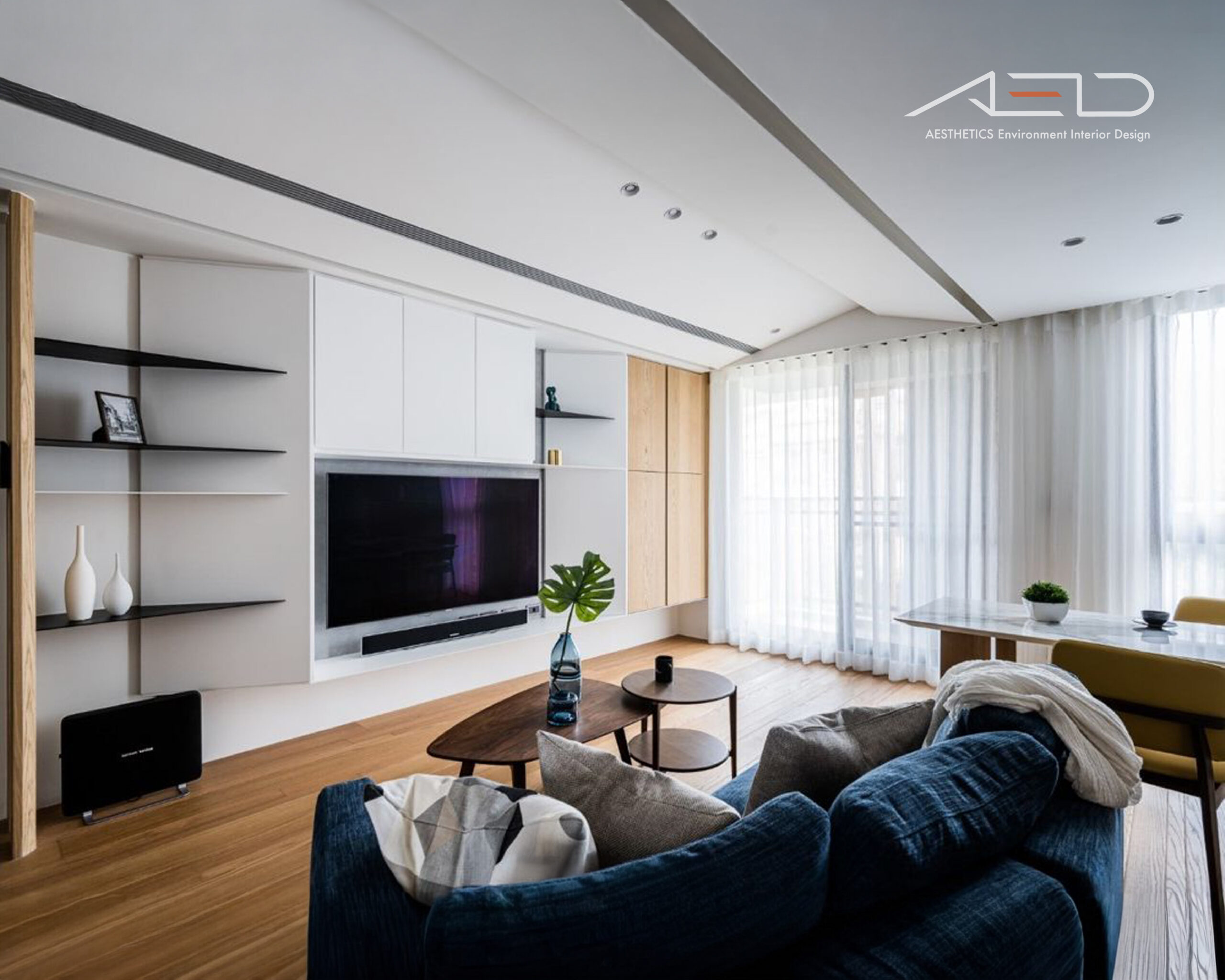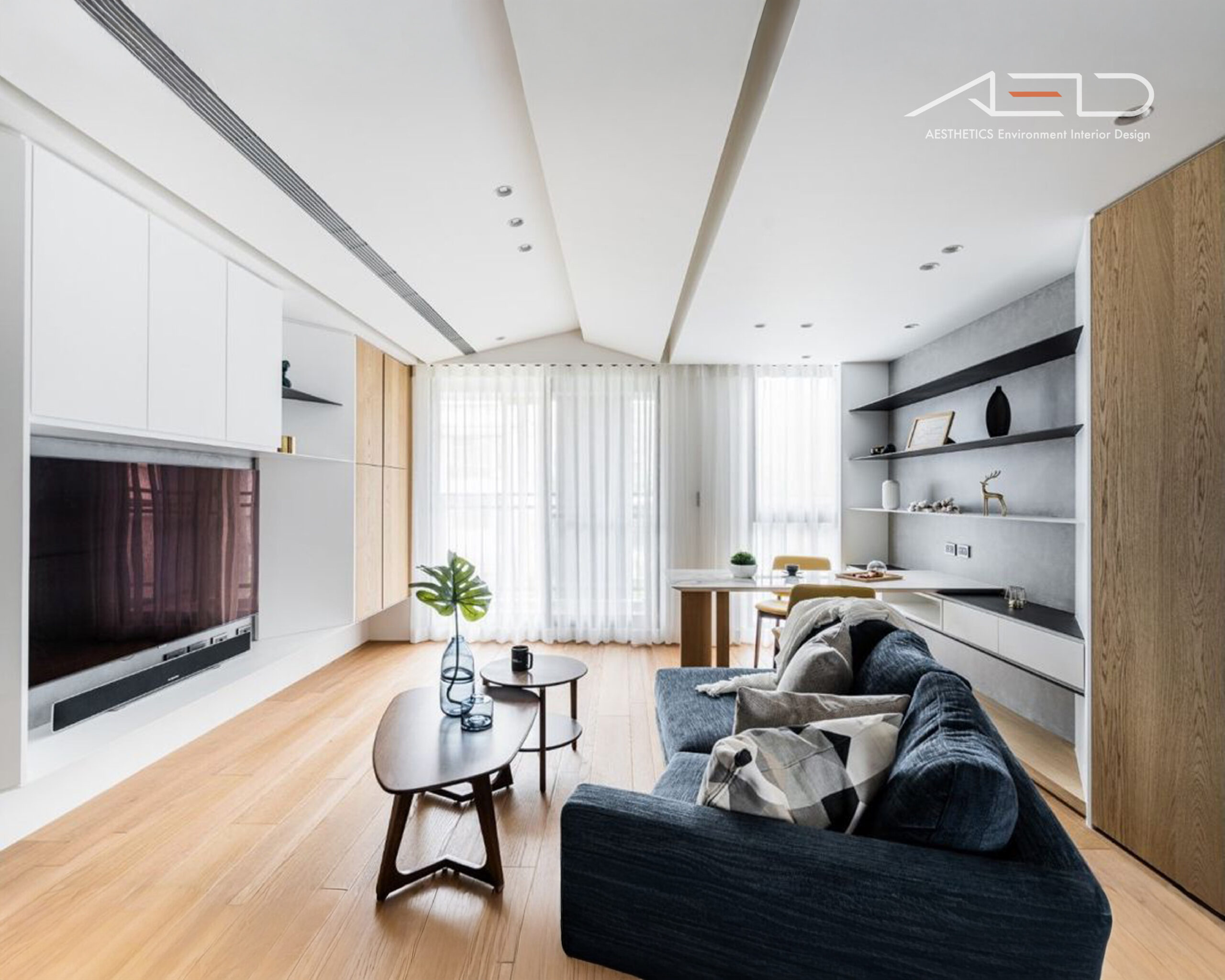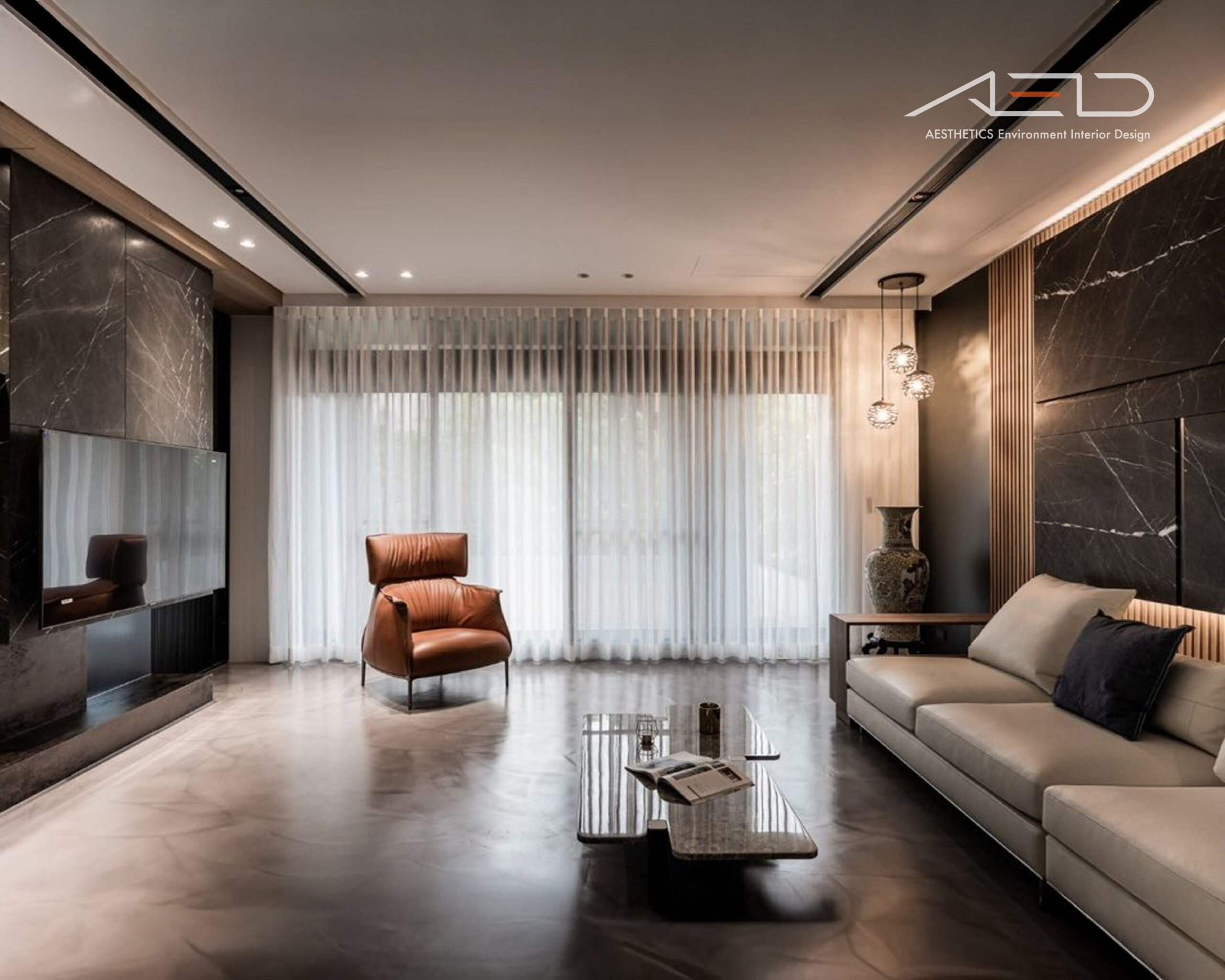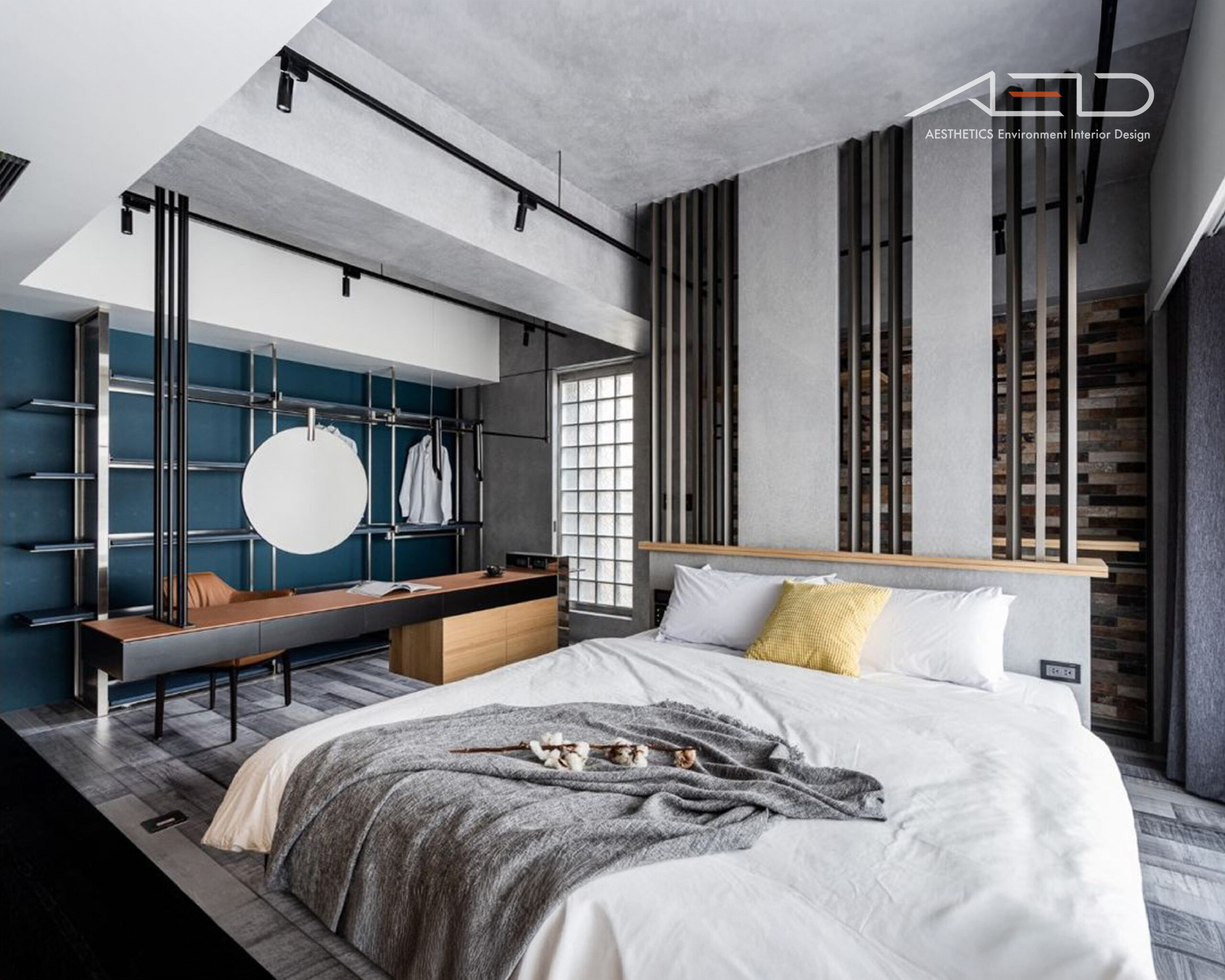 The TV feature wall incorporates rust-finished metal to reinforce the industrial character. The rusted panels are diagonally cut to interact with incoming light, generating dynamic shadow lines that enhance visual depth within the monochromatic palette. As the rust naturally evolves over time, it embodies the concept of “the passage of time,” symbolizing the intimate relationship between the home and the flow of living.