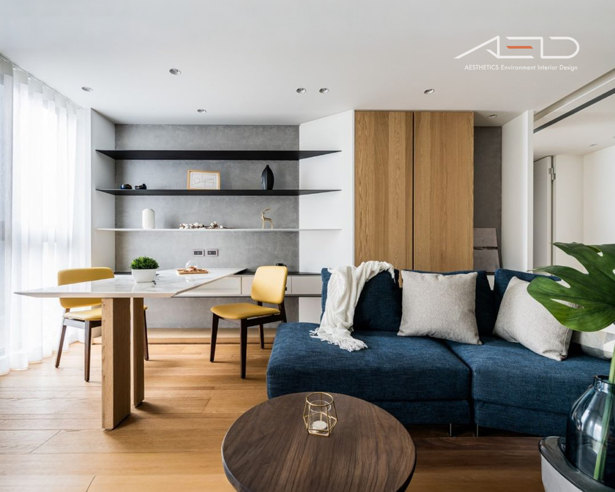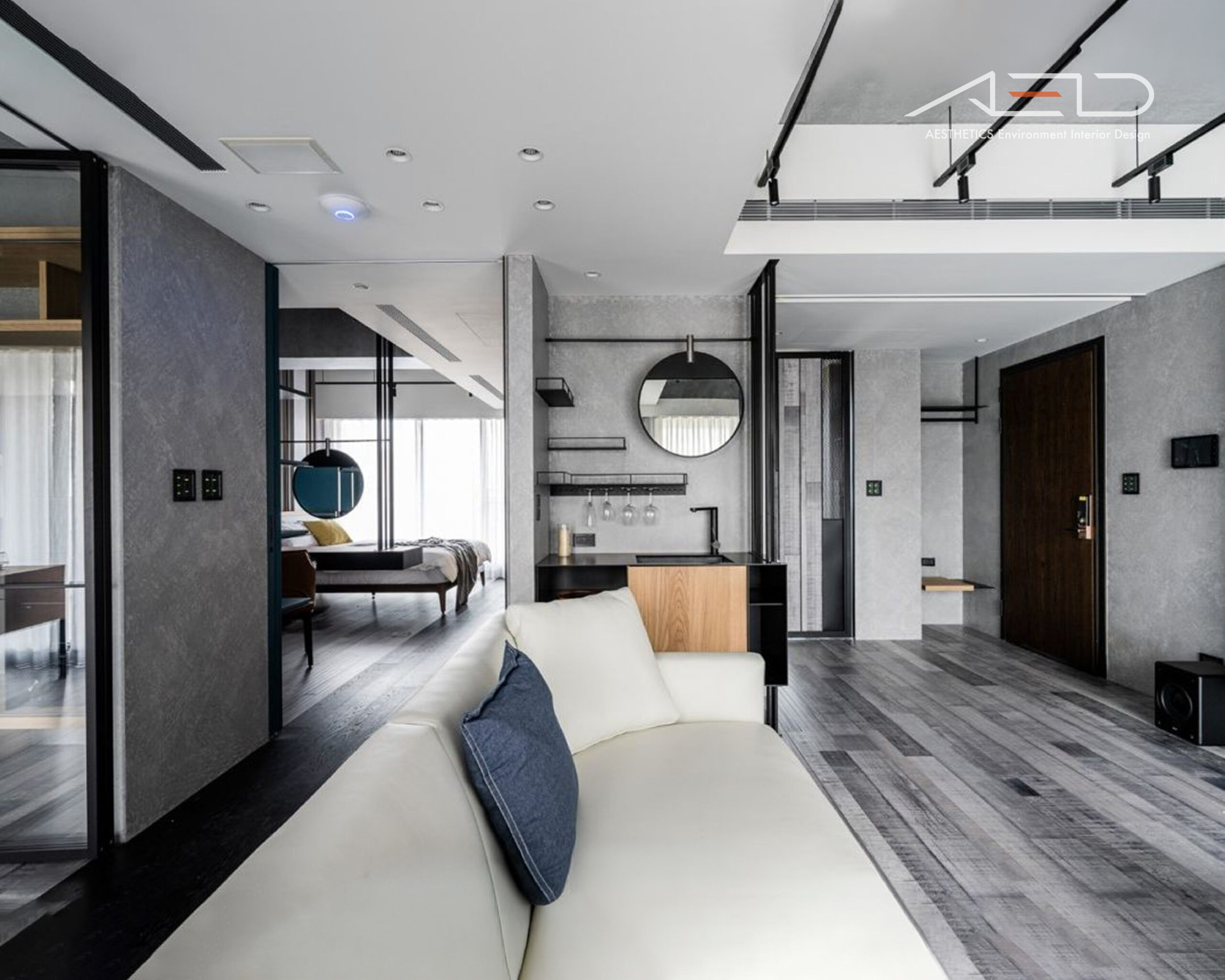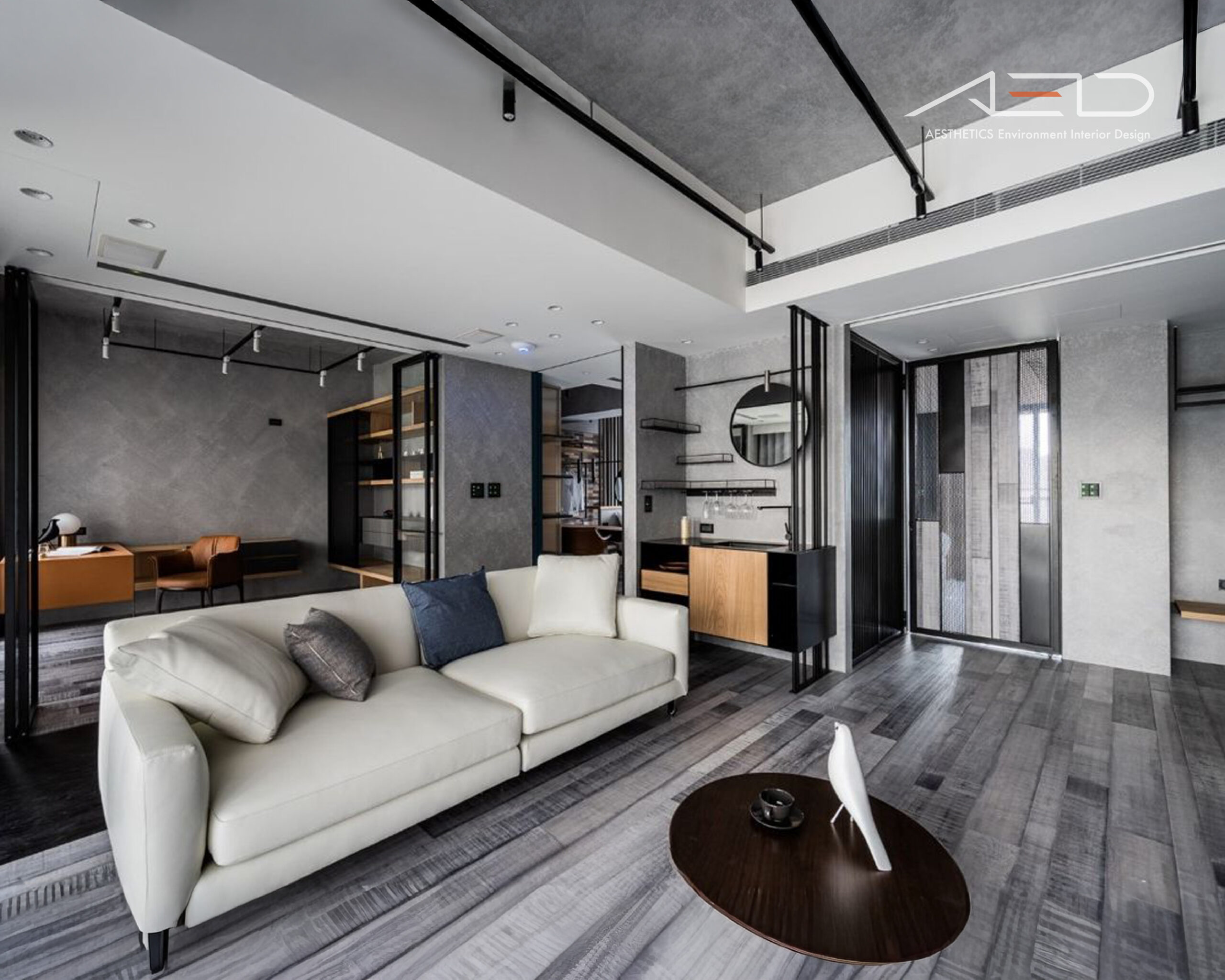 全屋以工業風格做為設計核心,因考量到住宅空間的機能性與整體住屋氛圍,故多以現代家居元素調和工業風的剛烈特性,選用黑階灰階天然白橡木板地坪劃分場域並界定空間動線,使灰階交錯的木質地坪延伸與的棕色系木質交錯牆面呼應,形成異材質和諧融合的景貌。